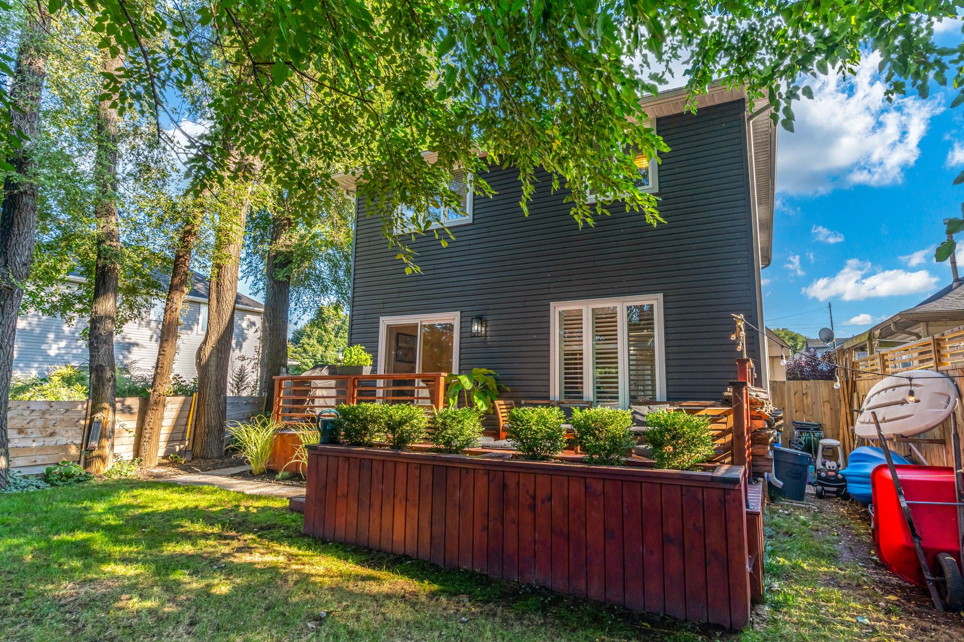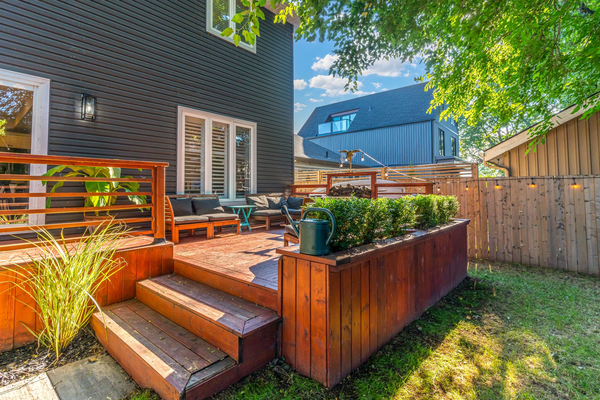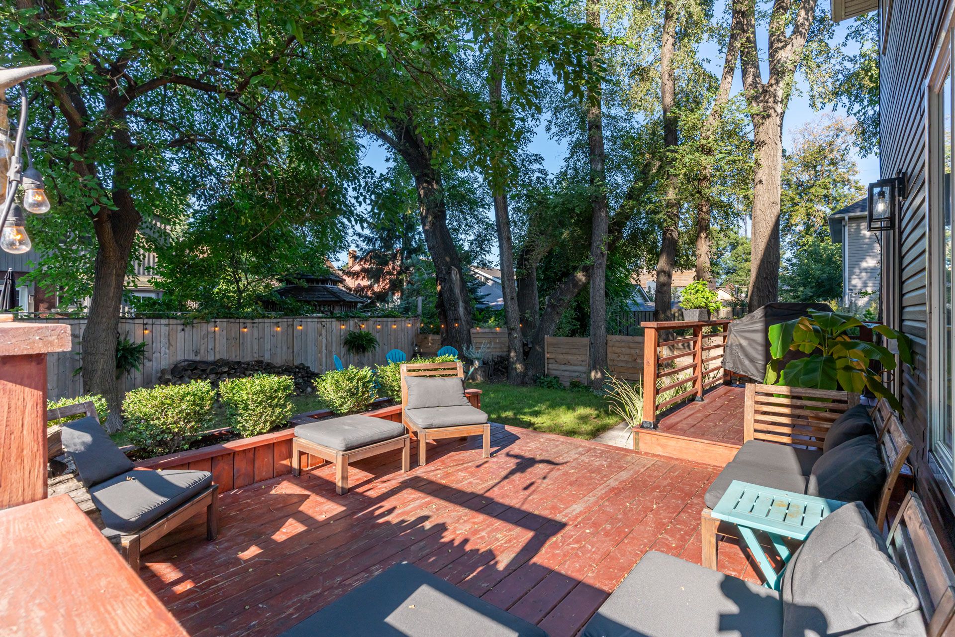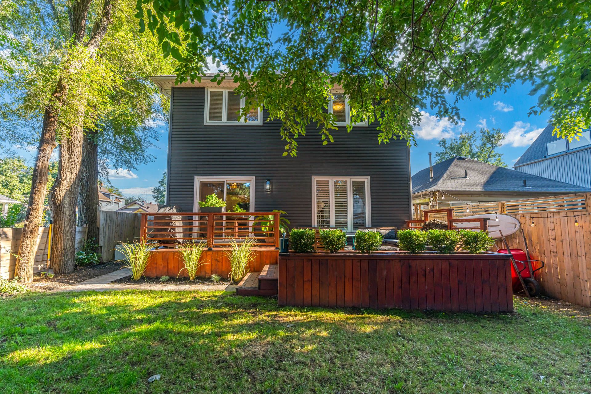 • Fully fenced backyard featuring a new two-tiered deck for outdoor enjoyment.