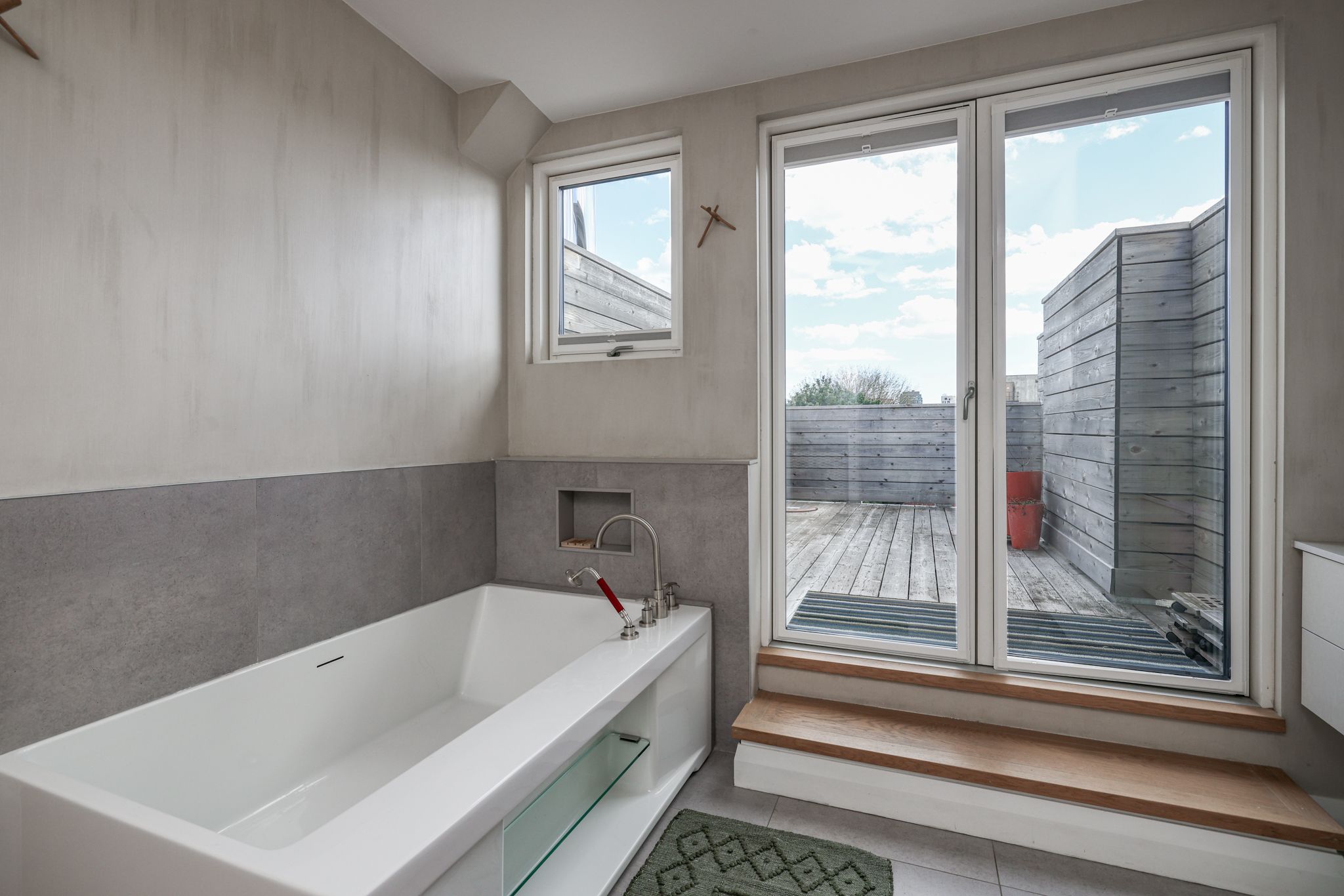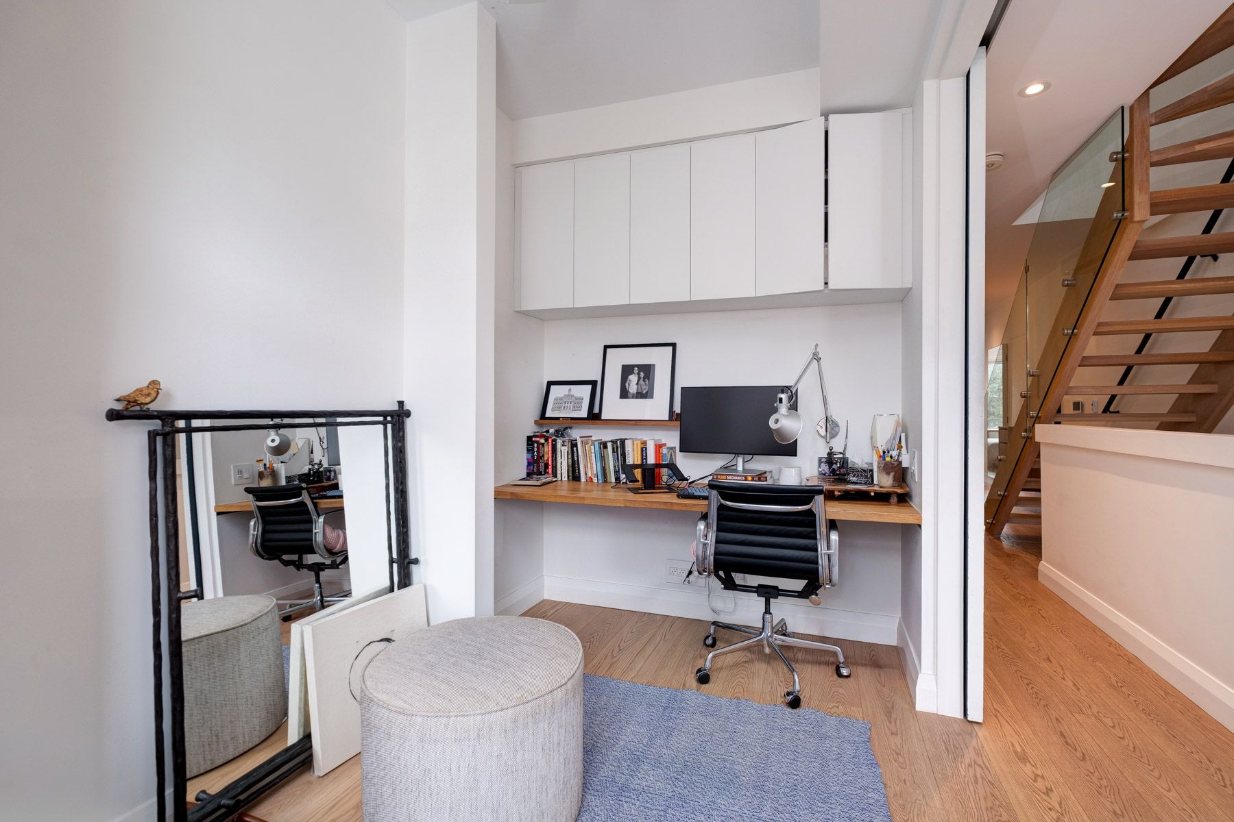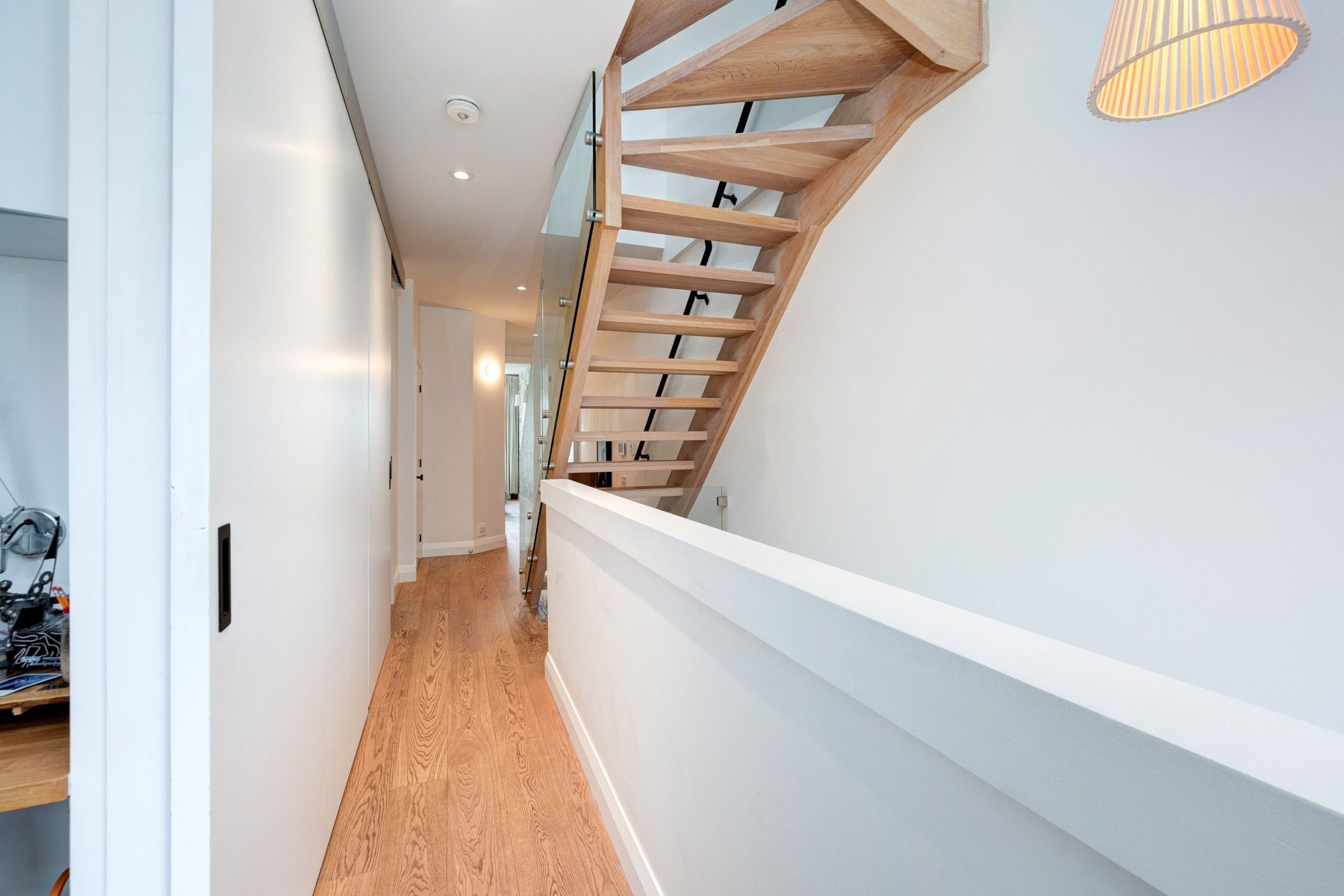 Architect-owner's exceptional four-bedroom home in the heart of beaconsfield village, offering beautifully curated living across four thoughtfully finished levels. Designed with remarkable scale and function, the home features 11-foot ceilings on the main floor, moncer hardwood flooring throughout, crisp contemporary finishes, soundproofed party walls, and extensive custom cabinetry and storage at every turn. A generous foyer with built-in bench seating and storage opens into elegant principal rooms designed for everyday living and entertaining. At the centre of the home, the custom kitchen impresses with dekton counters and island, premium built-in appliances including a wolf cooktop, miele warming drawer, fisher & paykel wall oven and steam oven, plus exceptional integrated storage. The light-filled living room is anchored by a wood-burning stove and features a projector with remote and powered screen, with seamless access to the beautifully finished exterior. Cedar decking and fencing create a warm and cohesive outdoor setting, complemented by a propane gas hookup for easy outdoor cooking. The second floor offers flexible family living with three bedrooms or a two-bedroom plus office layout, a stunning custom four-piece bath, and sliding doors by ital door. The third-floor primary retreat is a true sanctuary with custom cabinetry, spa-inspired ensuite, built-in saunaray infrared sauna, two skylights, solar tube, and walkout to a private rooftop deck with roughed in outdoor shower. A separate contained basement apartment offers excellent flexibility for a live-in nanny, extended family, or income potential. The main house basement features in-floor heating, while infrastructure upgrades include 1-inch water service, sewer backwater valves, sump pump, and ethernet drops throughout the main house. Heated outbuilding with ac and green roof provides ideal year-round space for a home office, gym, studio, or additional living area.