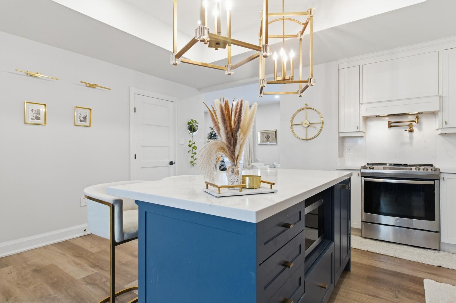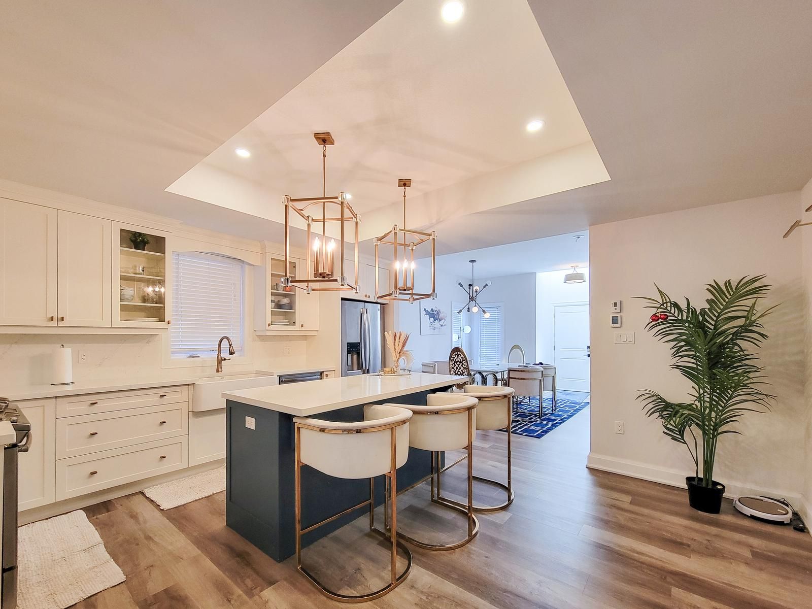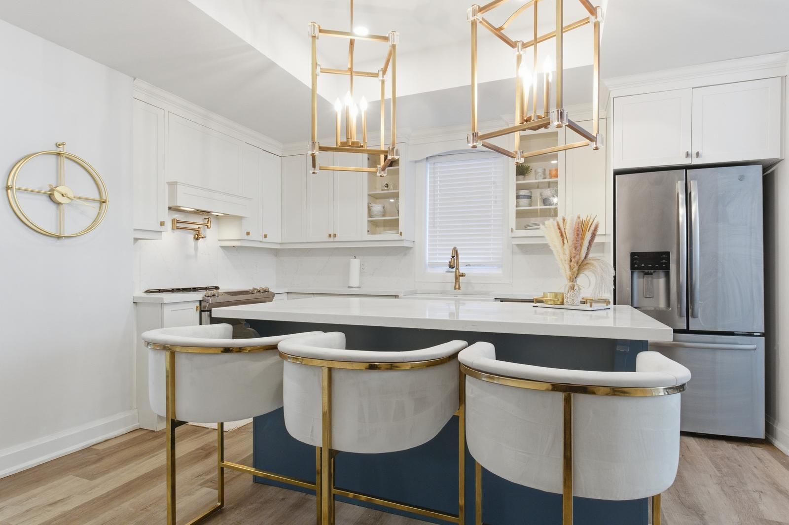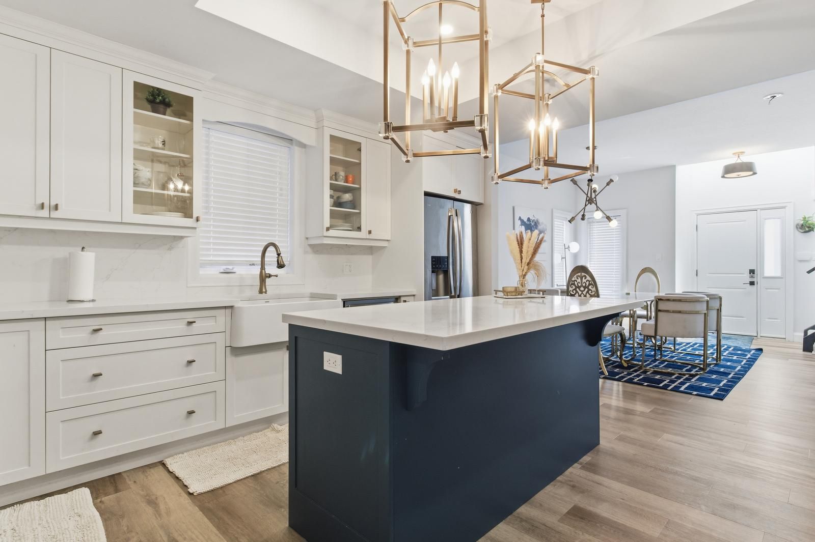 • Modern open-concept kitchen with quartz finishes and stainless steel appliances.