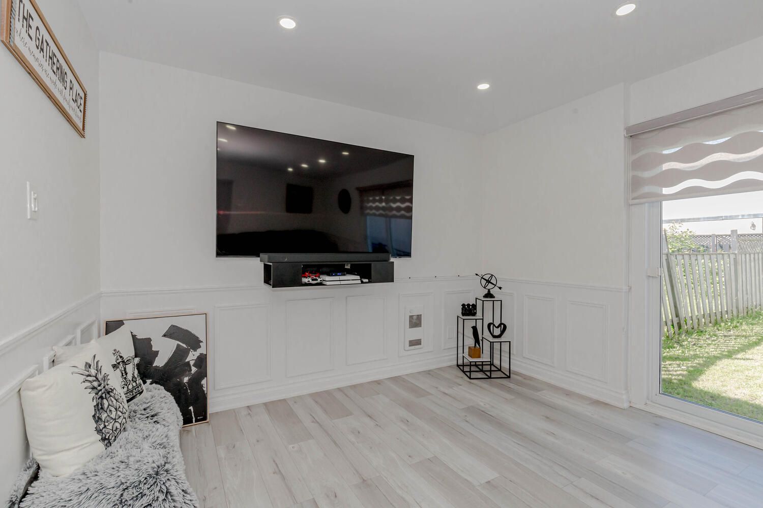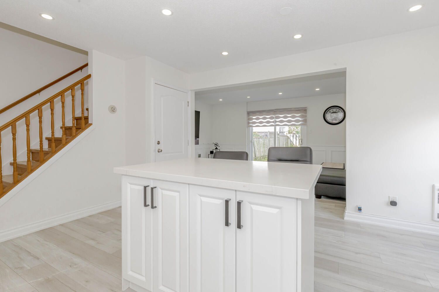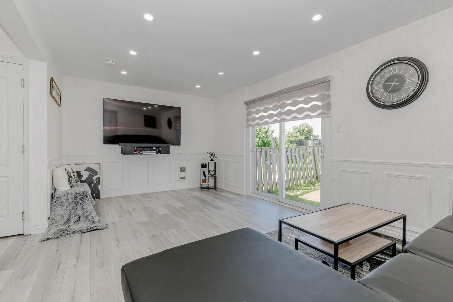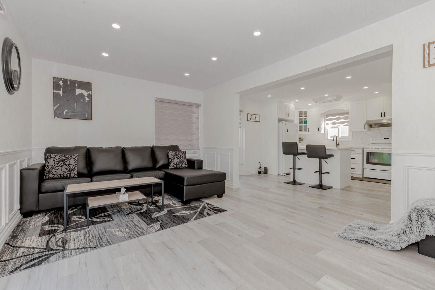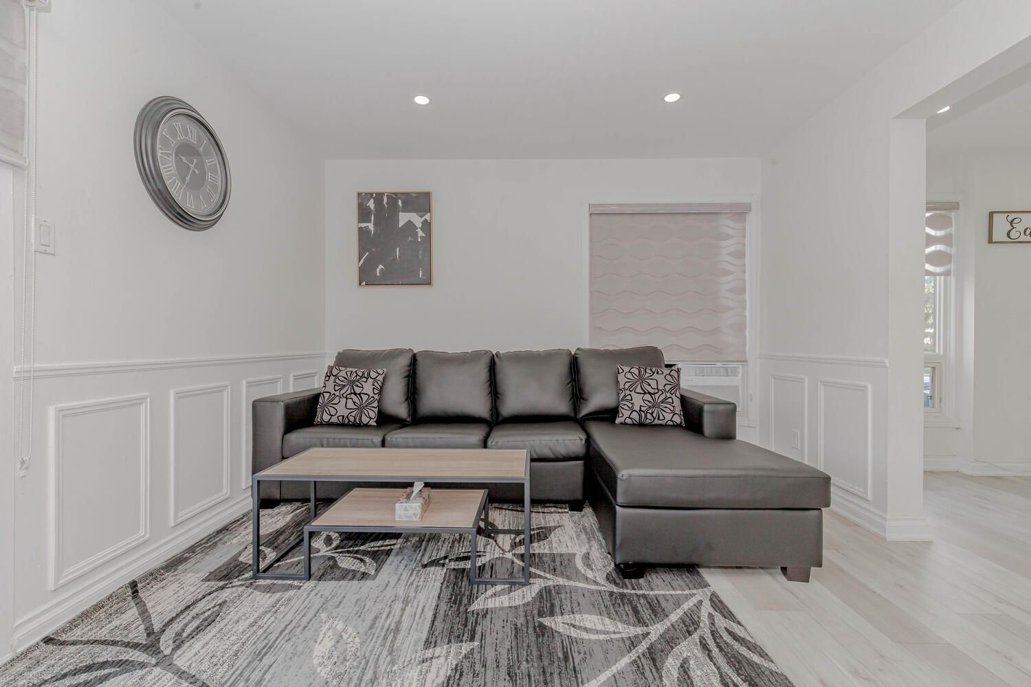 • Spacious living room enhanced with new pot lights and stylish blinds.