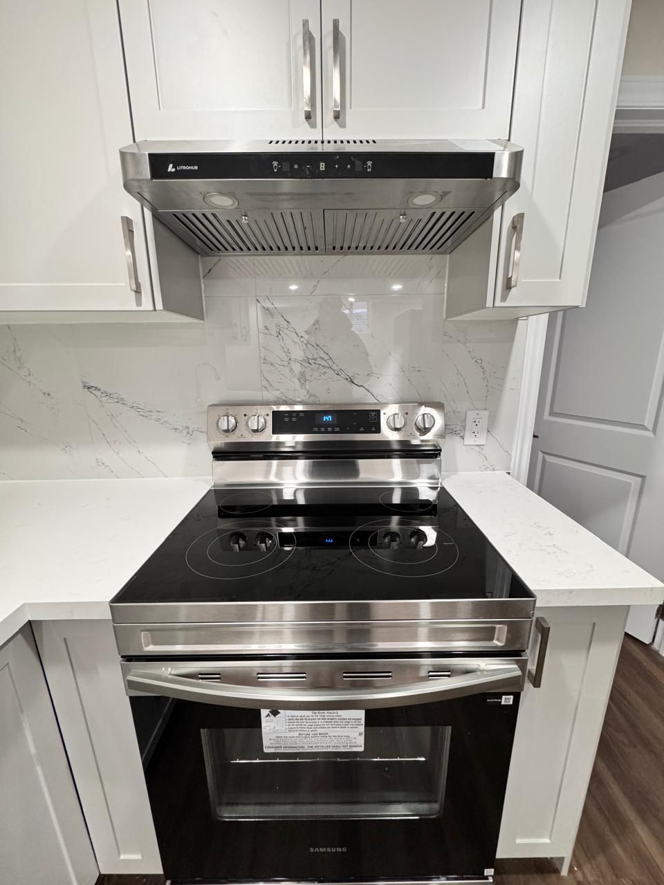 • Modern kitchen with stainless steel appliances and ample storage.