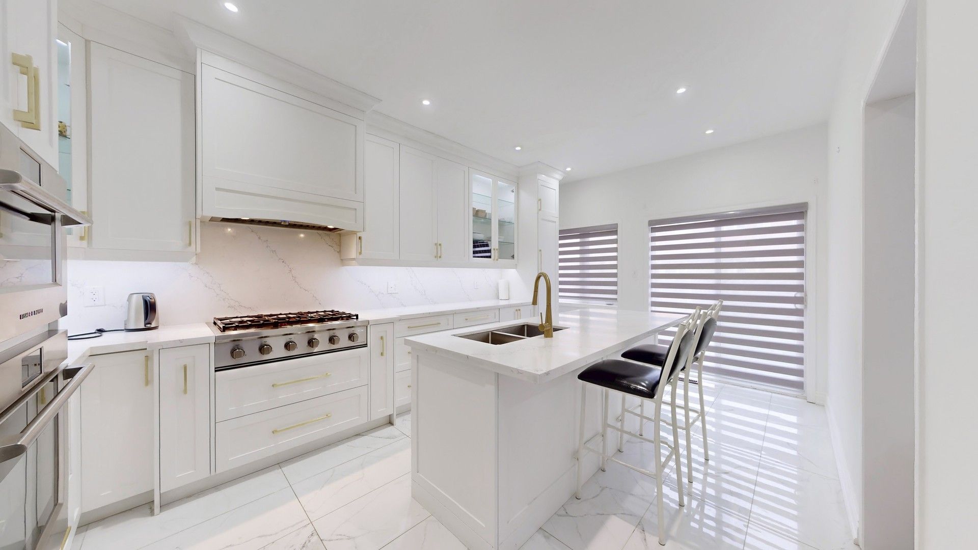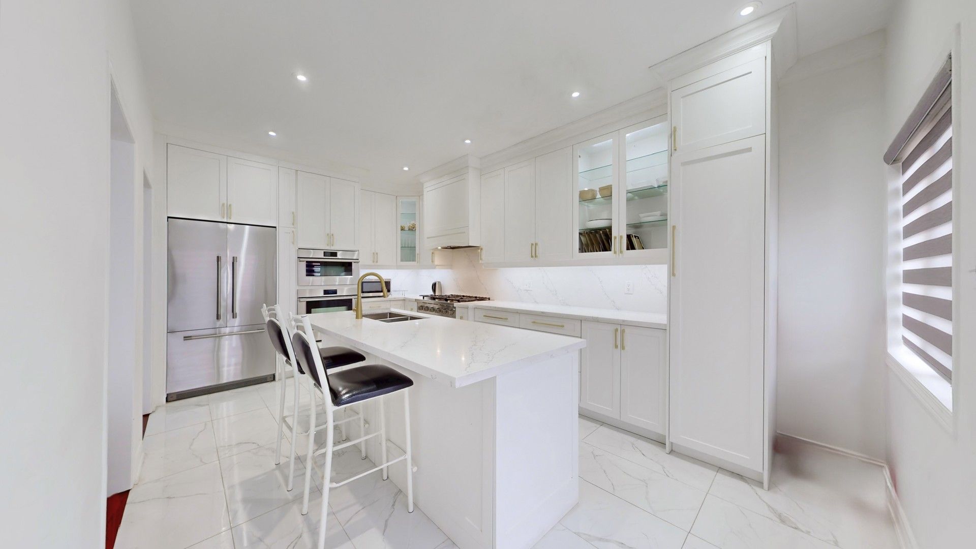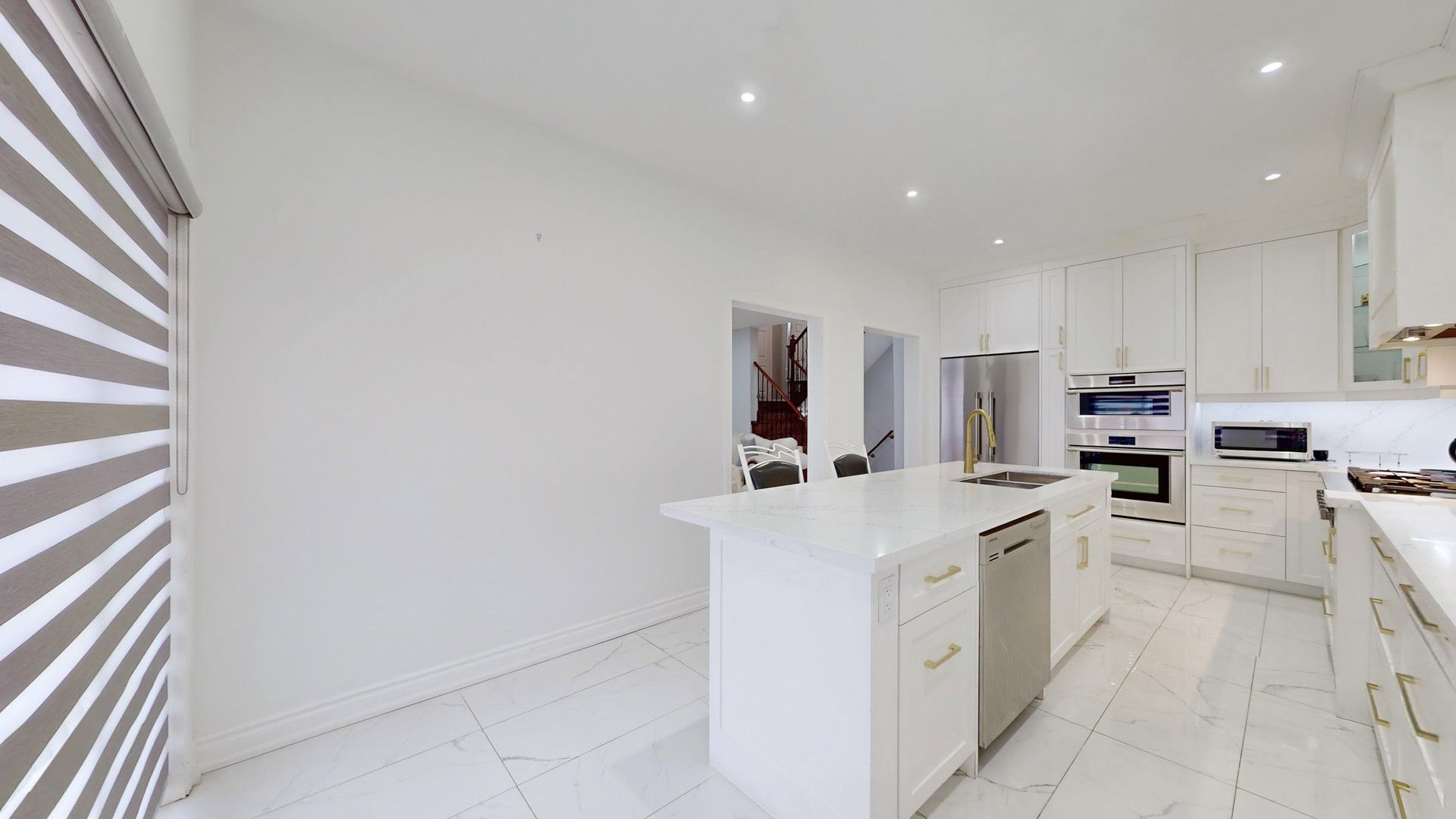 • New kitchen features quartz countertops, built-in appliances, and a center island.
