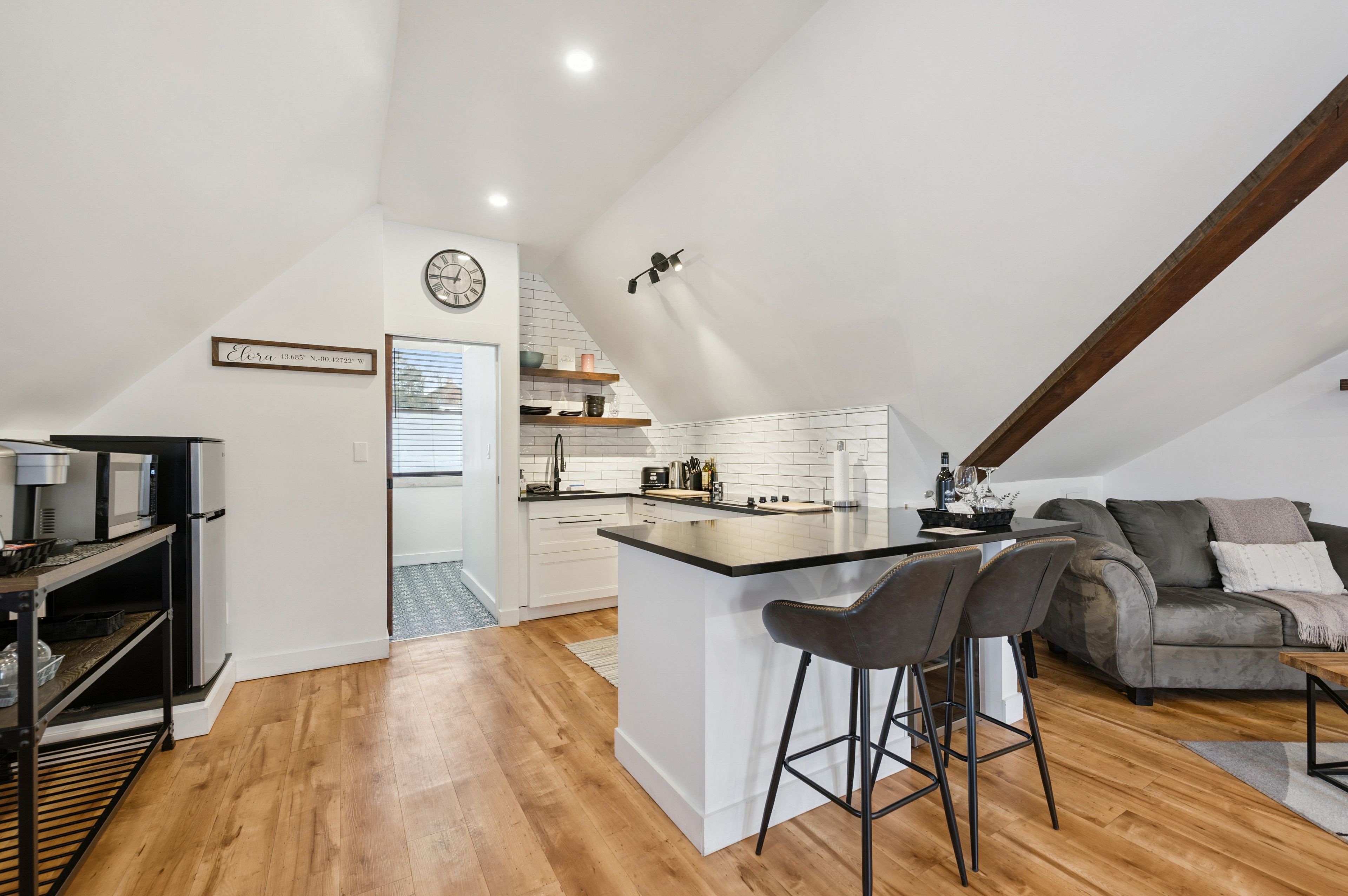 • Rare landmark stone building on the river in downtown Elora.