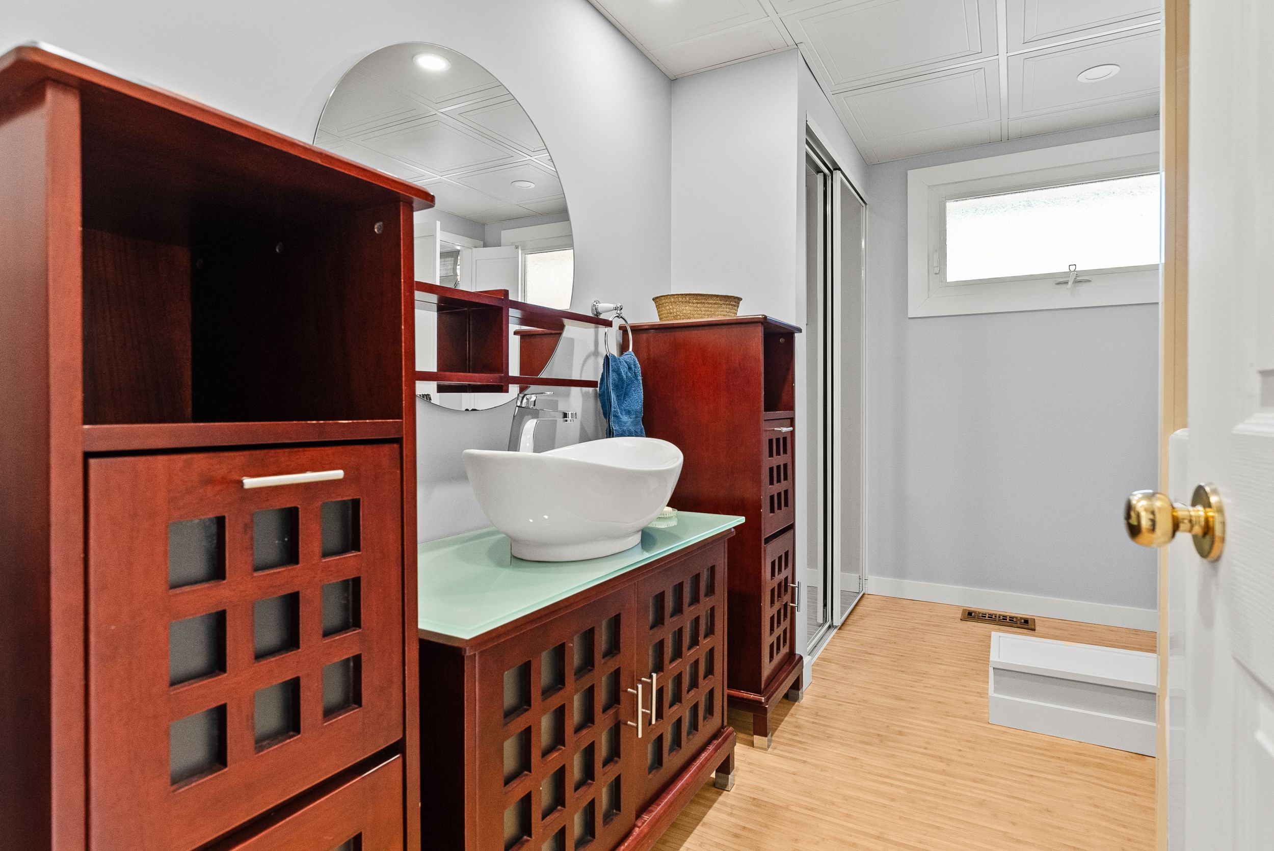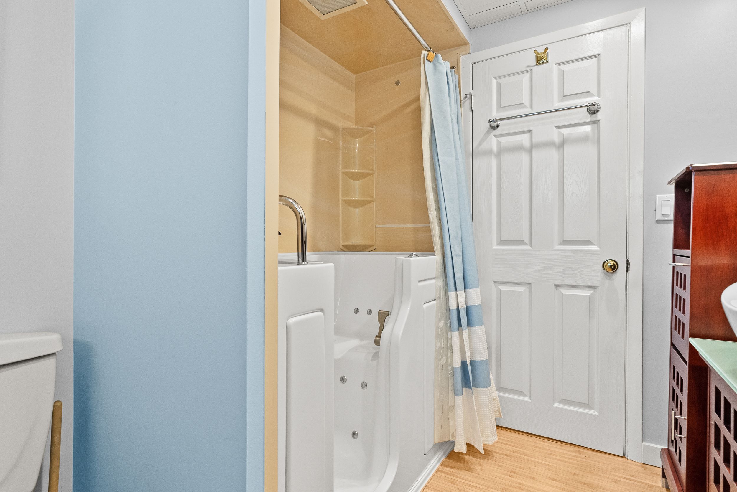 • Updated bathroom features a relaxing walk-in soaker tub.