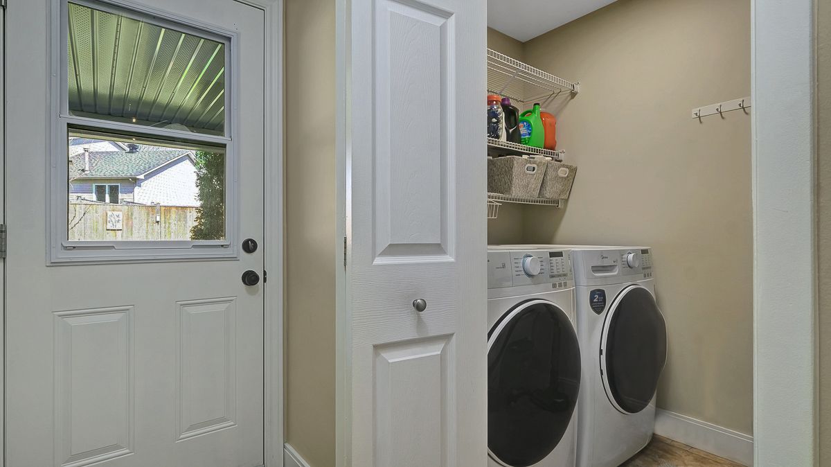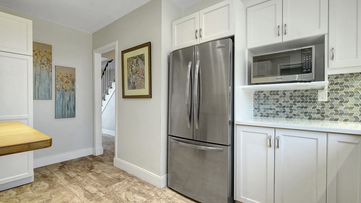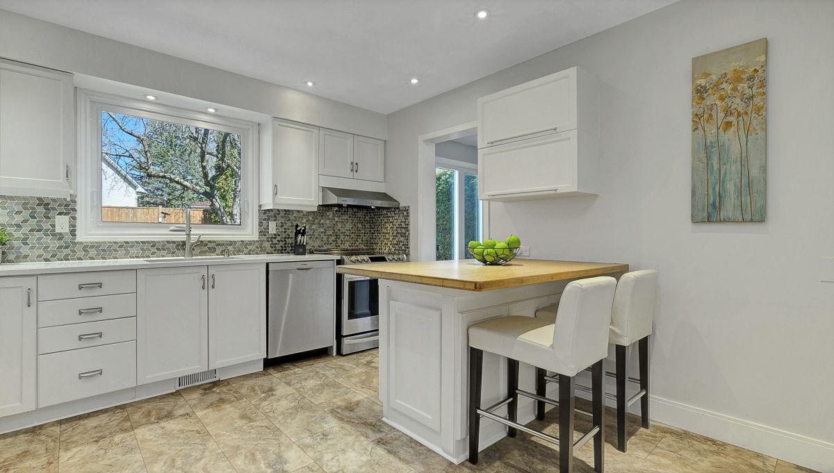 • Modern kitchen with quartz countertops and a view of the backyard.