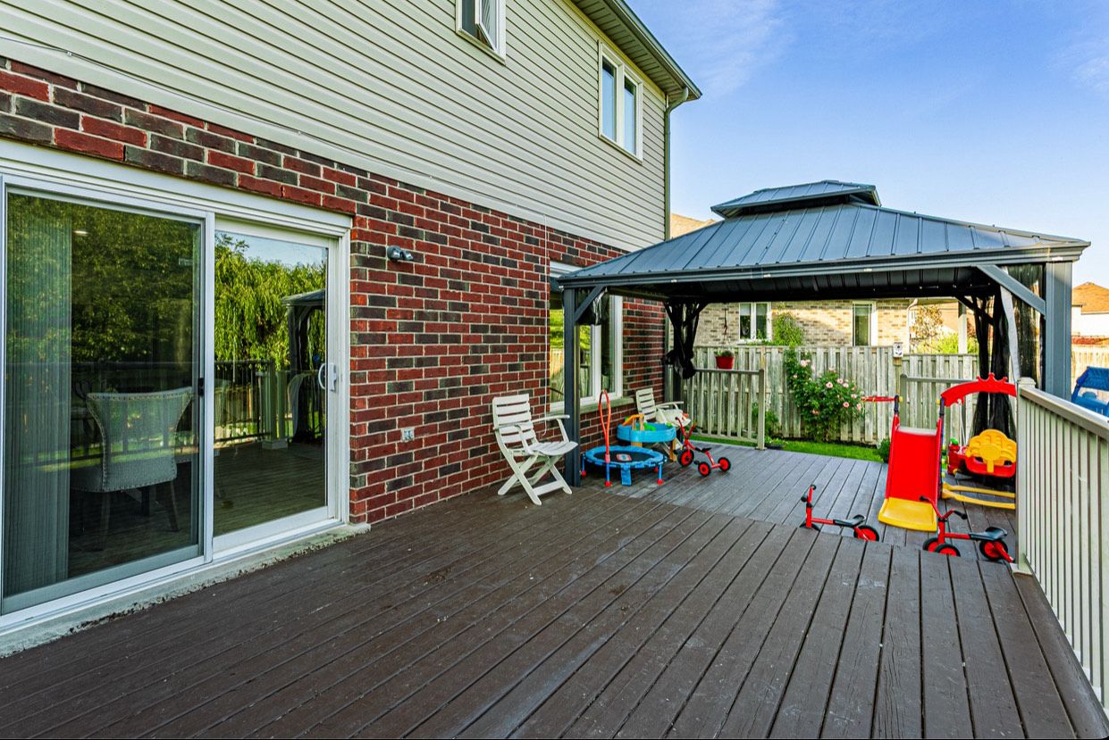• Fully fenced backyard featuring a large deck and storage shed.