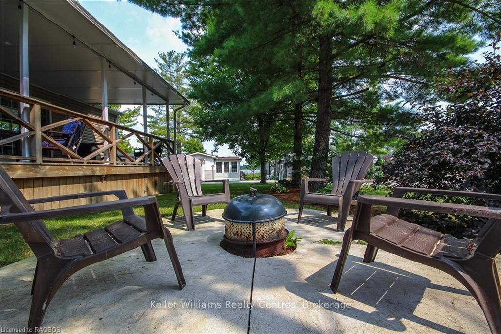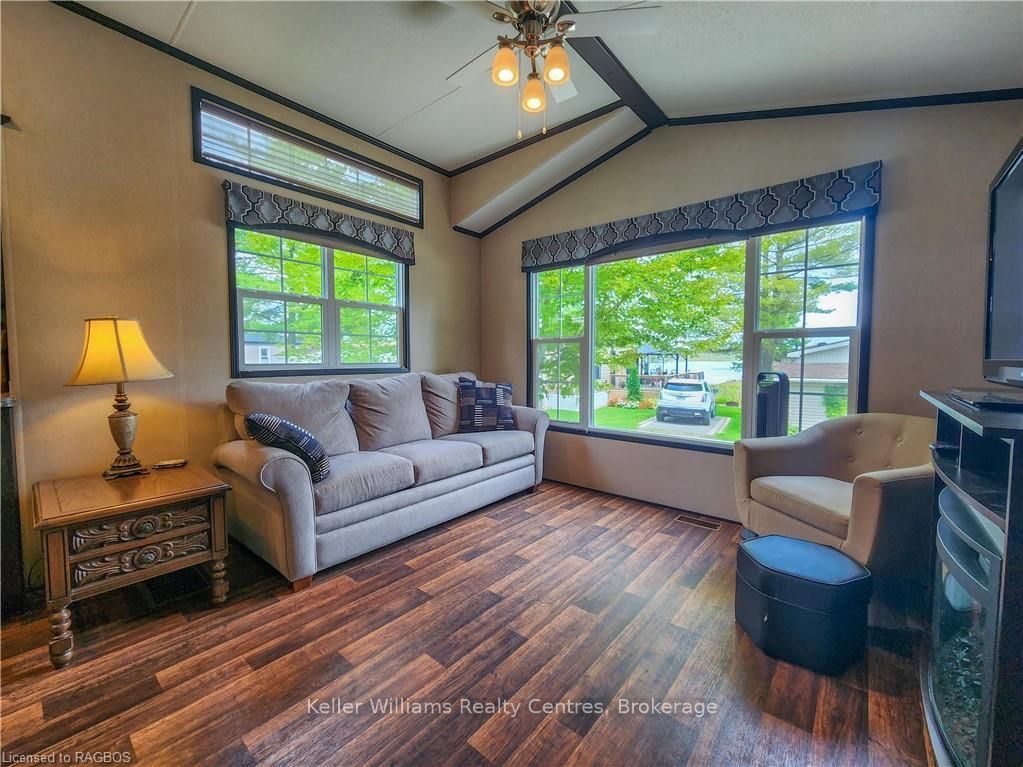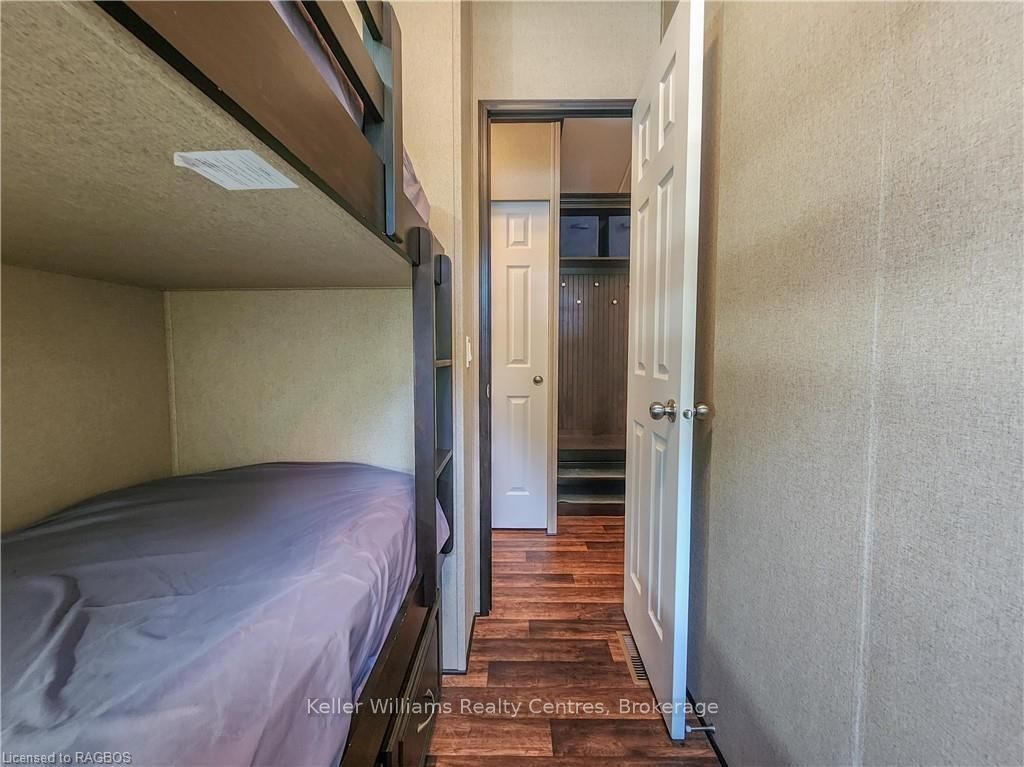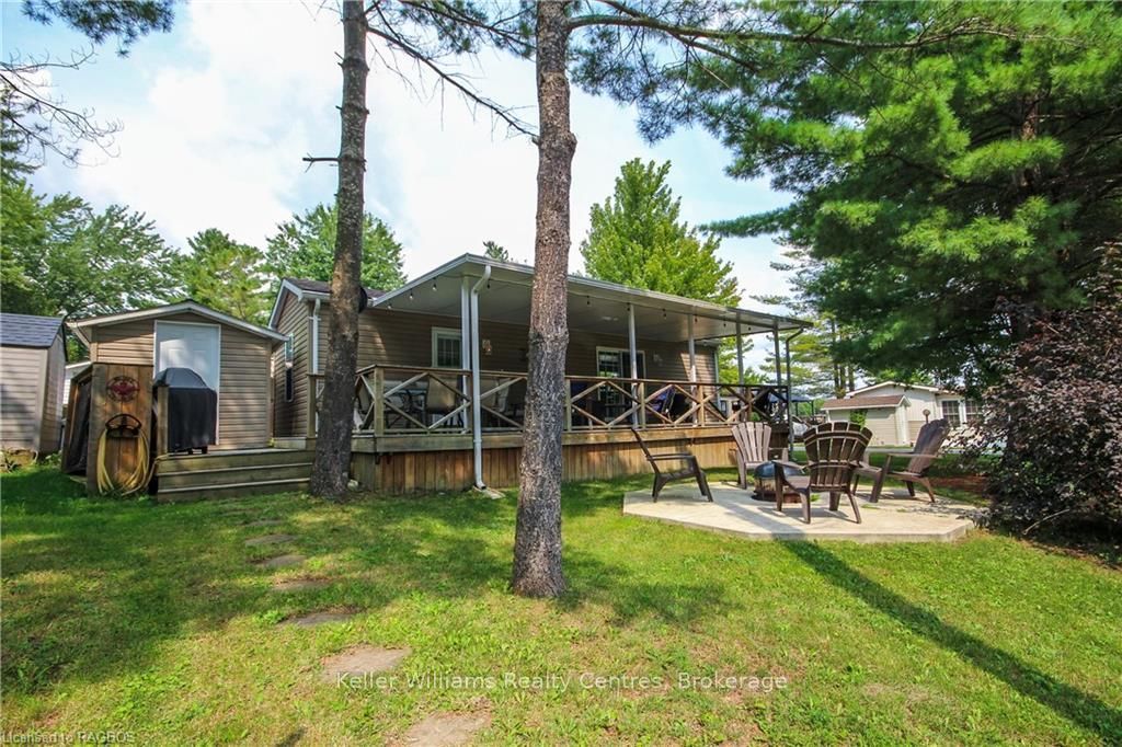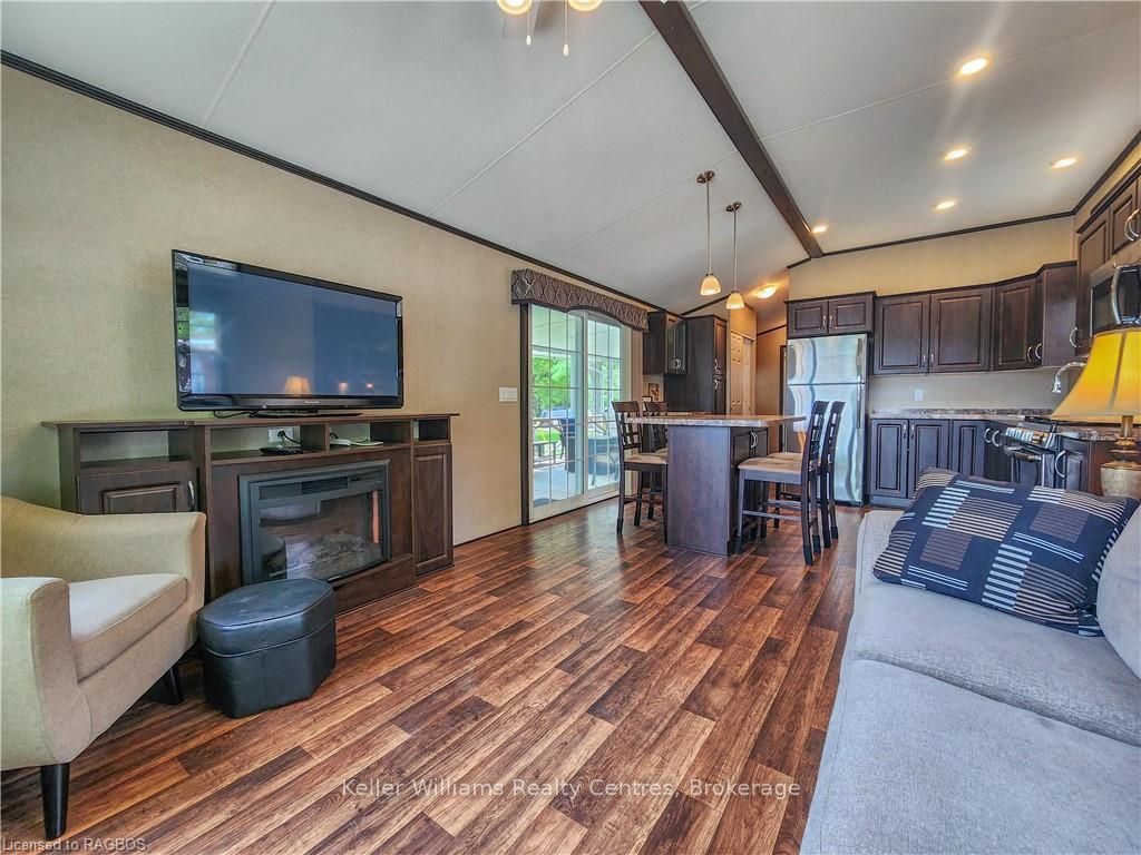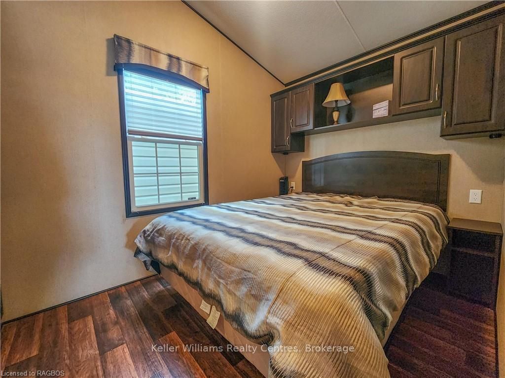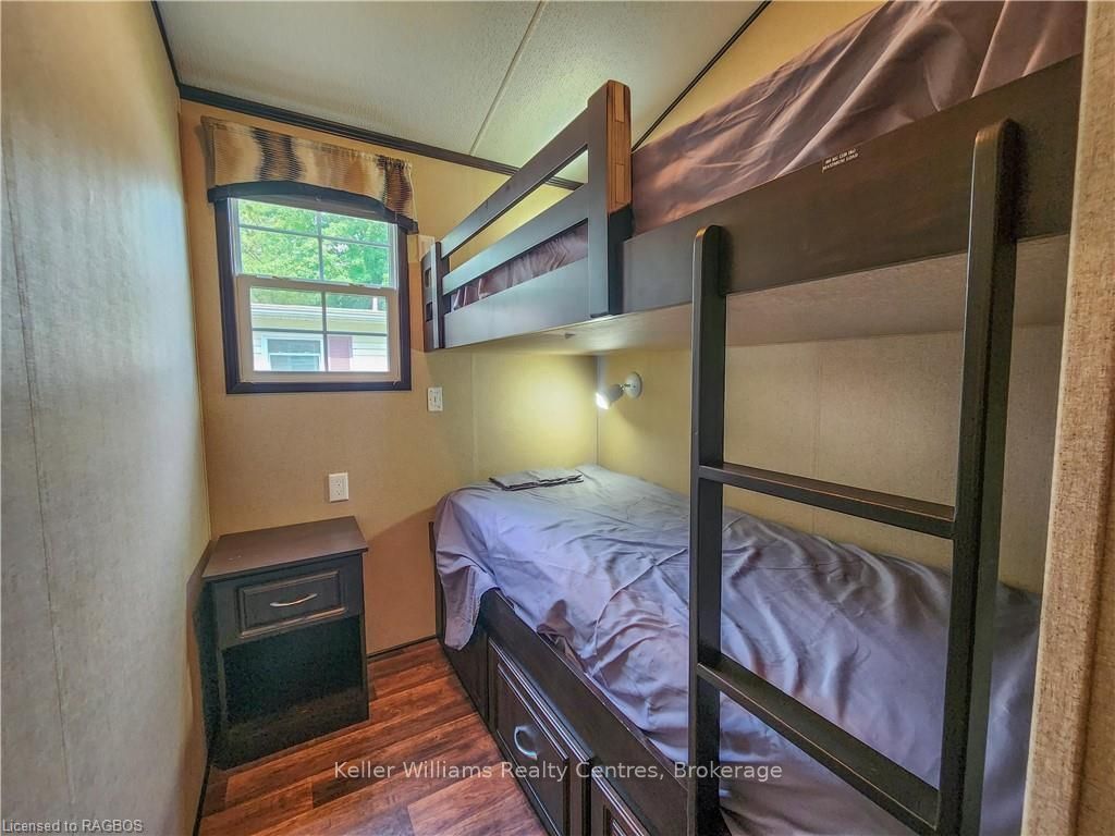 This fully furnished, turn key 2016 northlander cottager escape stuns with vaulted ceilings, hardwood floors, and big windows framing lush views. Cozy up by the electric fireplace or host movie nights in the living room. The sleek kitchen, with stainless steel appliances and a spacious island, makes family meals or game nights a breeze. Sleep easy in the plush queen primary bedroom, while kids and guests crash in the bunk room. The modern bathroom boasts a glass shower and ample storage. Outside, a covered deck with comfy seating, a fire table, bbq, and dining area sets the stage for epic gatherings, rain or shine. Roast marshmallows at the fire pit, surrounded by a lush, tree lined yard with a storage shed for all your gear. Dive into lake fun; boating, fishing, swimming or stroll scenic trails. Fishermans cove delivers big with a marina, playgrounds, indoor pools, and community. Your wallet friendly family vacation or retirement retreat awaits, don't miss out! (*seasonal park, not a primary residence. Lease fees pre-paid until july. Park open april 1-october 31, $4,160 + tax/year(based on 5 year lease $20,800))