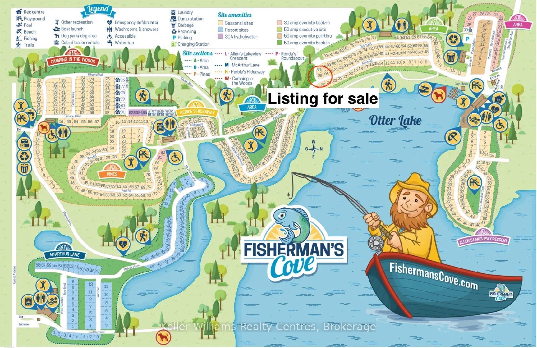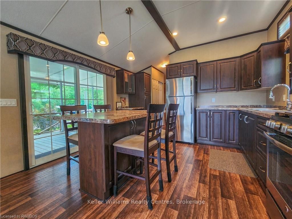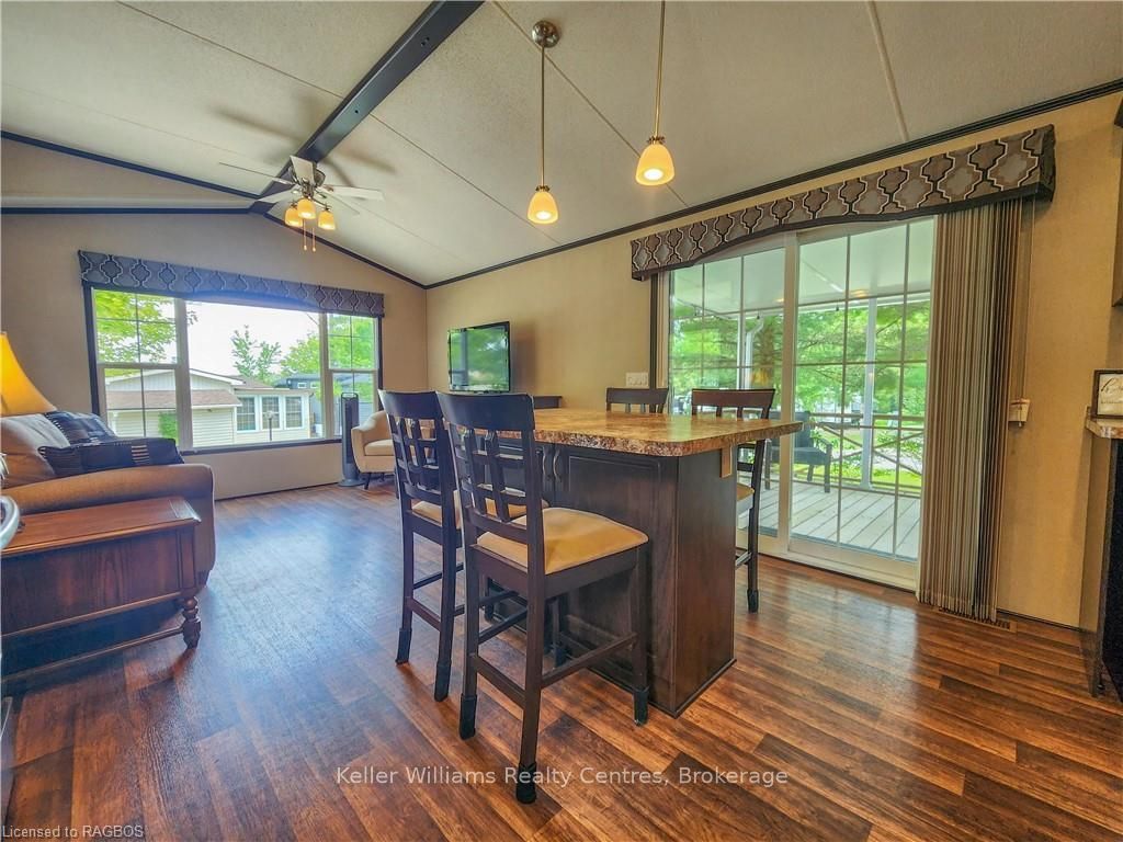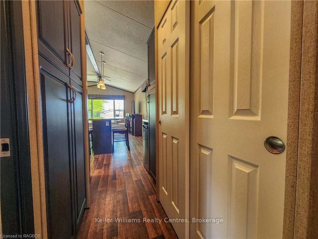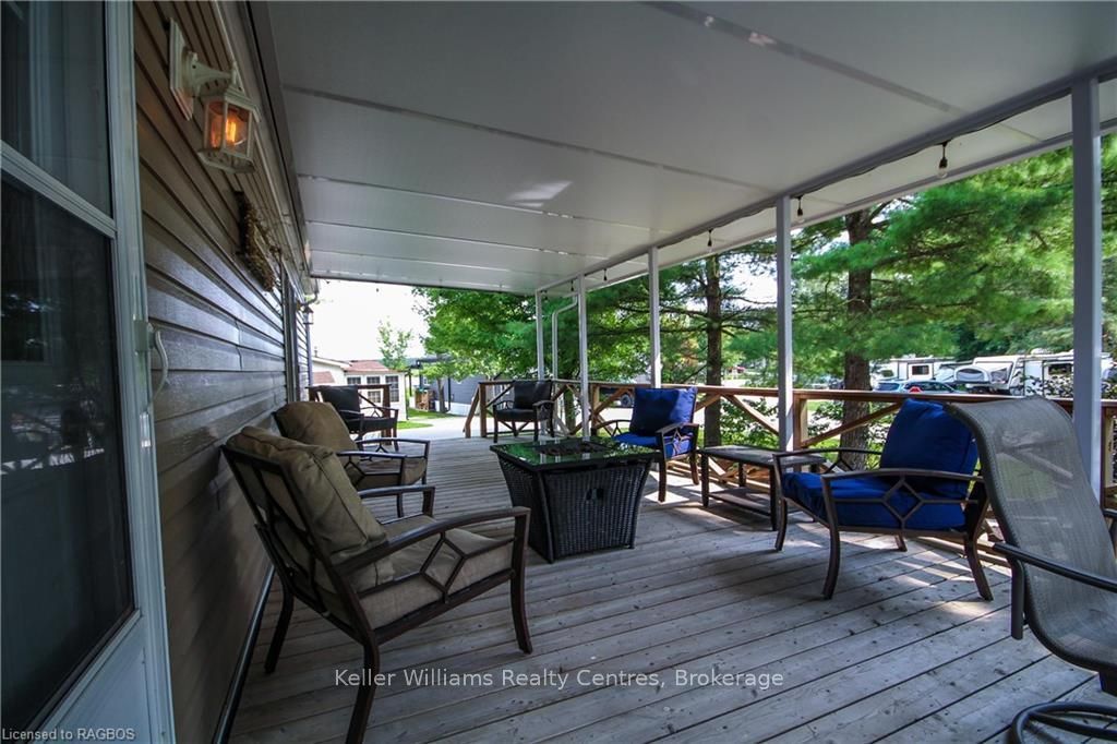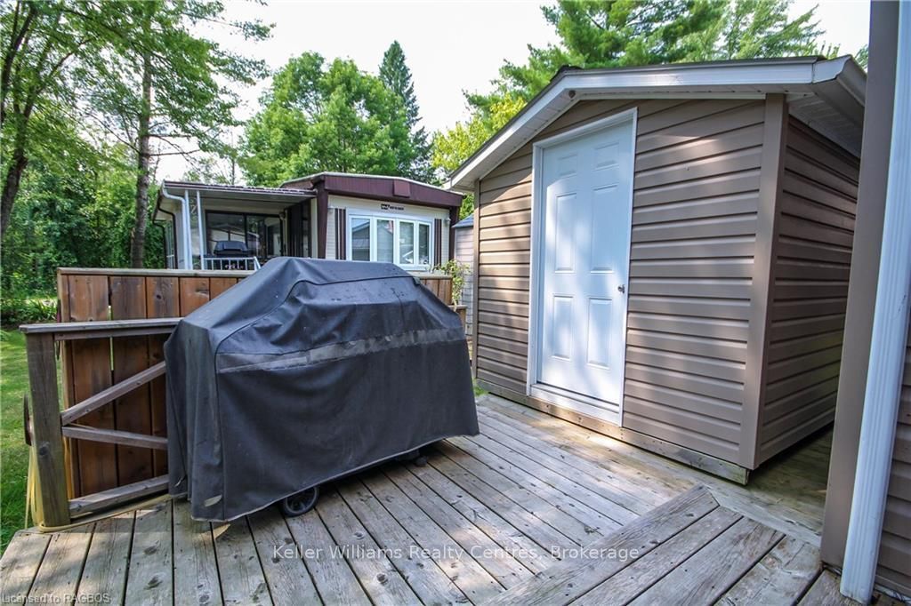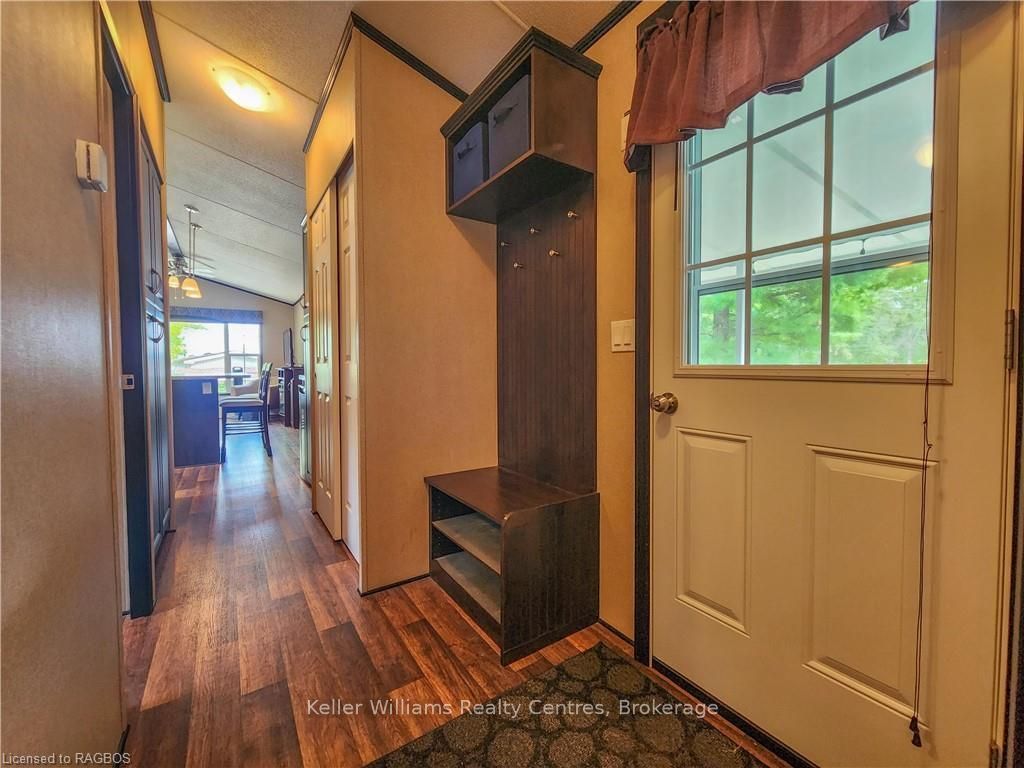 This fully furnished, turn key 2016 northlander cottager escape stuns with vaulted ceilings, hardwood floors, and big windows framing lush views. Cozy up by the electric fireplace or host movie nights in the living room. The sleek kitchen, with stainless steel appliances and a spacious island, makes family meals or game nights a breeze. Sleep easy in the plush queen primary bedroom, while kids and guests crash in the bunk room. The modern bathroom boasts a glass shower and ample storage. Outside, a covered deck with comfy seating, a fire table, bbq, and dining area sets the stage for epic gatherings, rain or shine. Roast marshmallows at the fire pit, surrounded by a lush, tree lined yard with a storage shed for all your gear. Dive into lake fun; boating, fishing, swimming or stroll scenic trails. Fishermans cove delivers big with a marina, playgrounds, indoor pools, and community. Your wallet friendly family vacation or retirement retreat awaits, don't miss out! (*seasonal park, not a primary residence. Lease fees pre-paid until july. Park open april 1-october 31, $4,160 + tax/year(based on 5 year lease $20,800))