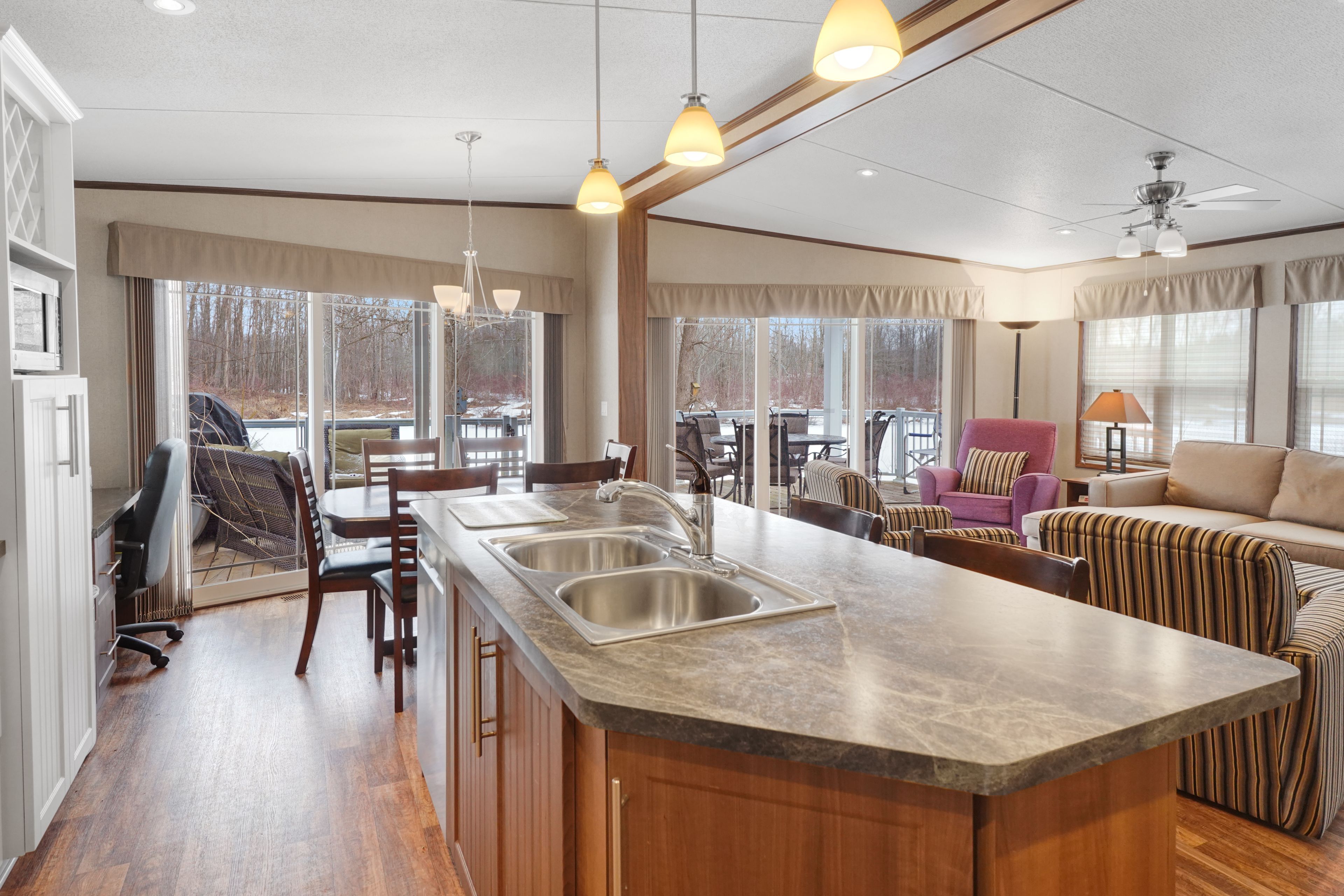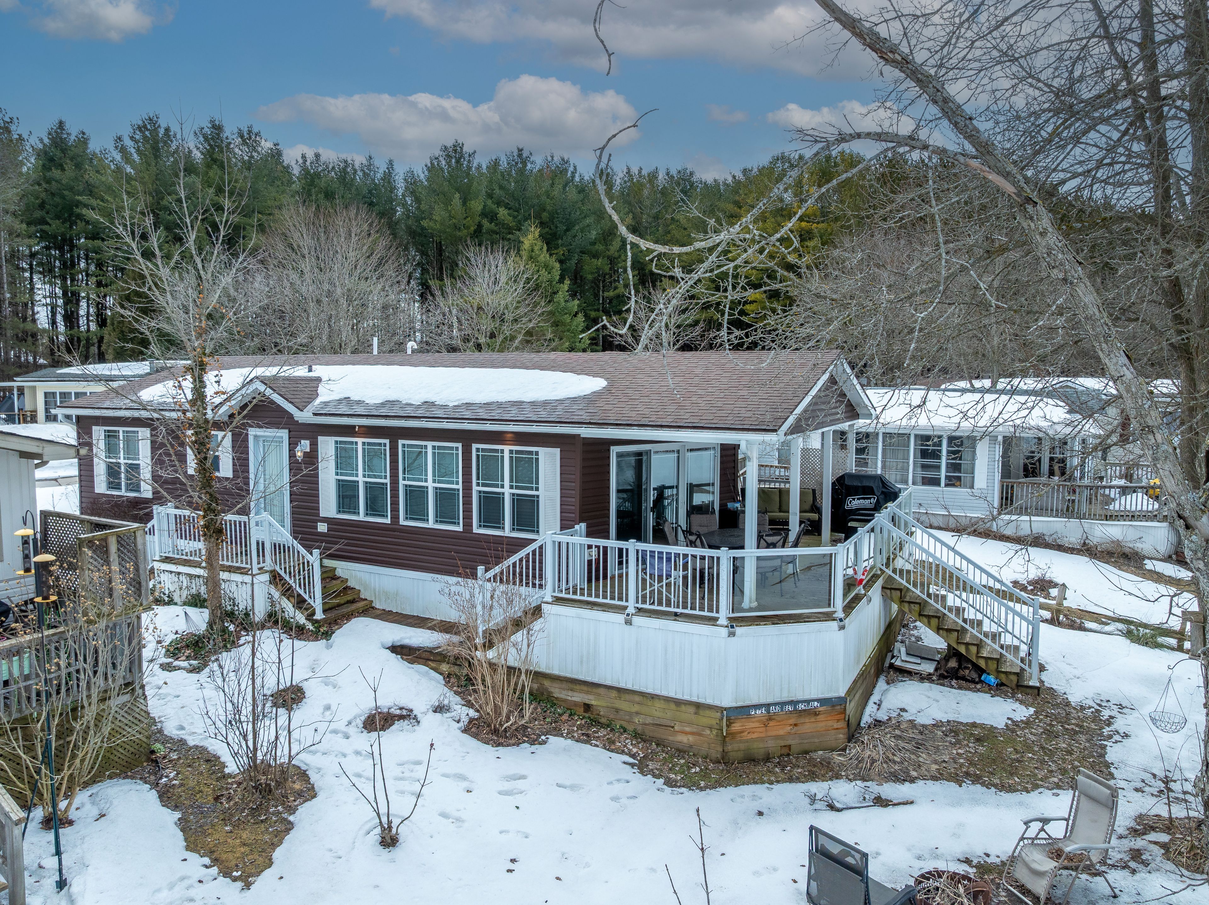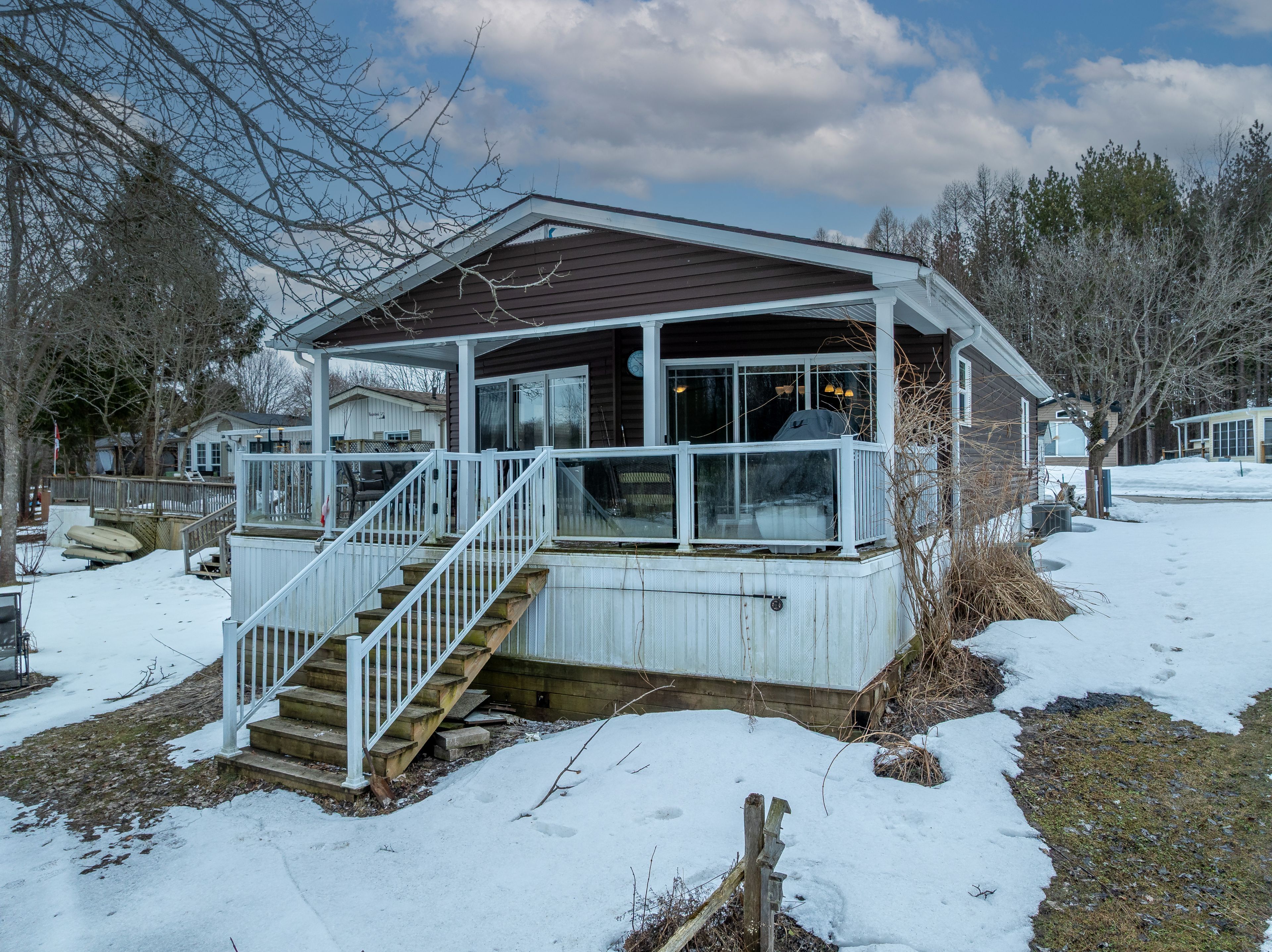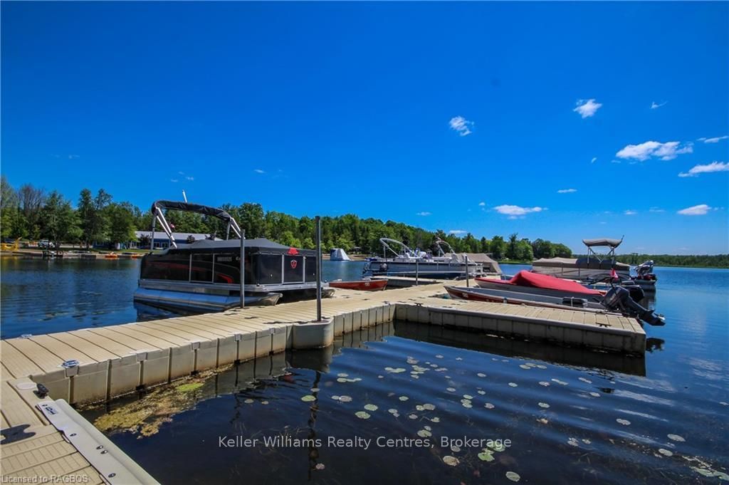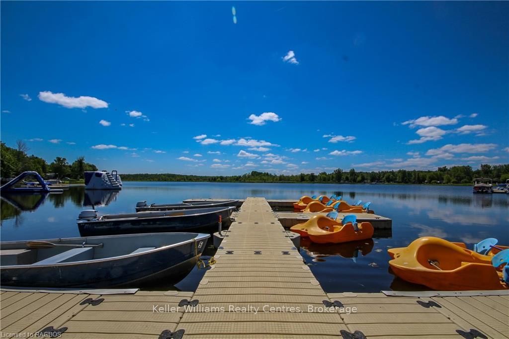 2026 park fees paid! This beautifully maintained 2016 northlander classic double wide park model offers exceptional direct waterfront living with a private dock in fisherman's cove, just minutes east of kincardine. Situated on a private spring fed lake, it is only about 30 minutes from port elgin and the shores of lake huron. The spacious interior features two equal sized bedrooms, each with generous walk in closets. The master bedroom includes a private ensuite bathroom for added convenience. The open concept living and dining area is bright and inviting, highlighted by impressive full width (24') sliding glass doors that provide stunning panoramic water views and seamless access to a matching full width deck perfect for outdoor entertaining or simply relaxing by the water. The well equipped kitchen boasts modern stainless steel appliances, a large island with double sink, and ample counter space. Warm wood cabinetry and neutral tones create a welcoming cottage atmosphere throughout. Additional features include a second full bathroom and practical storage solutions. Ideal as a seasonal family retreat, this turnkey waterfront home combines comfort, style, and unbeatable lake access in a popular resort community with amenities including a beach, pools, and more. A rare opportunity-contact us today to schedule a private viewing!
