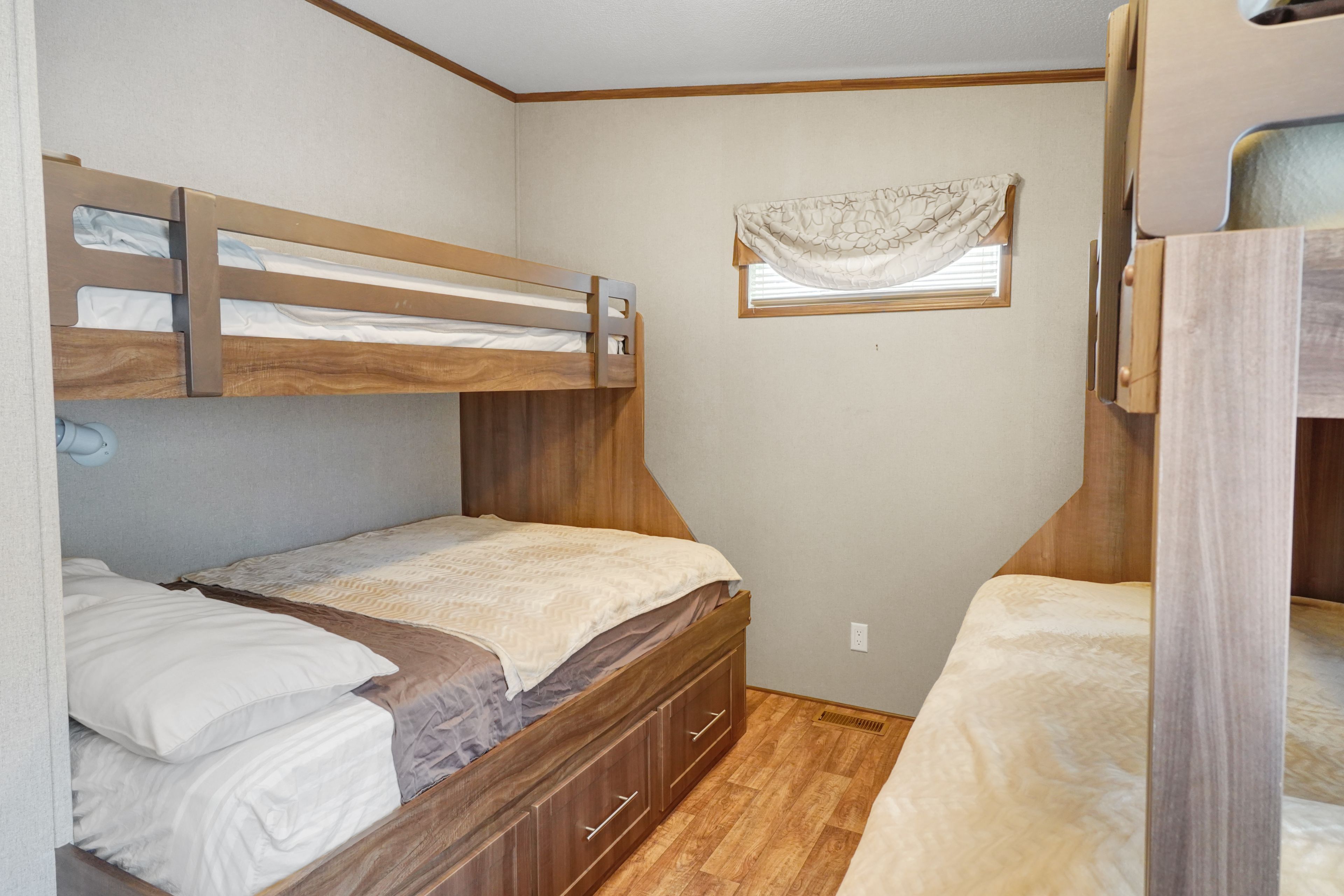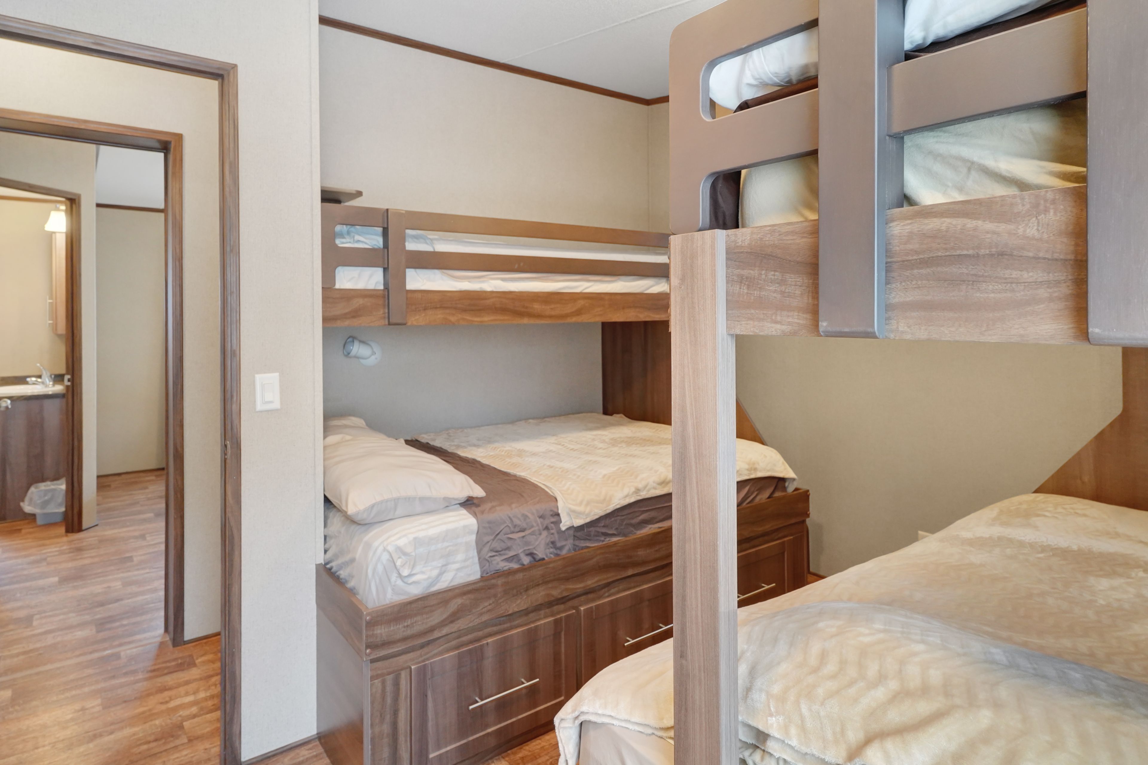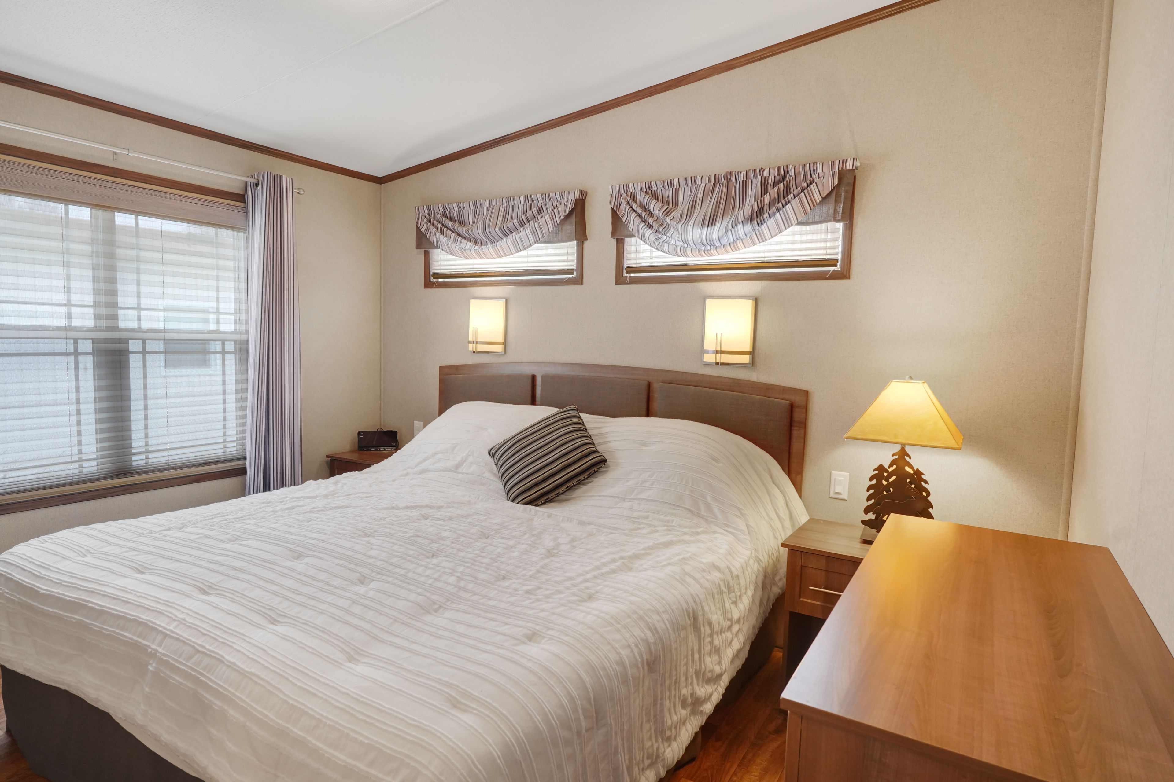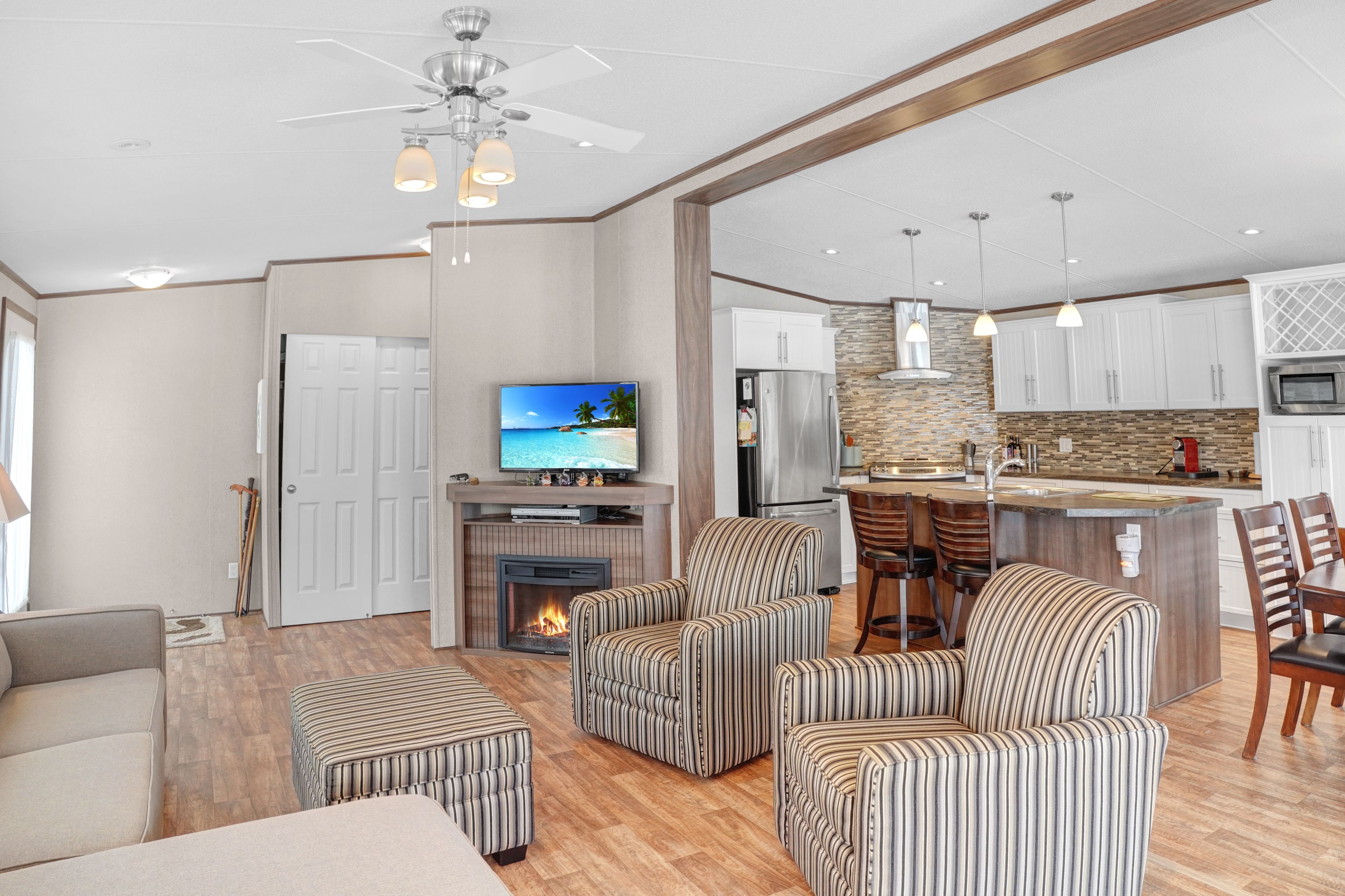 2026 park fees paid! This beautifully maintained 2016 northlander classic double wide park model offers exceptional direct waterfront living with a private dock in fisherman's cove, just minutes east of kincardine. Situated on a private spring fed lake, it is only about 30 minutes from port elgin and the shores of lake huron. The spacious interior features two equal sized bedrooms, each with generous walk in closets. The master bedroom includes a private ensuite bathroom for added convenience. The open concept living and dining area is bright and inviting, highlighted by impressive full width (24') sliding glass doors that provide stunning panoramic water views and seamless access to a matching full width deck perfect for outdoor entertaining or simply relaxing by the water. The well equipped kitchen boasts modern stainless steel appliances, a large island with double sink, and ample counter space. Warm wood cabinetry and neutral tones create a welcoming cottage atmosphere throughout. Additional features include a second full bathroom and practical storage solutions. Ideal as a seasonal family retreat, this turnkey waterfront home combines comfort, style, and unbeatable lake access in a popular resort community with amenities including a beach, pools, and more. A rare opportunity-contact us today to schedule a private viewing!