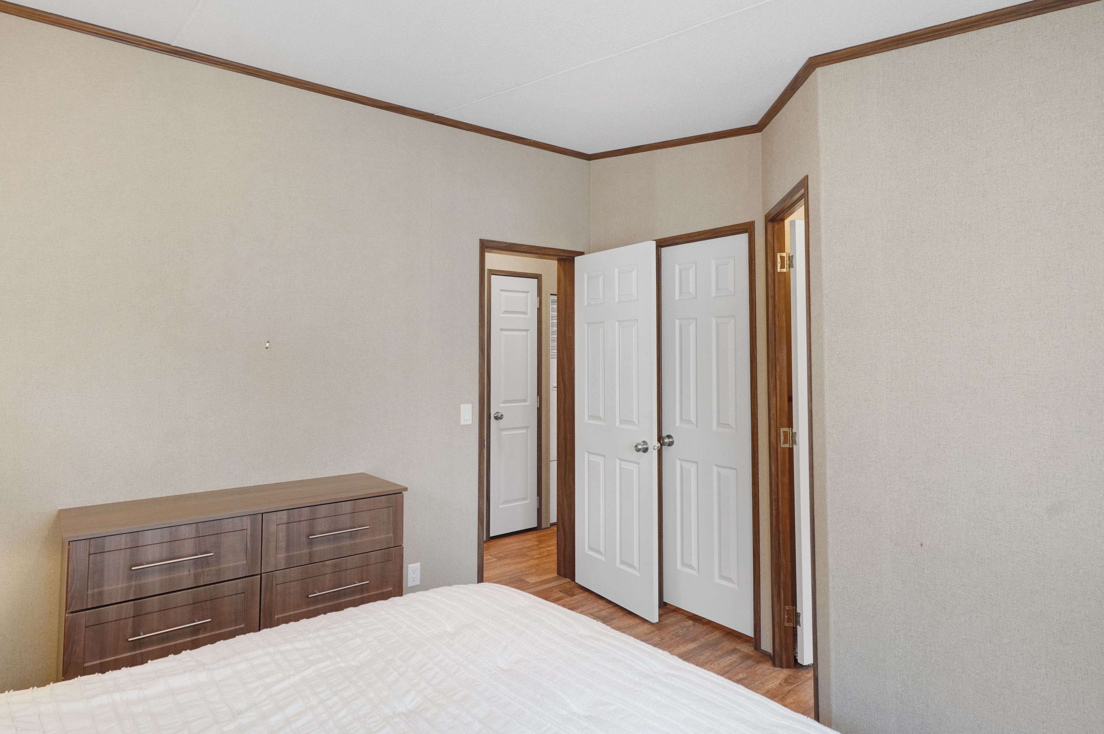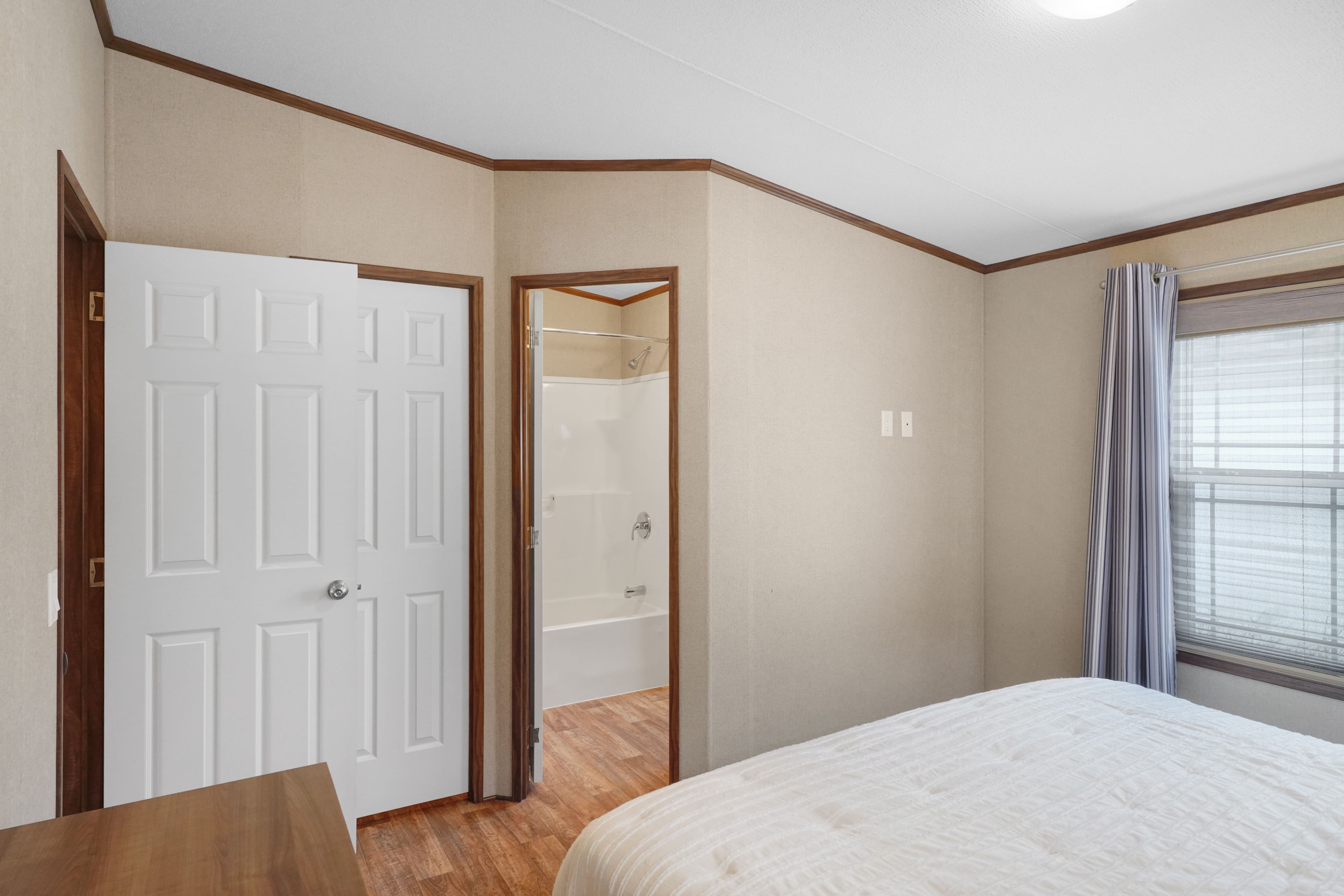 • Spacious interior with two equal-sized bedrooms and walk-in closets.