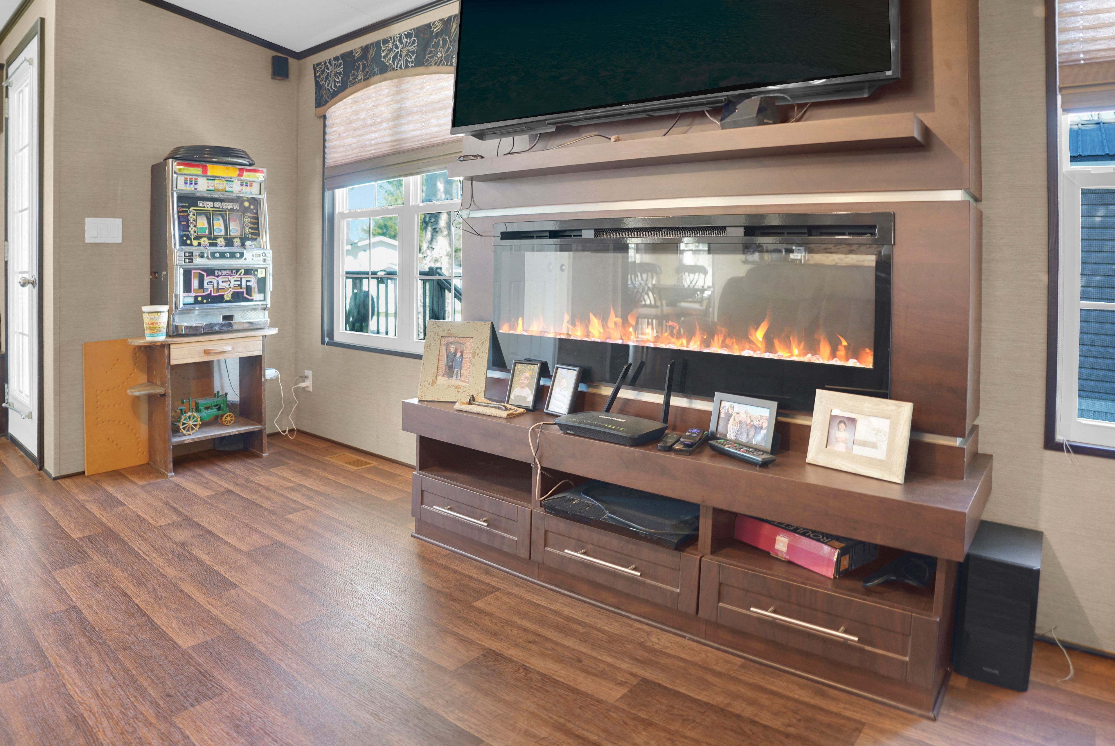 • Spacious living room with hardwood floors and built-in electric fireplace.