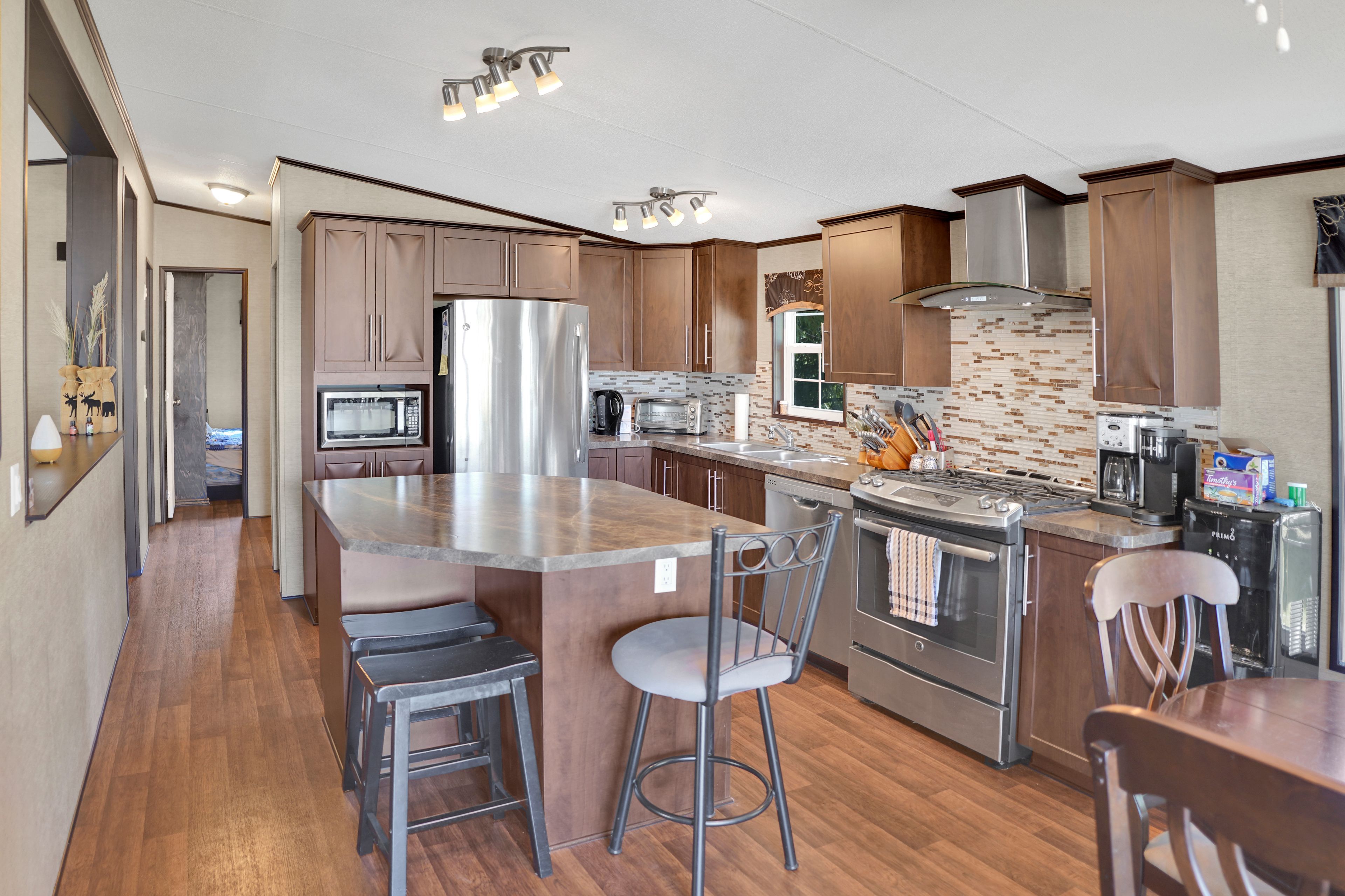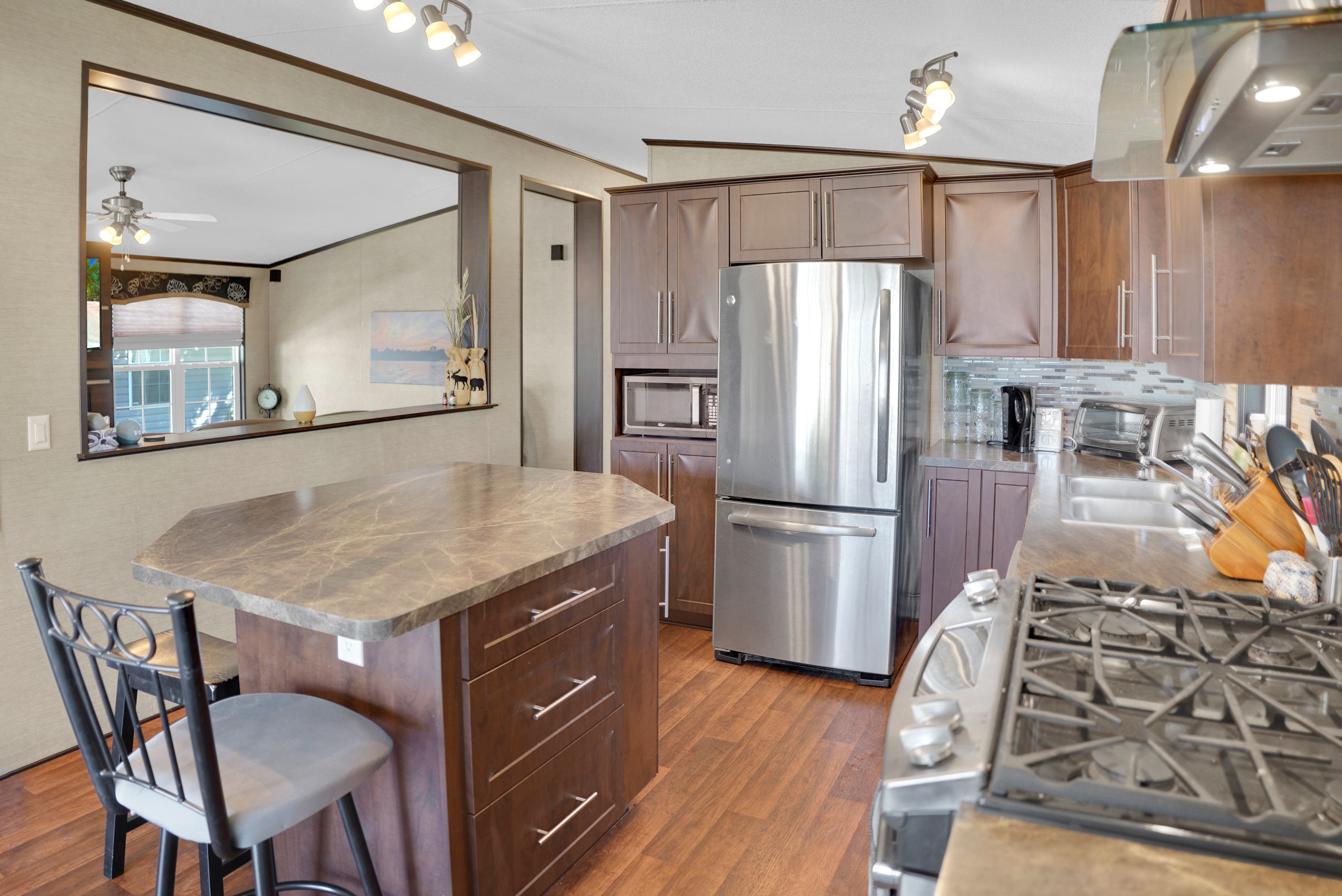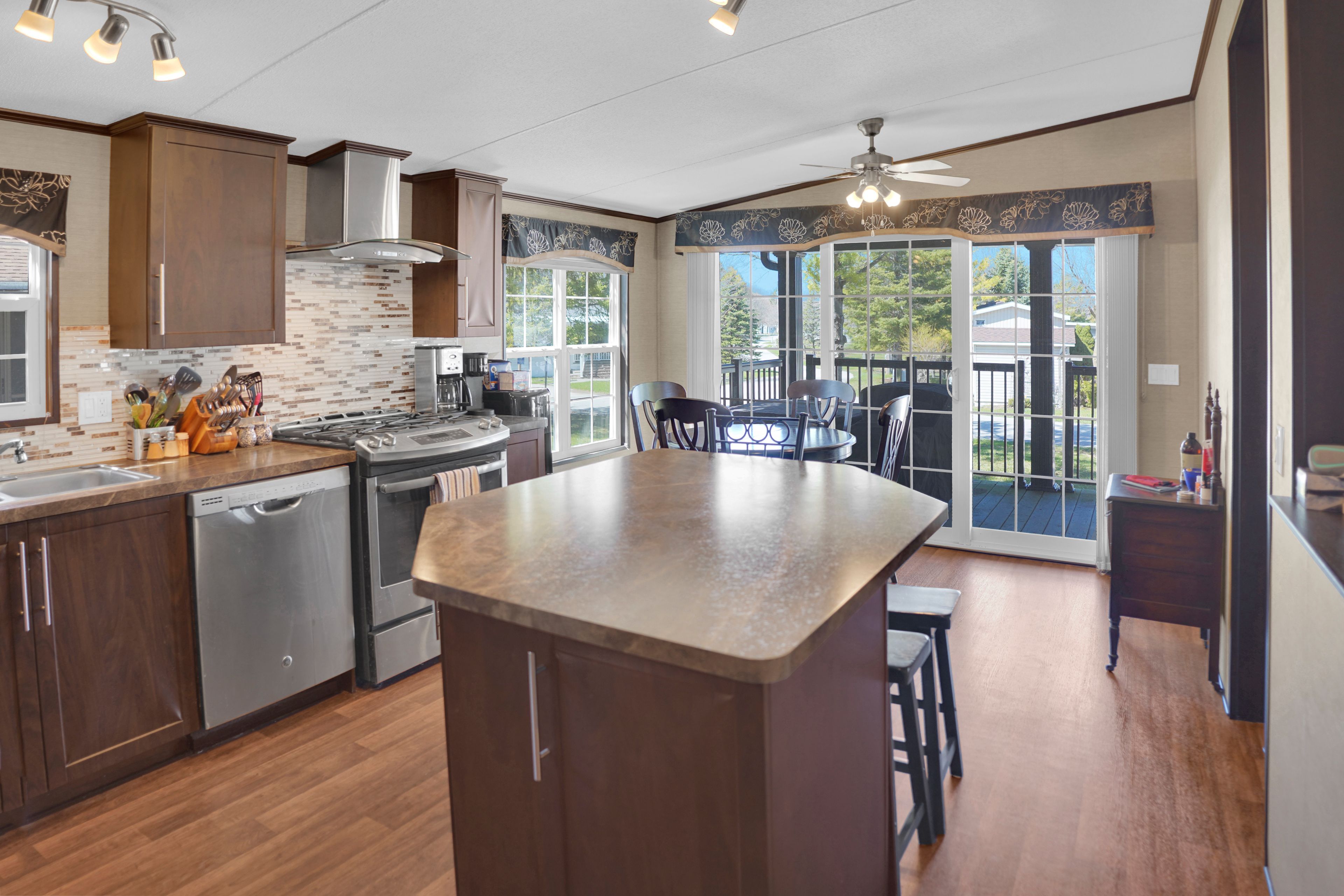 This well maintained two bedroom, one and a half bathroom northlander escape at fisherman's cove offers comfortable, turnkey living in one of bruce county's most popular lakeside communities. The spacious living room features hardwood floors, built in electric fireplace, with a practical mudroom entry complete with built in bench, coat hooks, and shoe storage. The kitchen impresses with dark shaker cabinets, mosaic tile backsplash, stainless steel propane range, dishwasher, french door refrigerator, and a large centre island with seating. The adjacent dining area includes sliding door access to the covered front deck, perfect for summer evenings outdoors. The primary bedroom offers a mounted tv, mirrored sliding closet doors, and a private ensuite. The second bedroom features a built in murphy bed, ideal for guests or flexible daytime use. A second full bathroom serves all your guests. Outside, a covered deck, concrete driveway, and mature trees complete the package. Fisherman's cove is a seasonal park, making this an affordable way to enjoy summer, just minutes from kincardine's beaches, shops, and amenities.