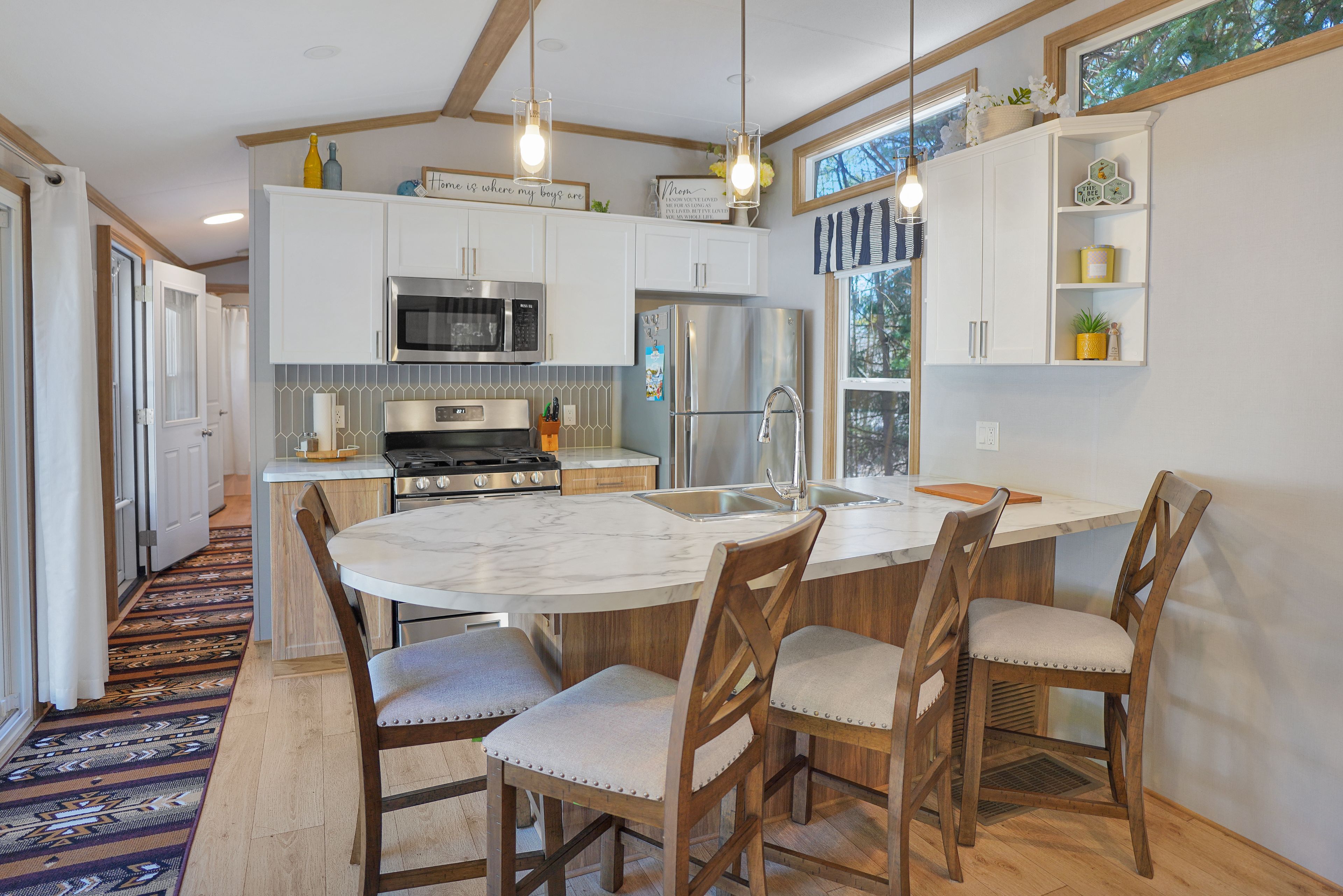 • Stylish kitchen with stainless steel appliances and spacious breakfast bar.