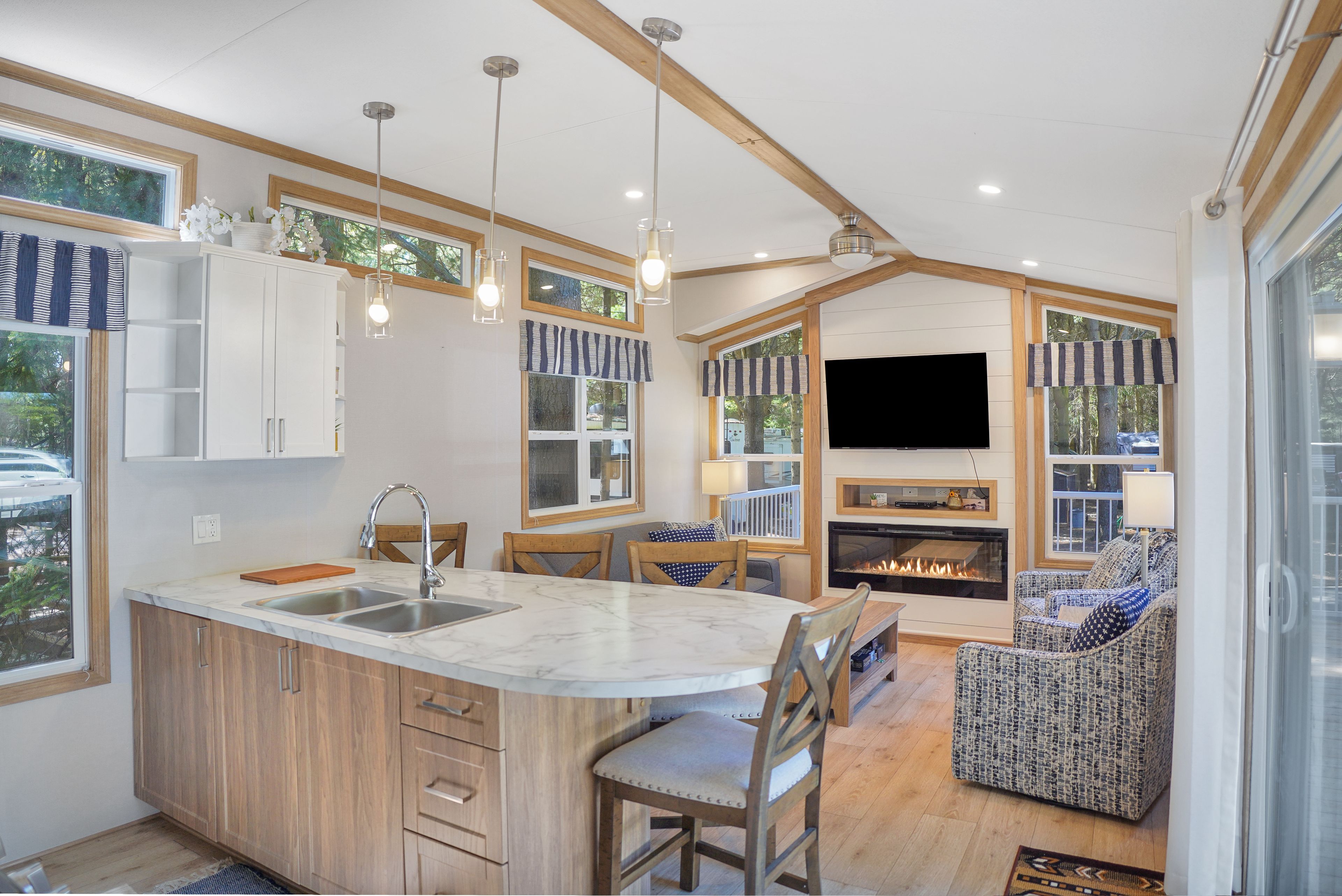 • Open-concept design with vaulted ceilings and oversized windows.