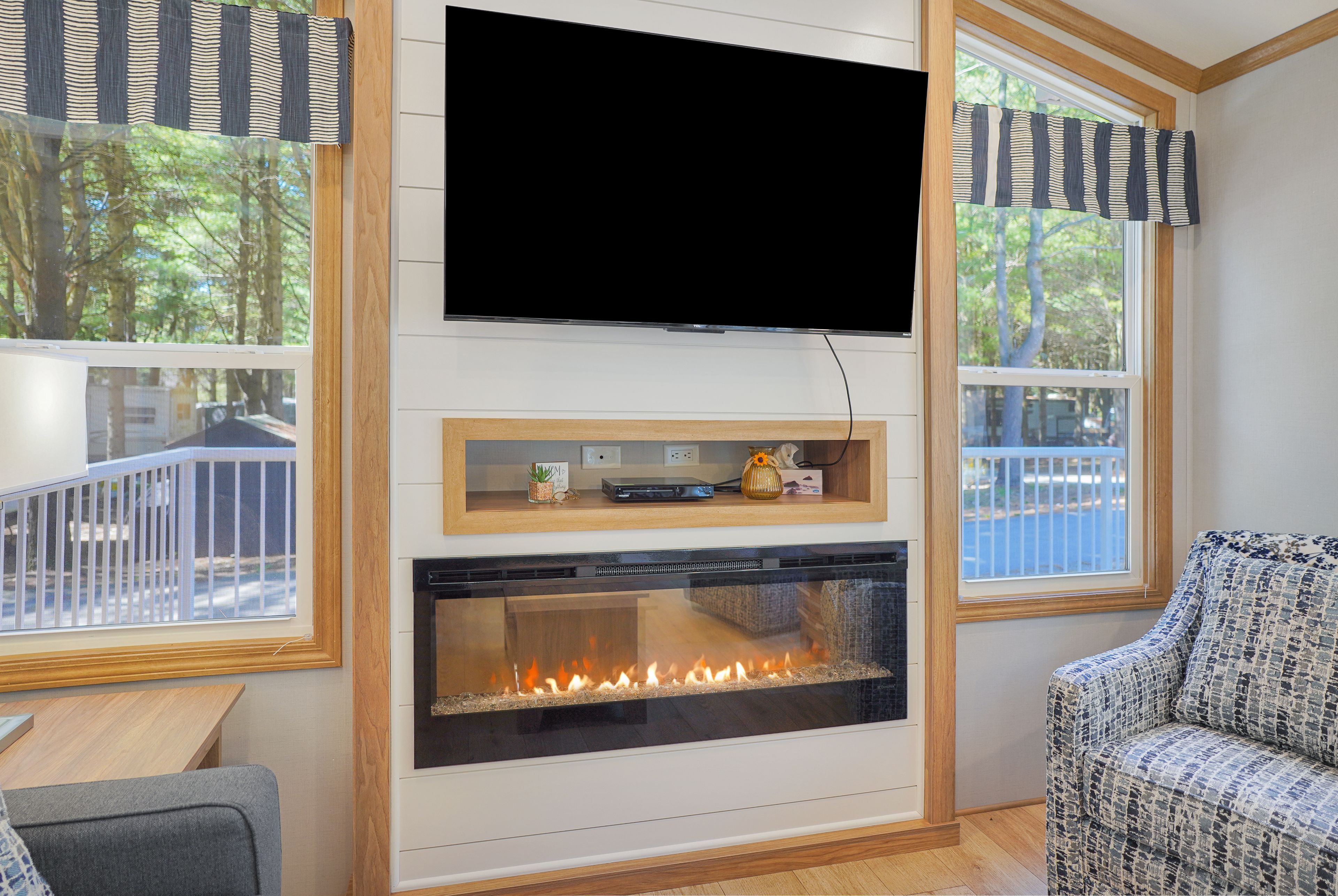 • Cozy living room featuring a fireplace and abundant natural light.