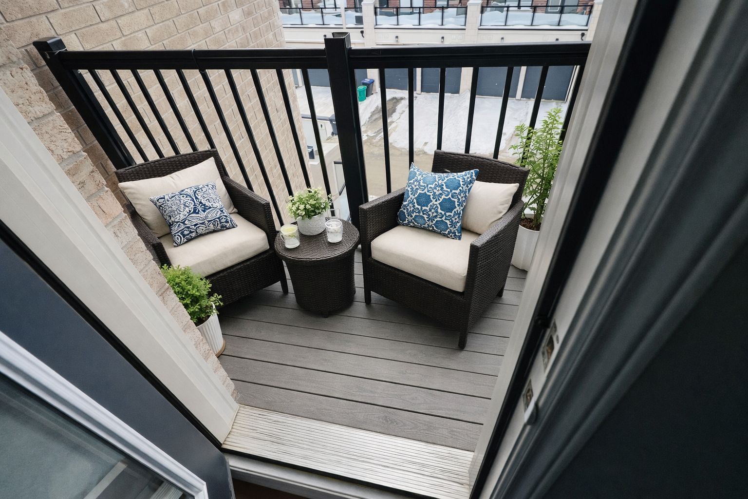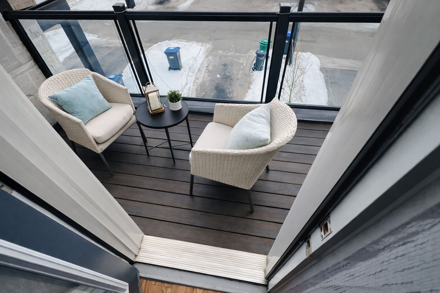 • Modern kitchen with oversized island and large balcony for outdoor dining.