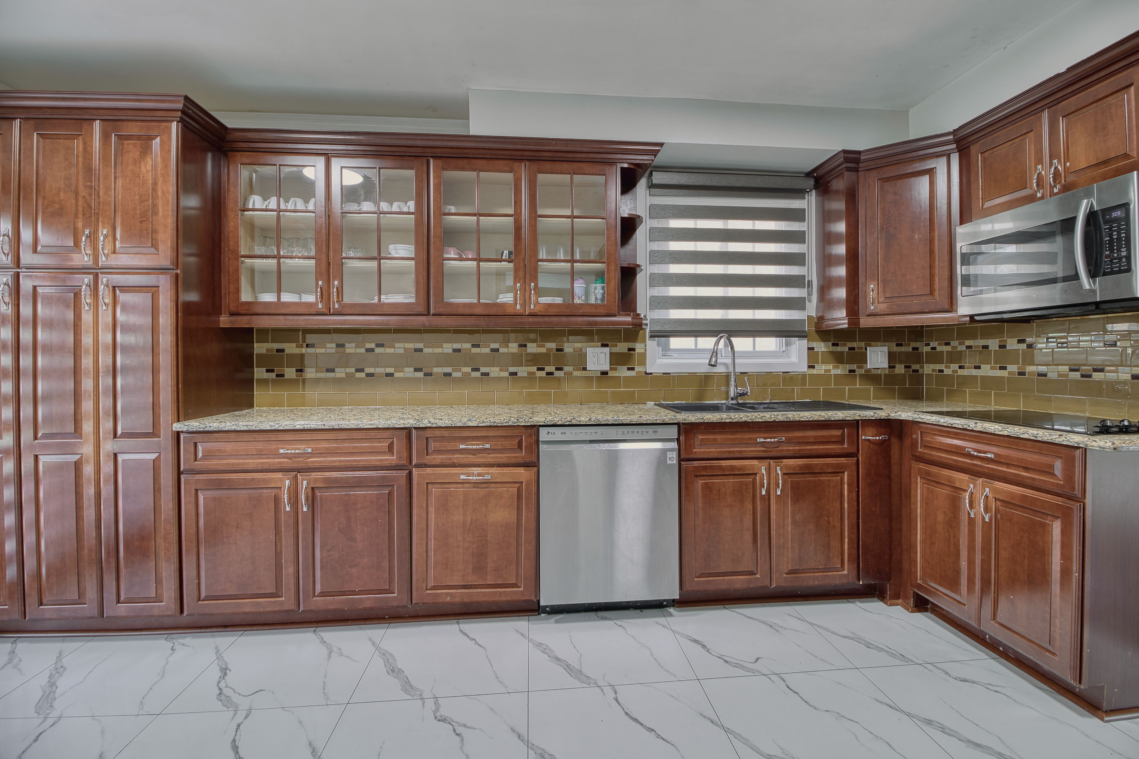 • Custom kitchen with built-in appliances and quartz countertops.