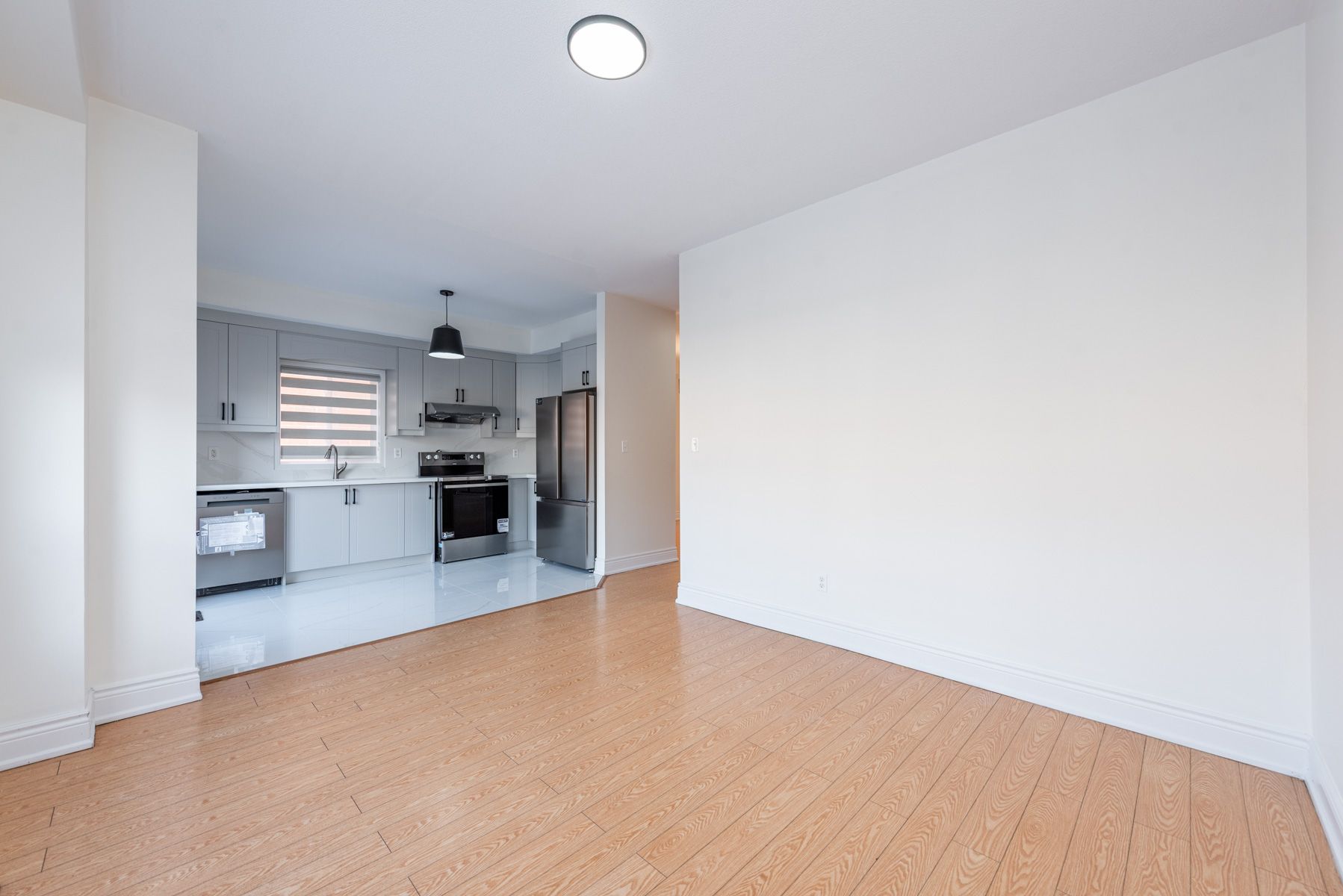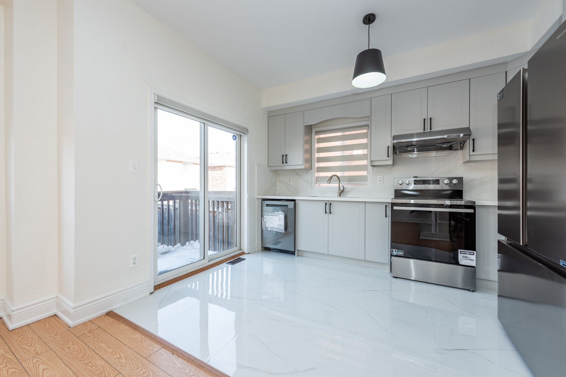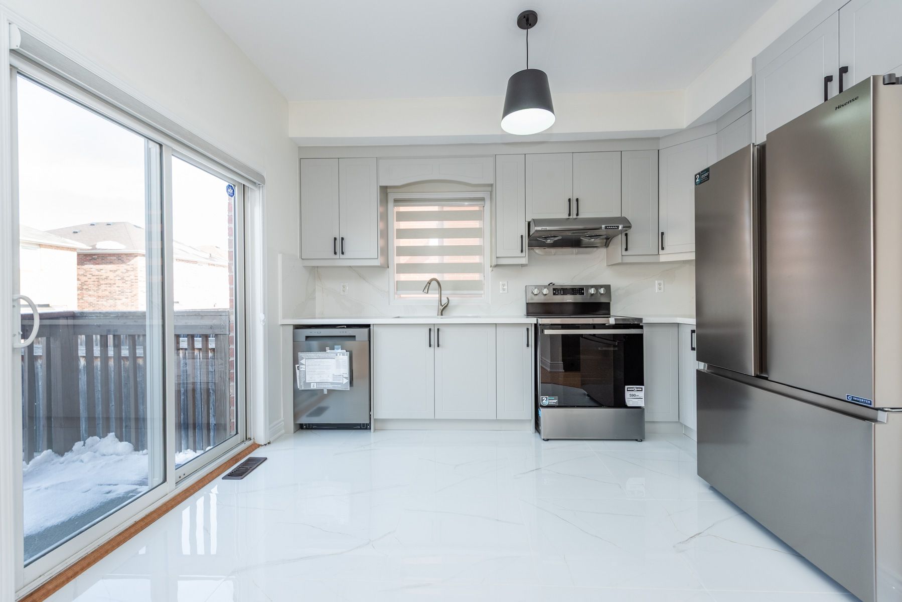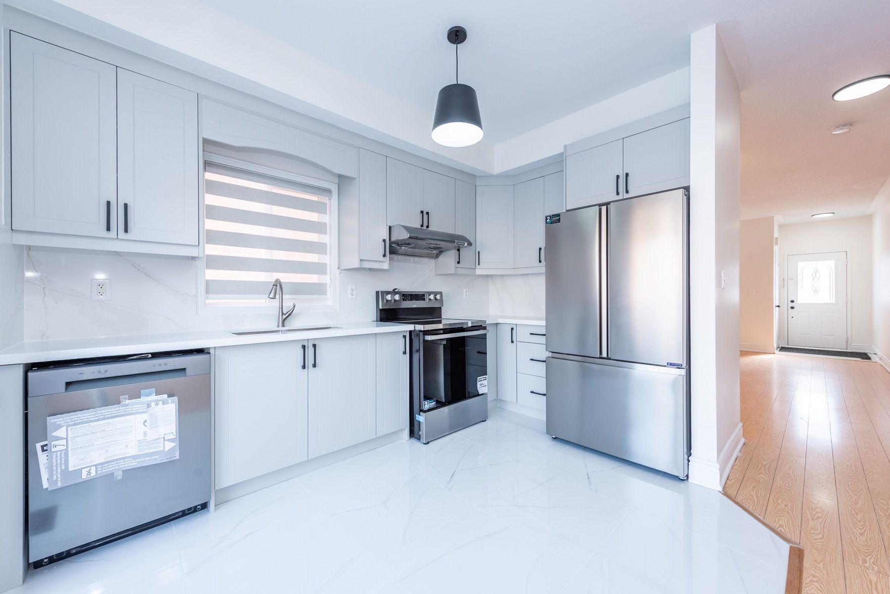 • New kitchen with stainless steel appliances and quartz countertops.