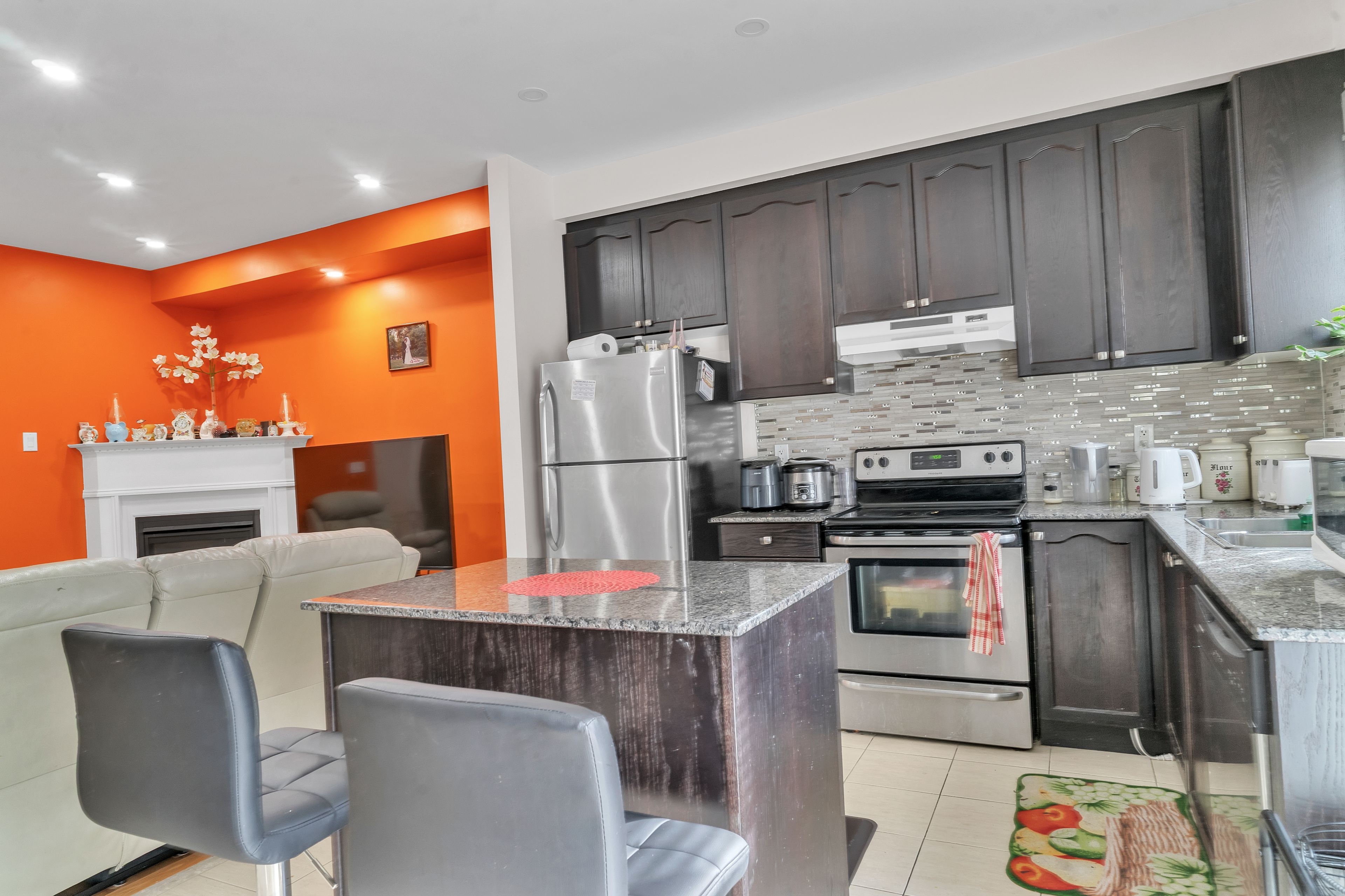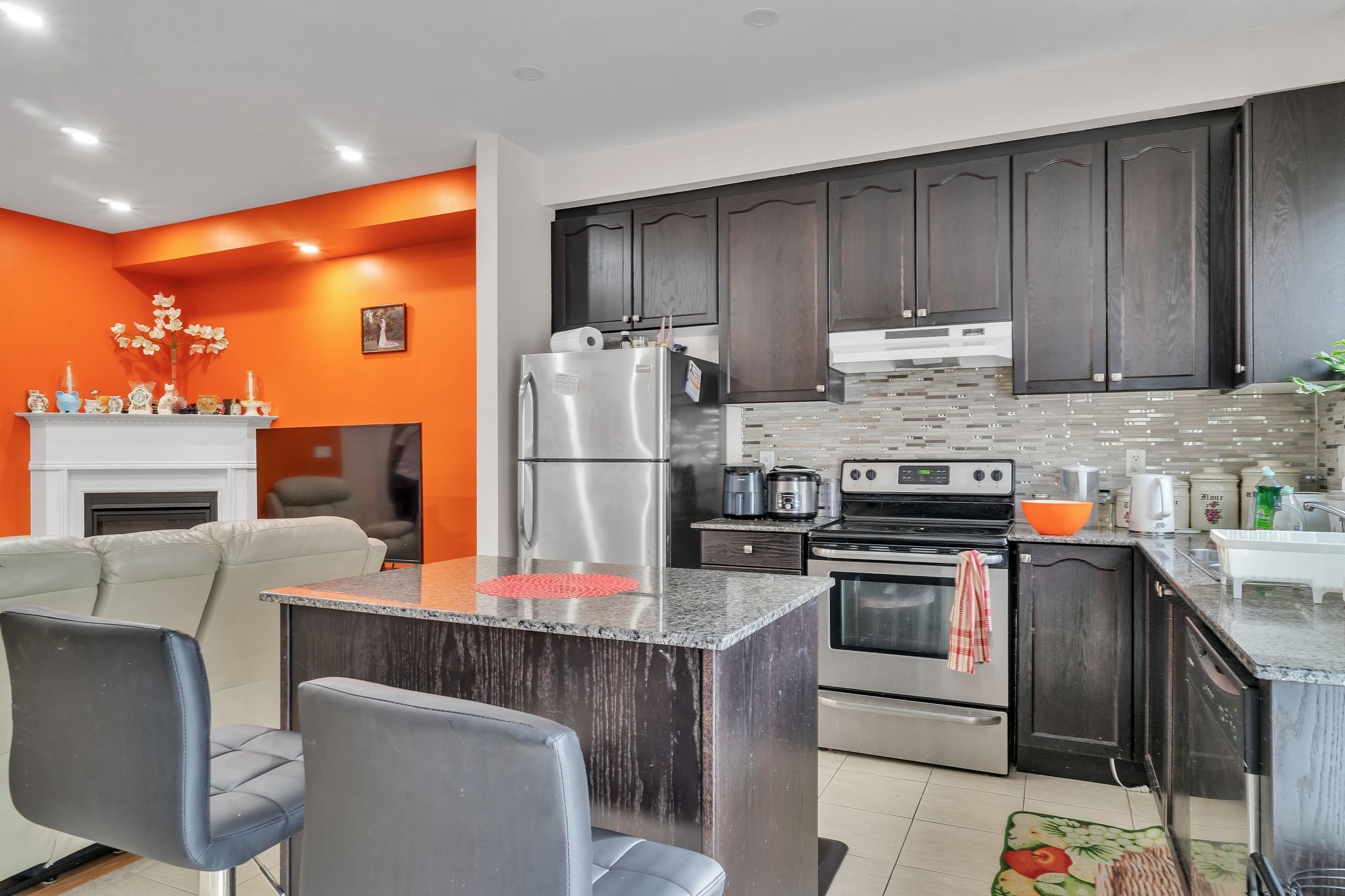 • Kitchen features granite counters and an island for extra space.