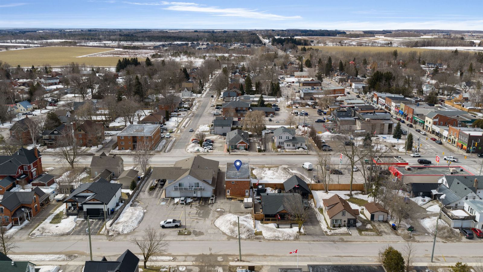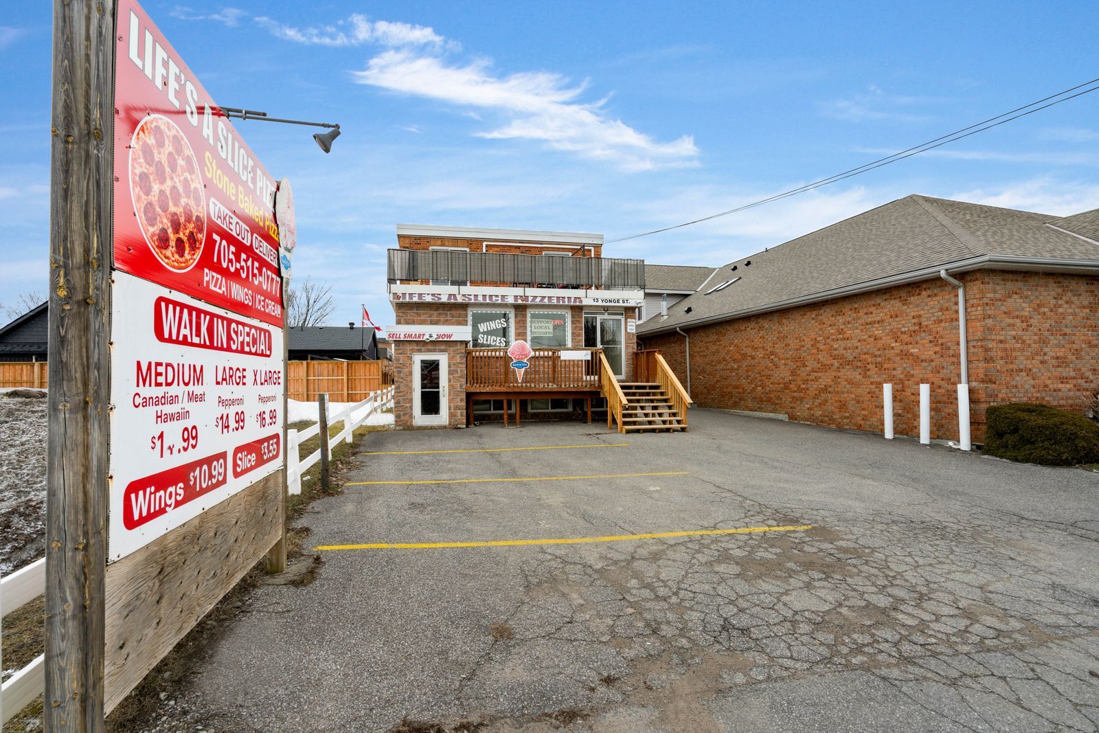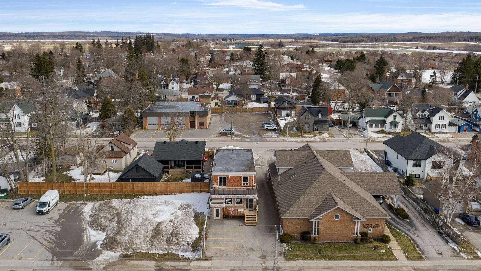 Flexible mixed-use building with downtown exposure, fully equipped commercial space, & upper living quarters! Positioned in the heart of downtown elmvale, this mixed-use commercial building presents a strategic opportunity for investors and business owners seeking visibility, flexibility, and rental potential in a prominent downtown location. Set along a well-travelled corridor, this property benefits from steady local traffic, seasonal cottage country flow, and two-street access. Cg zoning opens the door to a range of permitted uses, including restaurant or take-out, bakeshop, retail, personal service, office, clinic, and more. The main level, previously operated as a successful pizza shop, features a commercial kitchen with included equipment, multiple dining areas with generous seating space, and two washrooms. Upstairs, spacious residential quarters with two bedrooms, one full bathroom, and a private deck create flexibility for owner occupancy or future rental use. A finished basement adds even more usable space with a den, office area, extensive storage, and two bathrooms, while parking for 12 vehicles, three hot water tanks, multiple furnaces, and 400 amp service further strengthen the long-term value of the property. This is a smart downtown elmvale opportunity for investors and business owners seeking a well-positioned property with commercial presence and residential versatility.