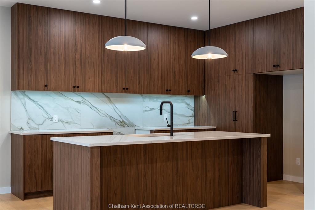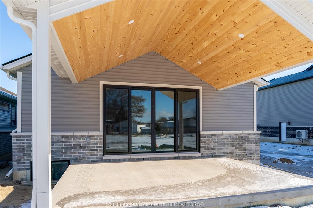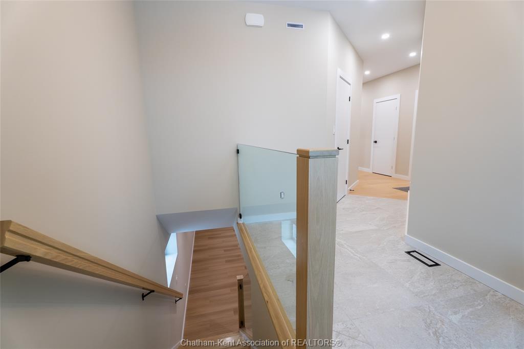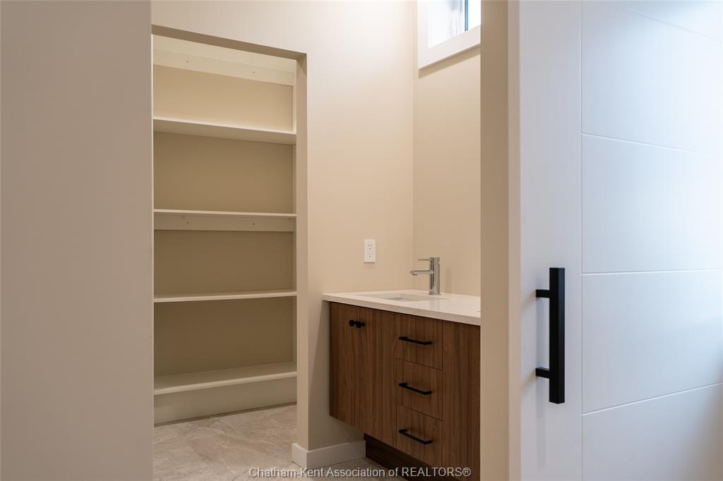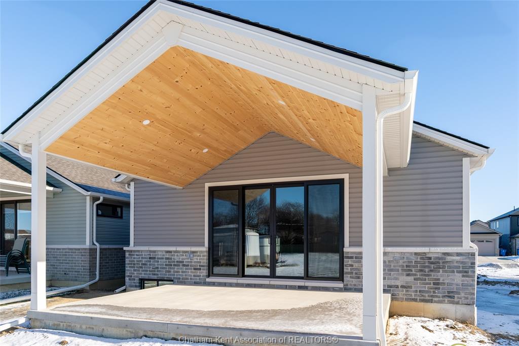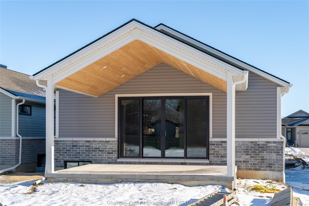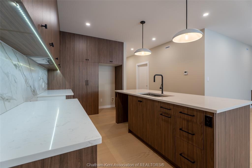 Brand new ranch-style home showcasing the epitome of modern design and everyday convenience. Thoughtfully finished with numerous custom details, including live-edge shelving and a custom front bench that set the tone the moment you arrive. The main level offers a stunning open-concept layout with cathedral ceilings and an impressive 18-foot patio door leading to a covered rear porch. The jaw-dropping kitchen features sleek modern cabinetry, quality finishes, and a massive walk-in pantry—perfect for entertaining and everyday living. A convenient main-floor powder room adds to the functionality. The primary bedroom retreat is located on the main level and includes a full ensuite with heated floors, a no-touch toilet, and a spacious walk-in closet. The main-floor family room also features an electric fireplace, creating a warm and inviting space. A striking modern glass staircase leads to the fully finished lower level, offering a huge recreation room complete with an electric fireplace with multiple settings, a bar and sink area, two large bedrooms, and a third full bathroom—ideal for guests or family living. This home blends contemporary style with comfort and thoughtful design throughout. A must-see new build that truly stands out.