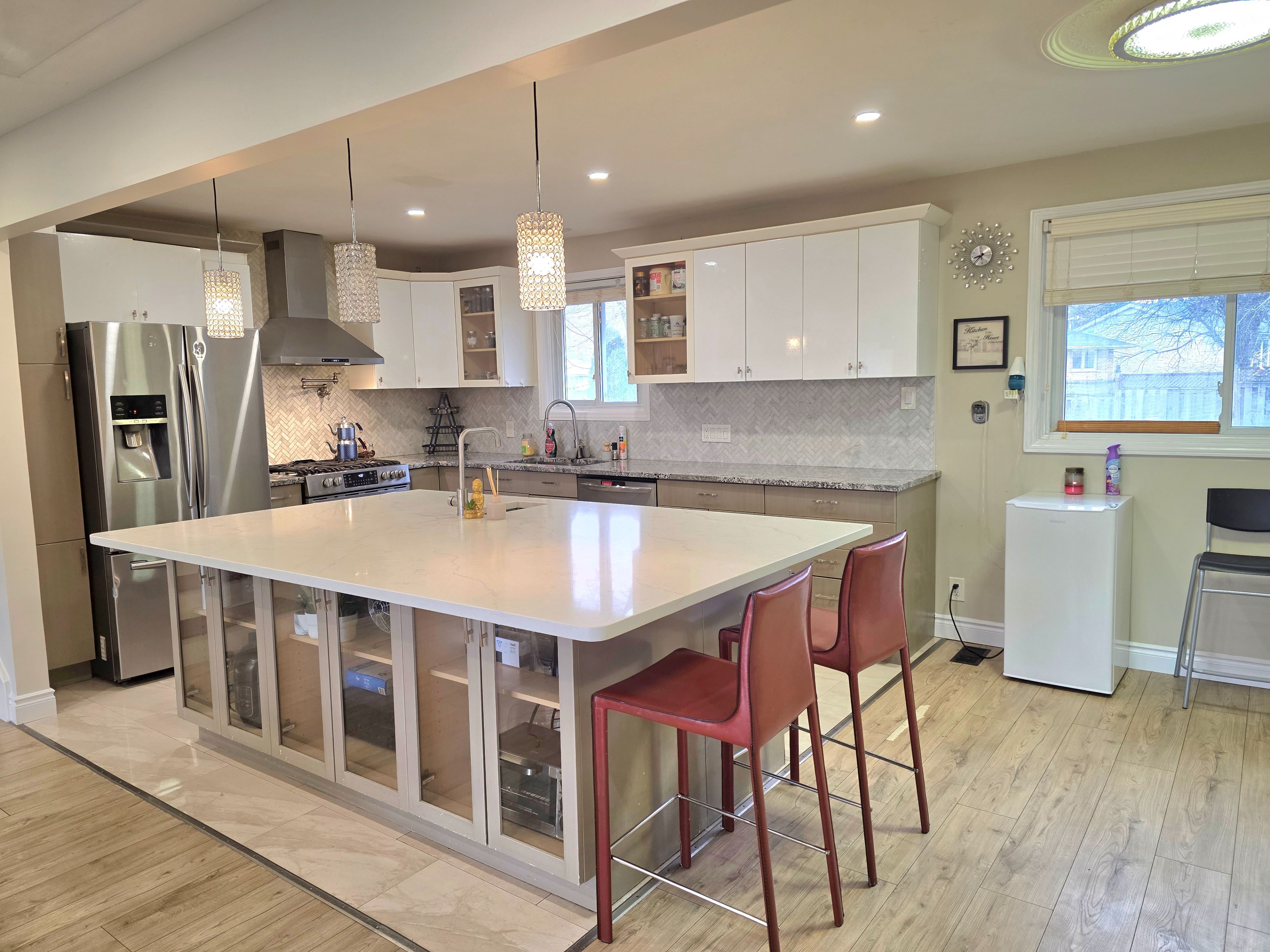 Welcome to this beautifully updated home in the sought-after heritage park neighbourhood of kitchener. Ideally located just minutes from top-rated schools, parks, shopping, and only a short drive to the renowned university of waterloo, this property offers both convenience and lifestyle. This home has been extensively renovated and thoughtfully upgraded throughout. A full renovation completed in 2019 brings modern finishes and functionality, complemented by recent updates including a new roof (2023), furnace (2015), main floor washroom (2026), and fresh painting (2026). The kitchen is a true highlight, featuring a large 3cm countertop, pot filler, abundant storage, and sleek finishes perfect for everyday living and entertaining. Enjoy upgraded lighting throughout with pot lights both inside and exterior, enhancing the home's ambiance and curb appeal. Additional improvements include new entry doors (2025) and basement entry door (2025), adding both style and security. All major appliances including fridge, stove, washer, and dryer (2019) are included, along with a security camera system for added peace of mind. Situated on a quiet crescent, this property offers a perfect blend of modern upgrades, functional layout, and prime location - an ideal opportunity for families or investors alike.
