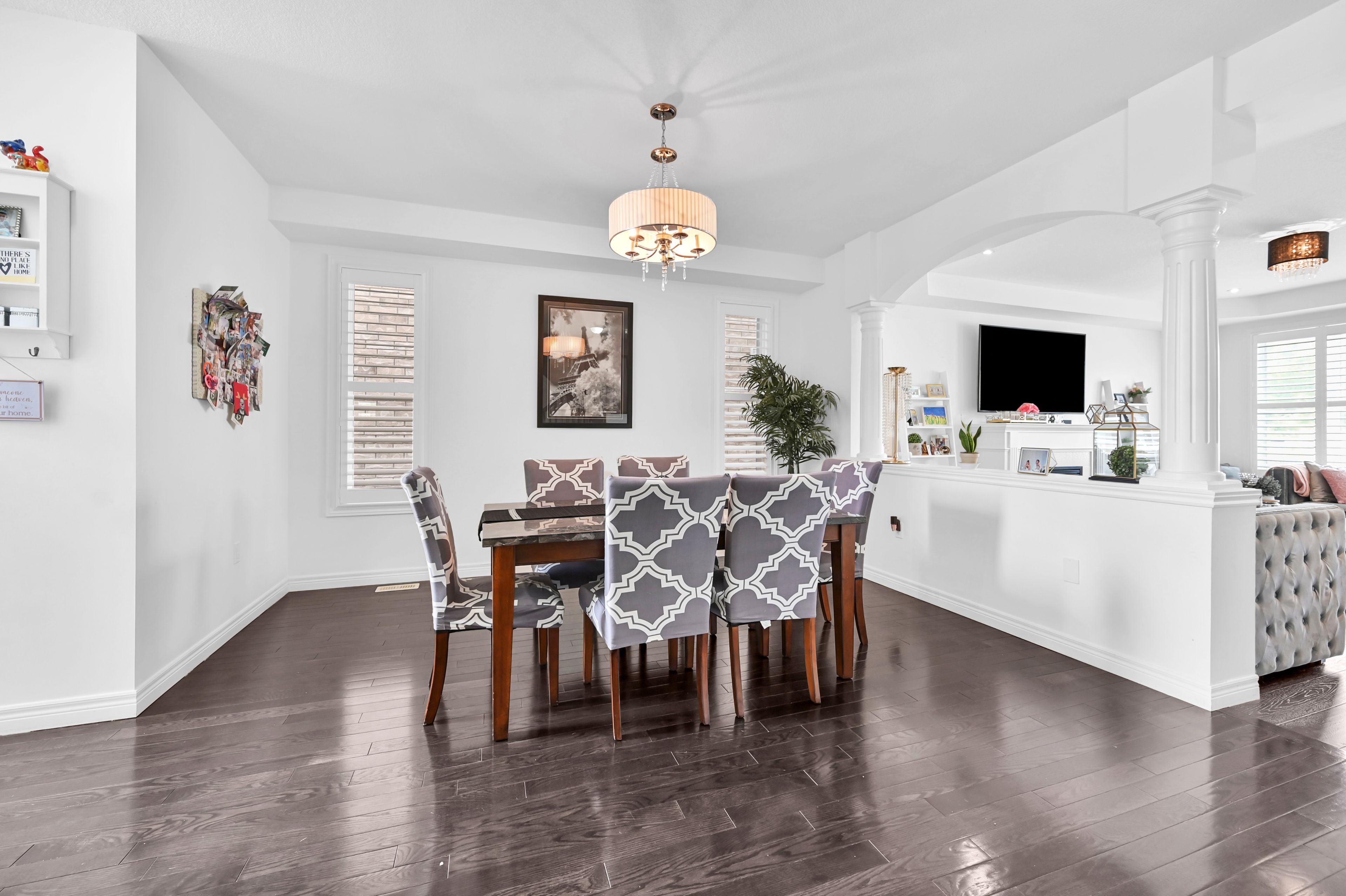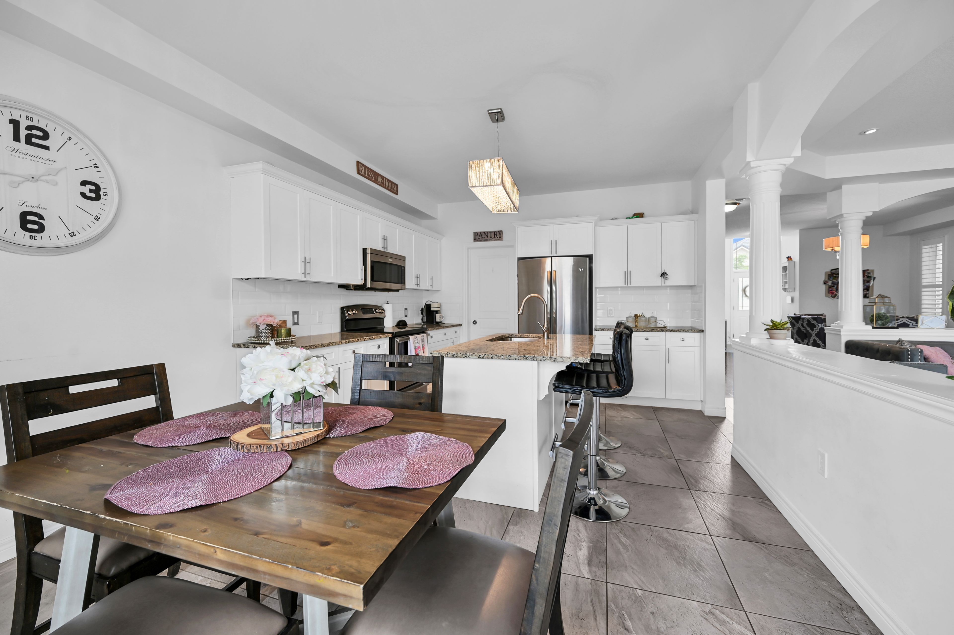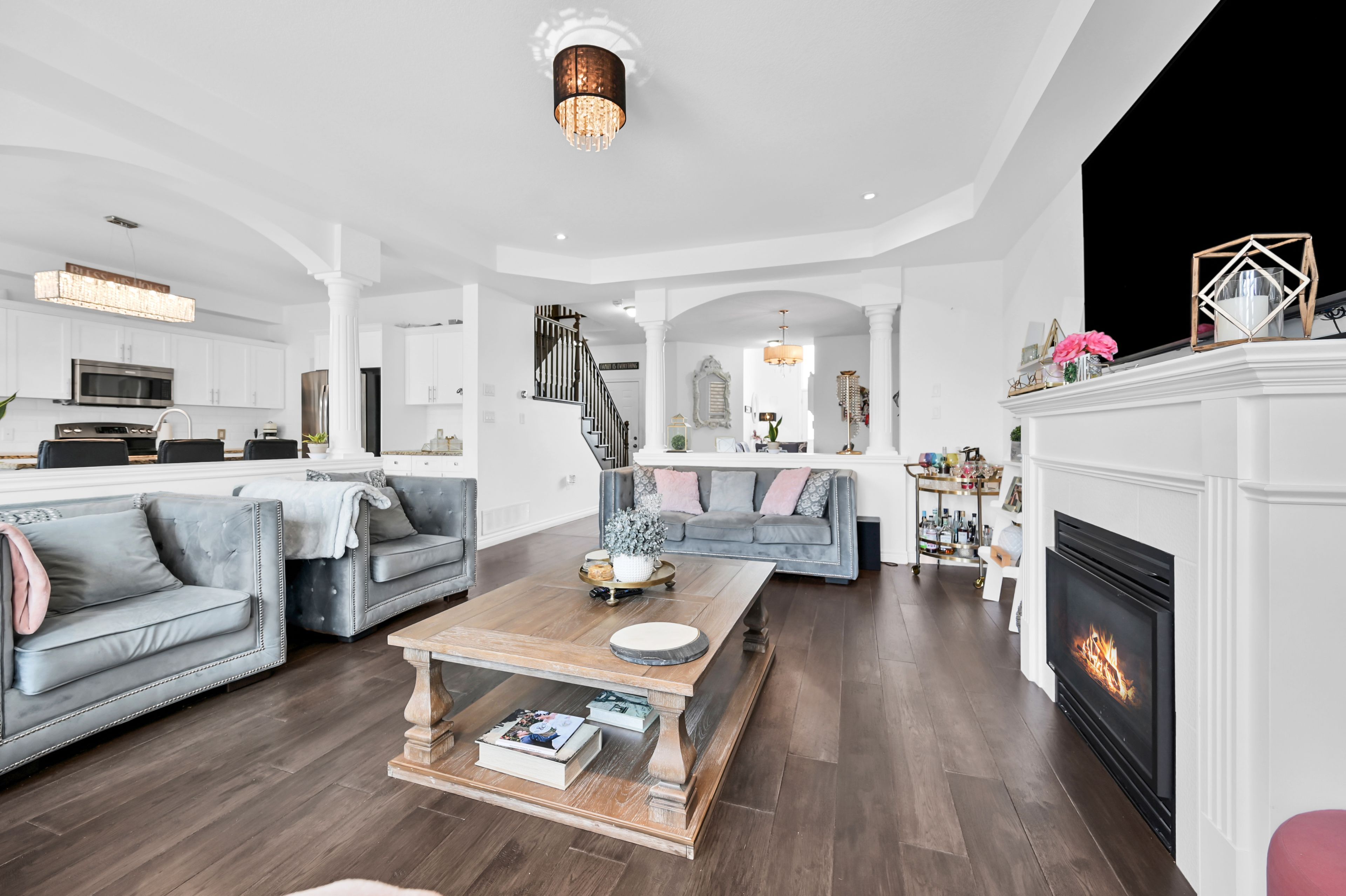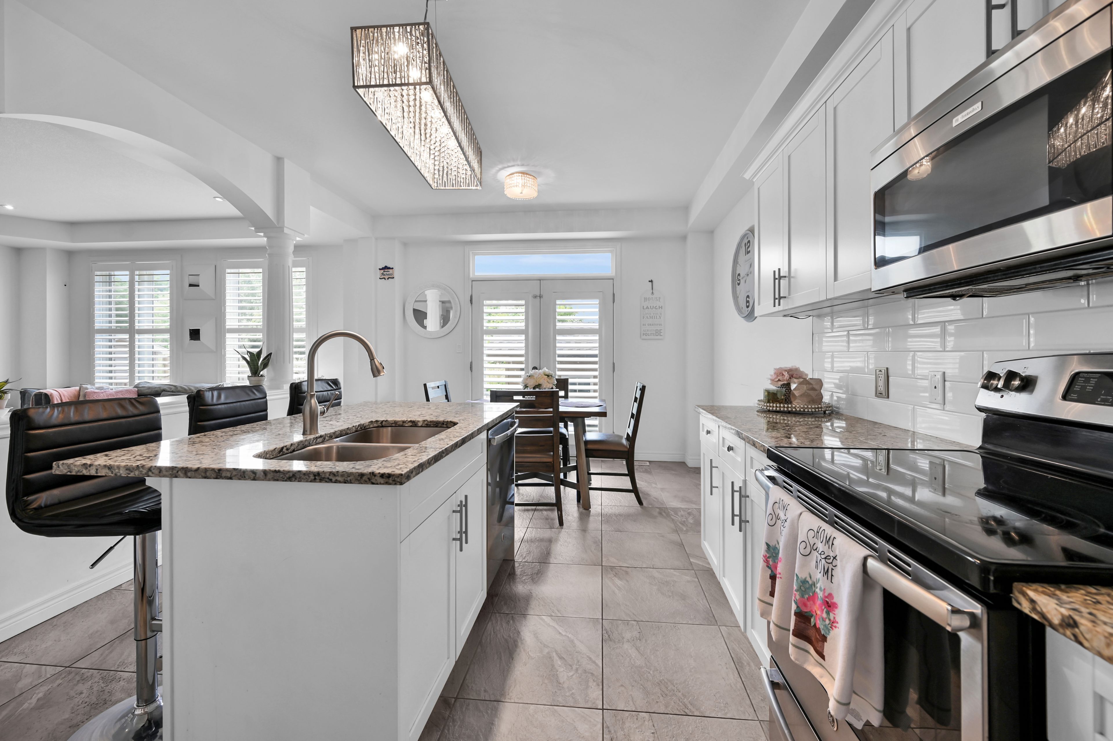 • Open concept design features hardwood and large ceramic tile throughout.