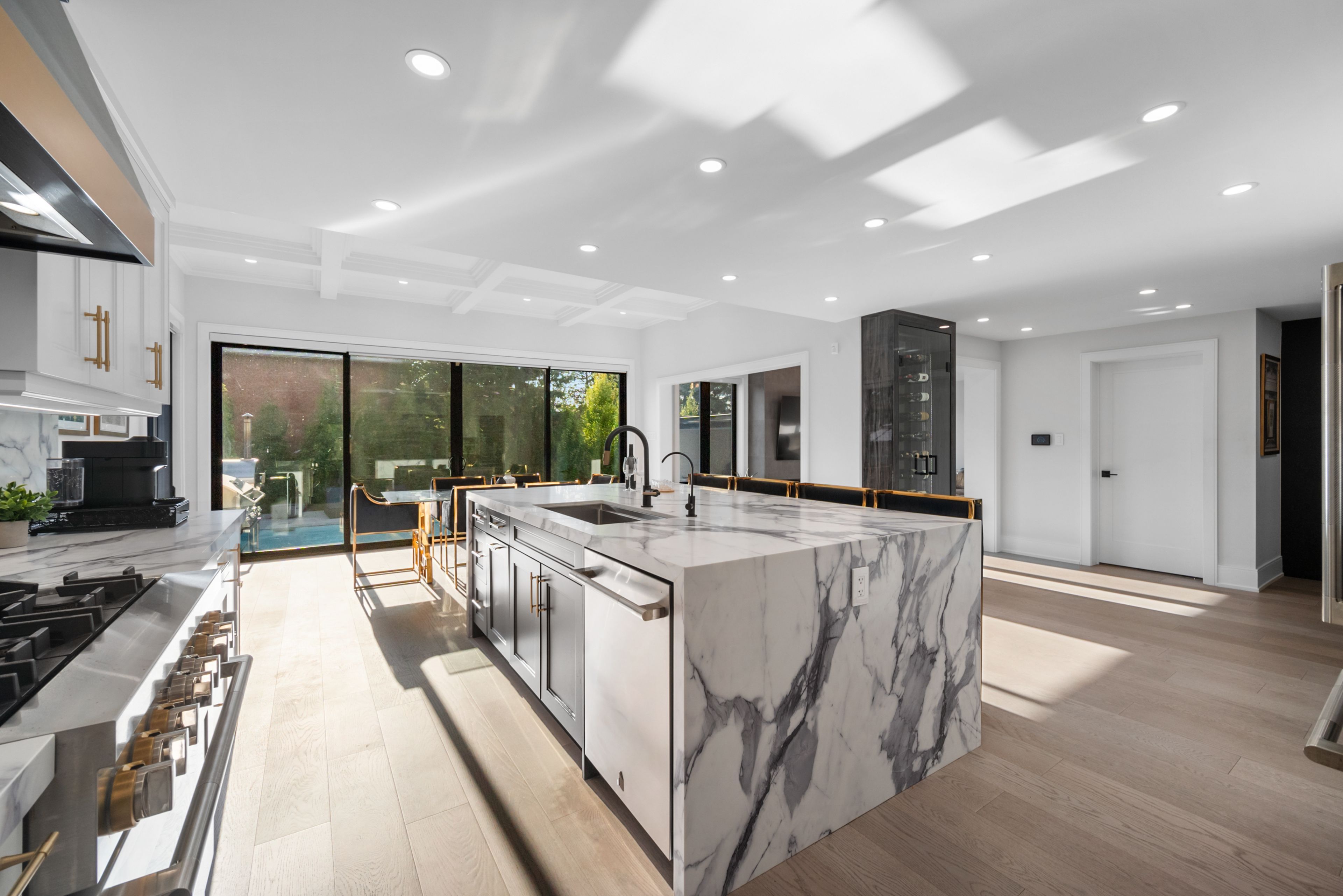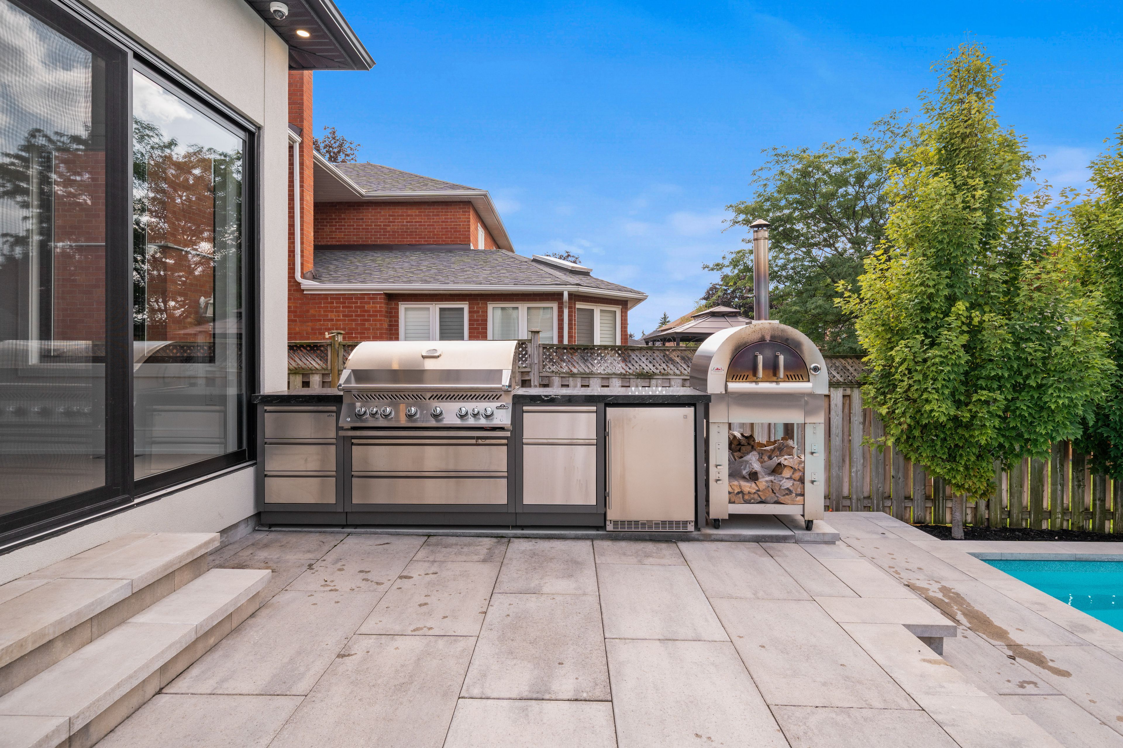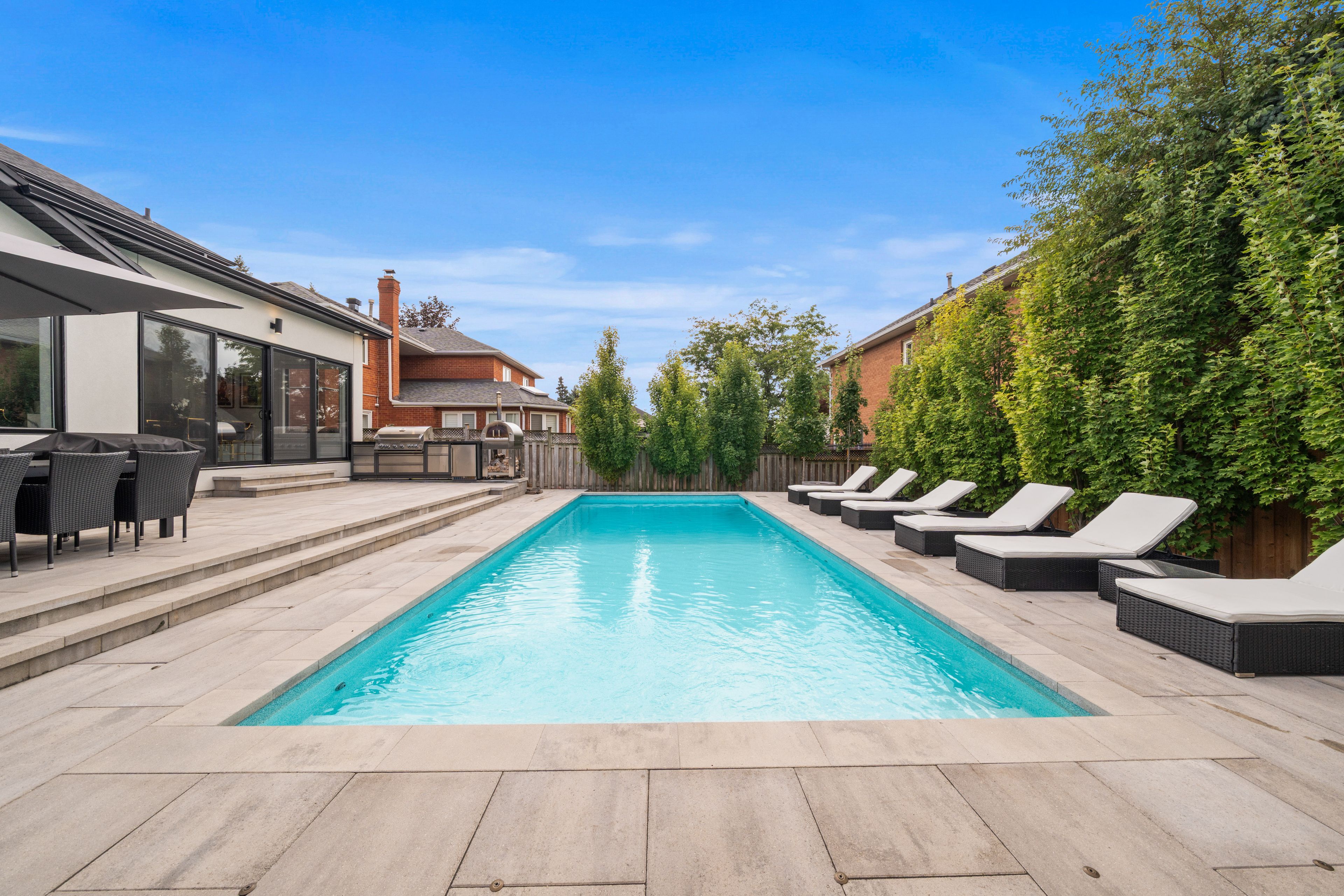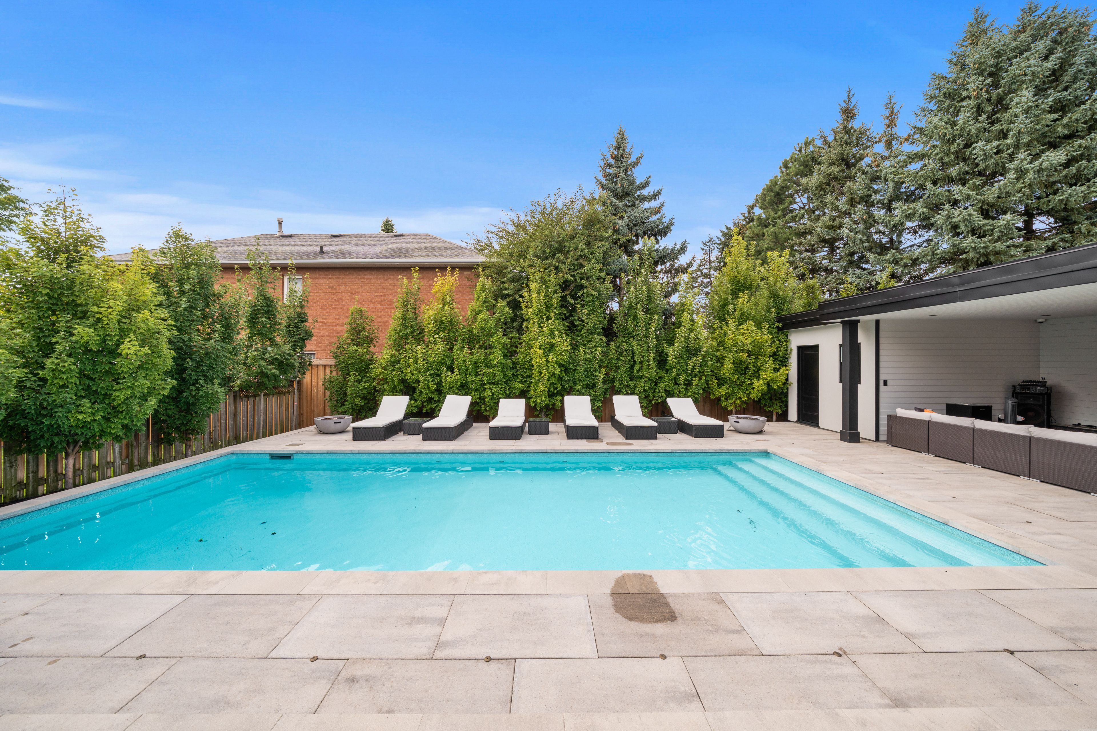 This custom build weston downs residence embodies modern luxury and thoughtful design. Offering 4+1 bedrooms and 5 bathrooms, the home features hardwood flooring throughout three levels, new electrical systems, hvac system, plumbing and water filter system. Over 150 led potlights and a state-of-the-art control 4 home automation system for seamless comfort and convenience. The main floor balances entertaining and everyday living. A formal dining room with servery and walk-in pantry complements the chef's kitchen with a striking centre island, german quartz counters and backsplash and premium appliances. The sun-filled breakfast area opens to the pool, while the family room impresses with a vaulted ceiling and a 74" dimplex linear electric fireplace. Upstairs, the primary suite provides a private retreat with custom built-ins and a spa-inspired ensuite with oversized walk-in shower and free-standing soaker tub. Three additional bedrooms are generously sized, including one with an ensuite and custom cabinetry. The lower level is ideal for entertainment, featuring a bedroom, recreation room, wet bar and custom home theatre with a 120" motorized screen and klipsch surround sound. Superior soundproofing enhances the basement and all bathrooms throughout the house for privacy and comfort. Outside, professionally landscaped grounds include a 16' x 34' heated saltwater pool with stone surround, built-in kitchen with granite counters, fridge and napoleon gas bbq, plus a cabana anchored by a barbara jean linear gas fireplace with granite surround. Additional highlights include a new driveway, garage doors, epoxy garage floor and hunter irrigation system. This weston downs residence blends timeless sophistication with modern amenities, offering an unparalleled lifestyle for discerning buyers.