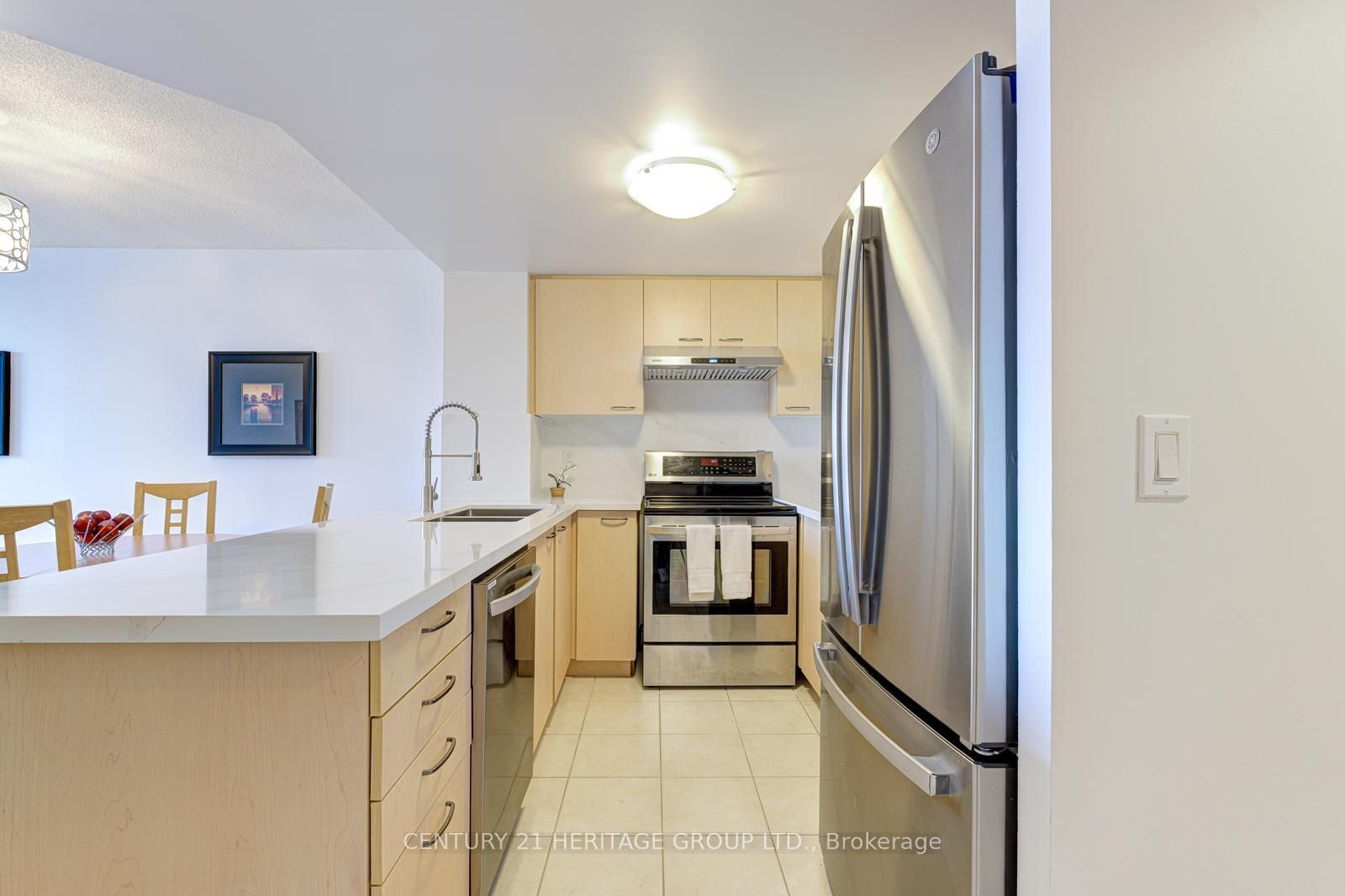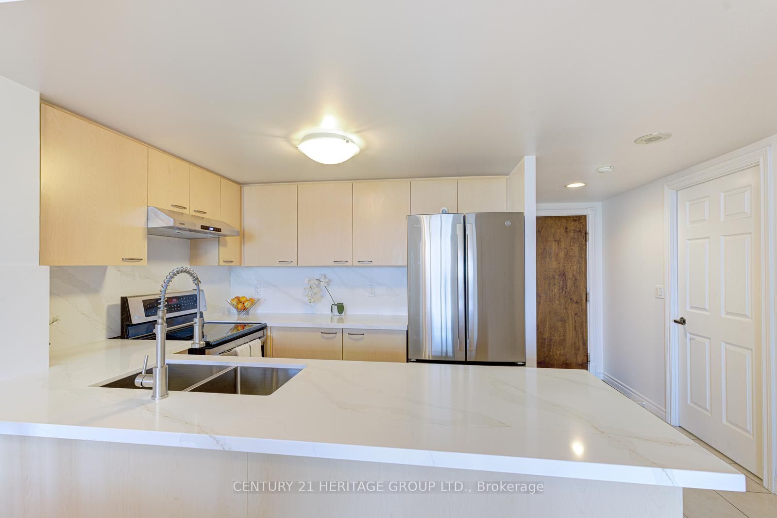 Beautiful sun-filled and bright unobstructed 1 bedroom, 1 bathroom unit at derby tower in prime highly accessible and desirable location. Unit has been updated. Enjoy modern kitchen with brand-new quartz counter top & backsplash, new stainless steel appliances, bathroom renovated from top to bottom, freshly painted throughout and much more. Living room has a nook with a wood panel accent wall perfect for working from home. Oversized walk-in closet in the primary bedroom. Quiet building with great amenities including gym, sauna, party room, 24hr concierge, ample visitor parking, short distance to fine restaurants, shopping center, grocery stores, highway 407, 404 & viva public transportation. Heat, hydro, water, and 1 parking space included in maintenance cost.