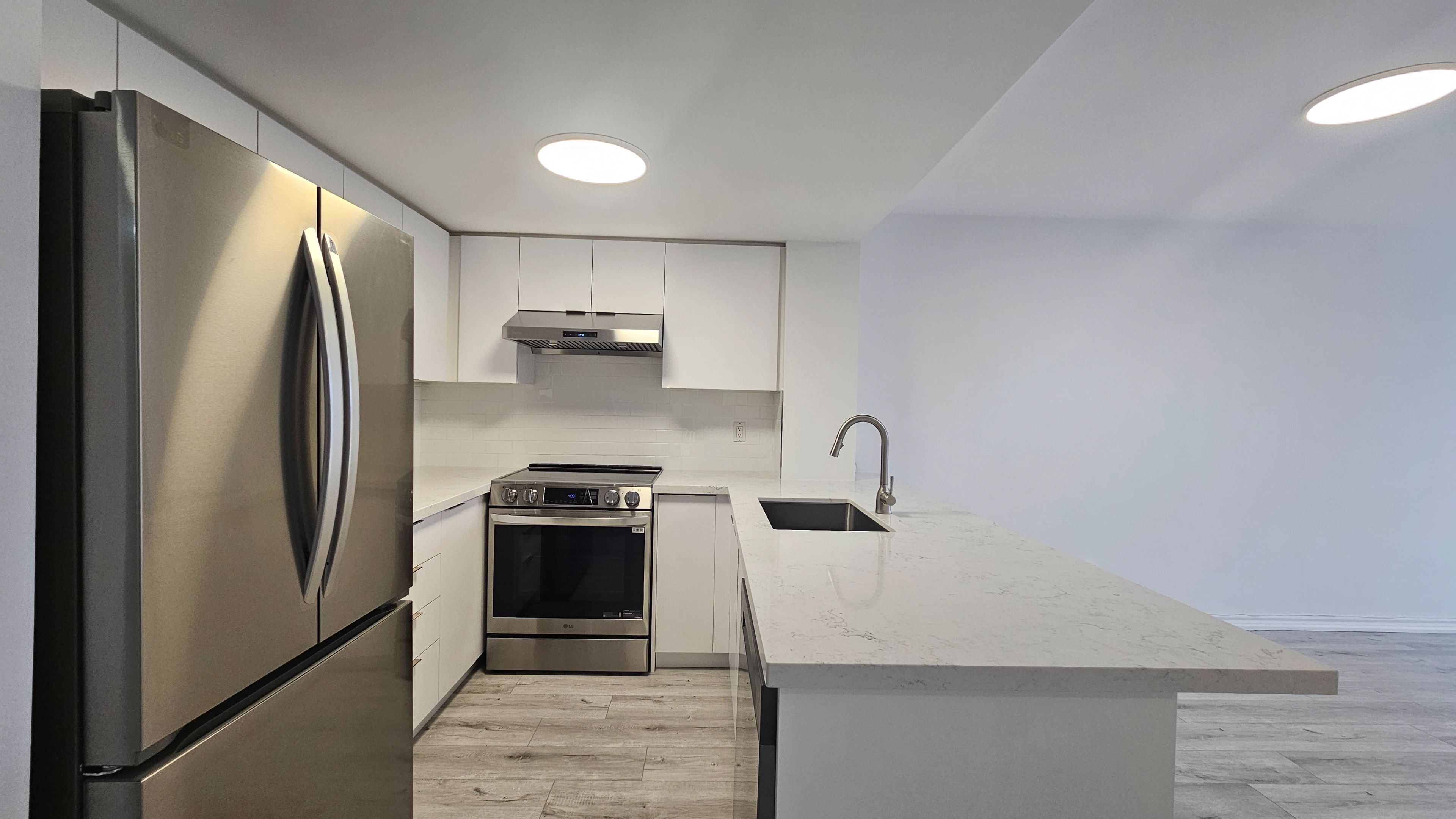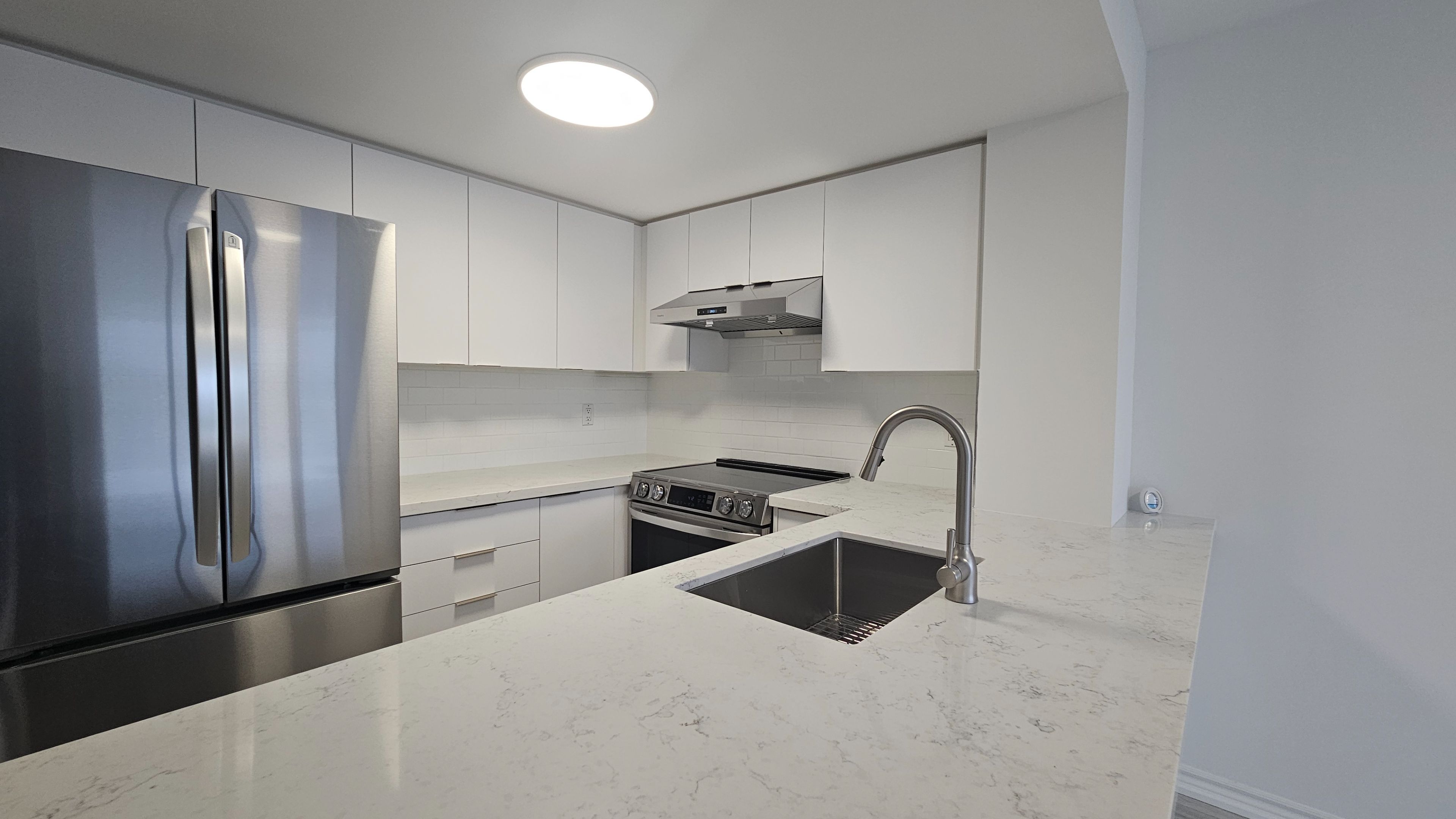 • New stainless steel appliances and quartz countertops in the kitchen.