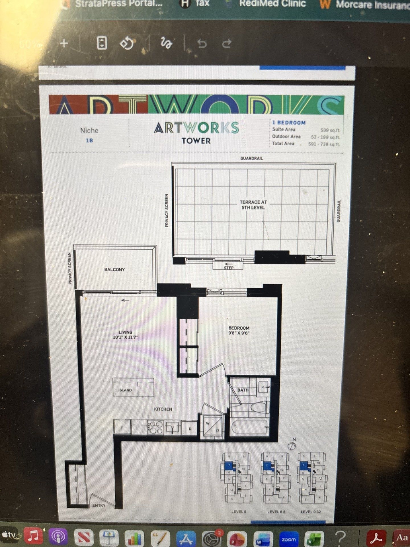 Artworks tower**suite area 539 sq ft** outdoor area 52 sq ft** total area 591 sq ft.**one bedroom**balcony** see floor plan** great location** short walk to downtown toronto**quartz countertop** stainless steel appliances**mega gym w/ indoor and outdoor spaces**party room** outdoor terrace,arcade/games rm, fun kids zone, work lounge/meeting rm**no need to drive**
