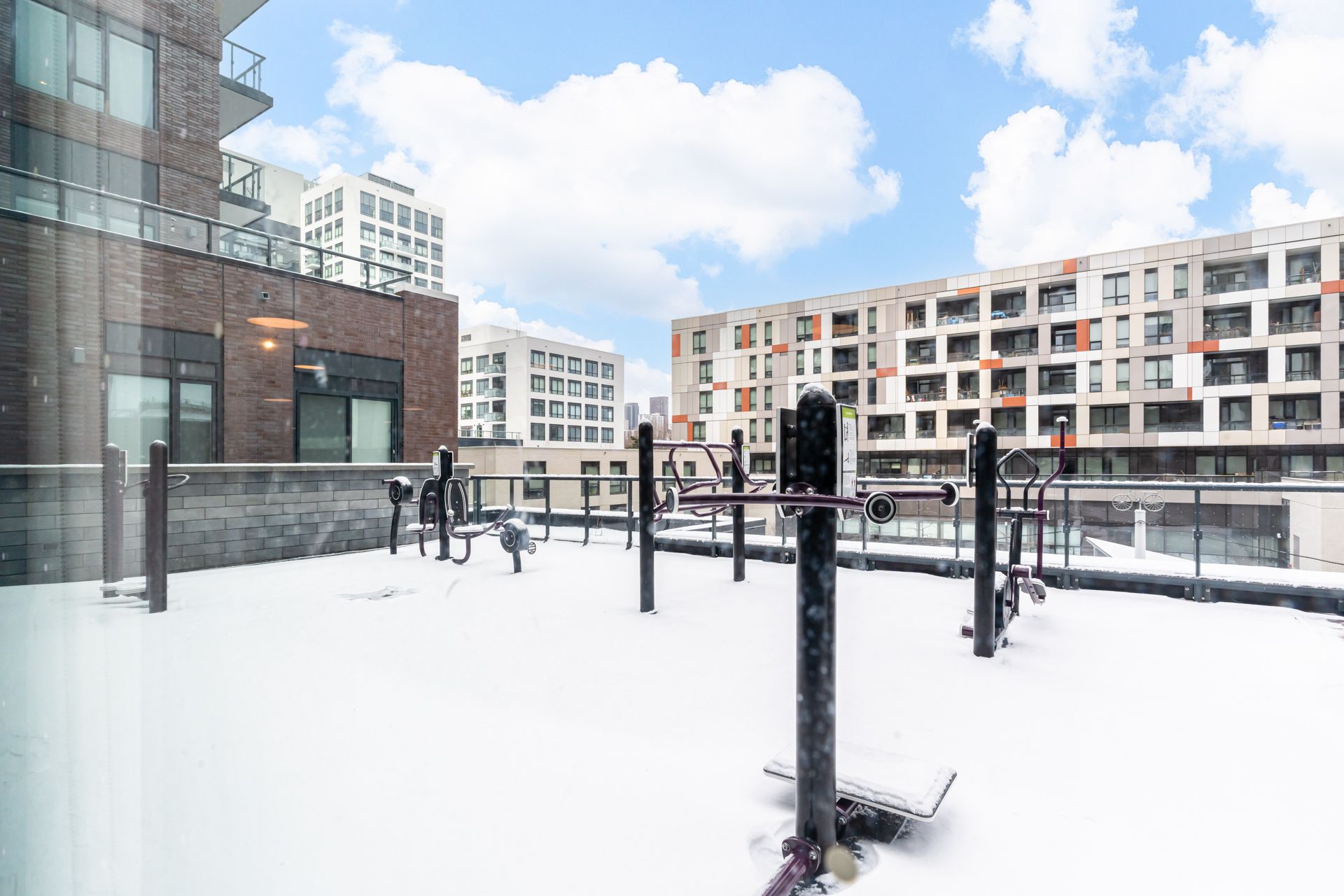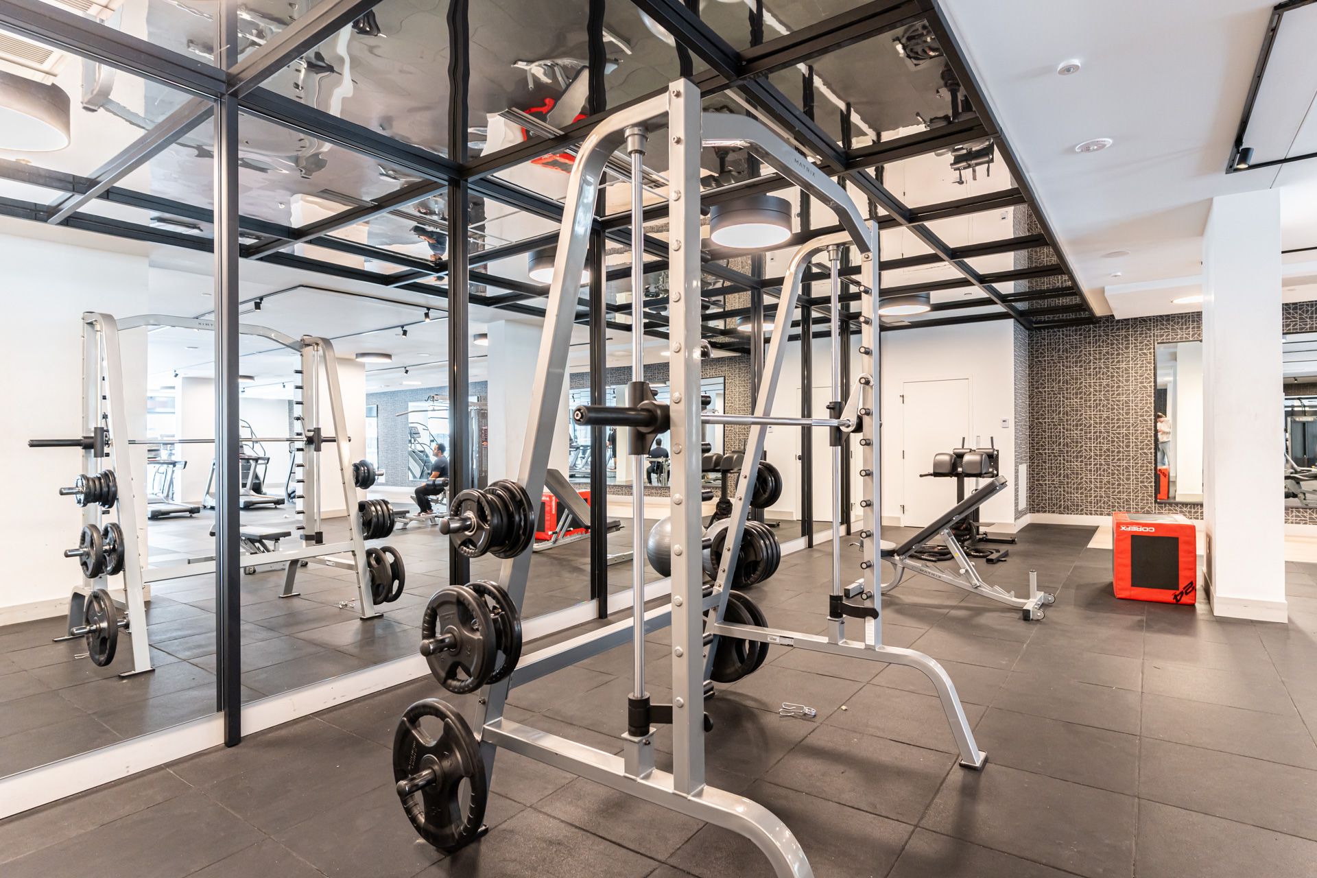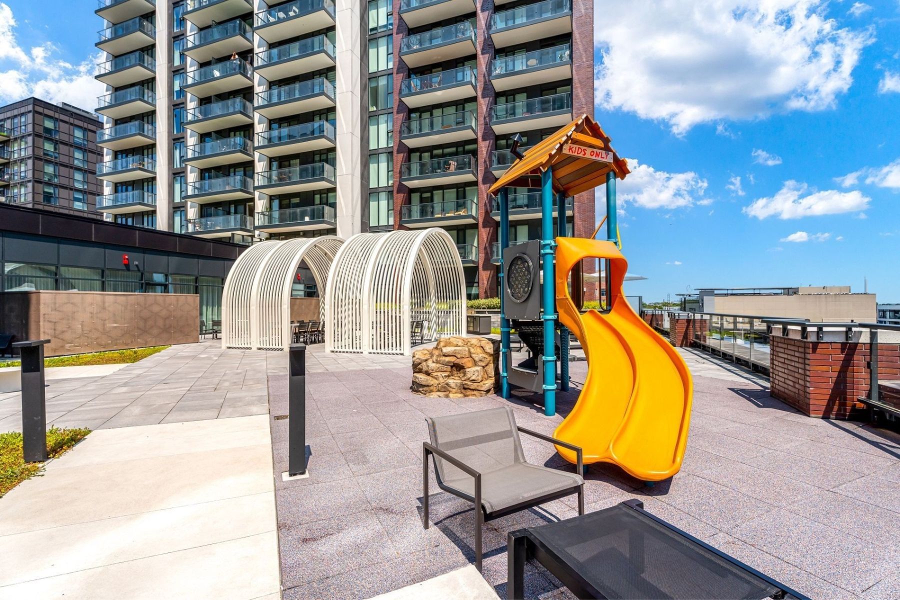 • Building features multiple amenities including a gym, party room, and arcade.