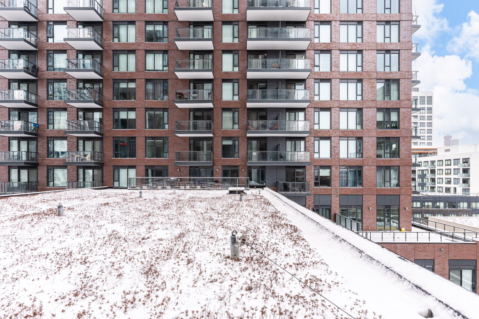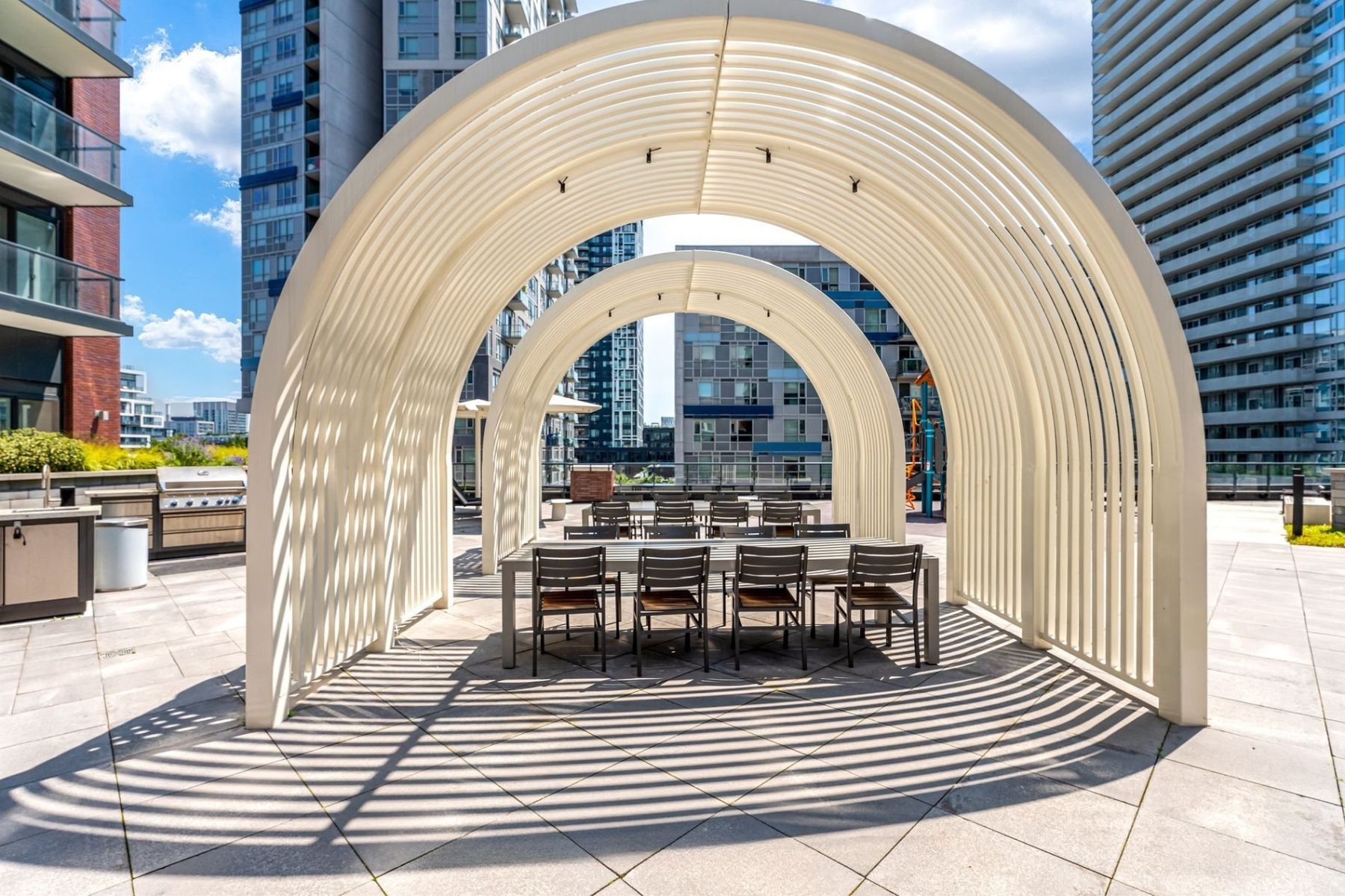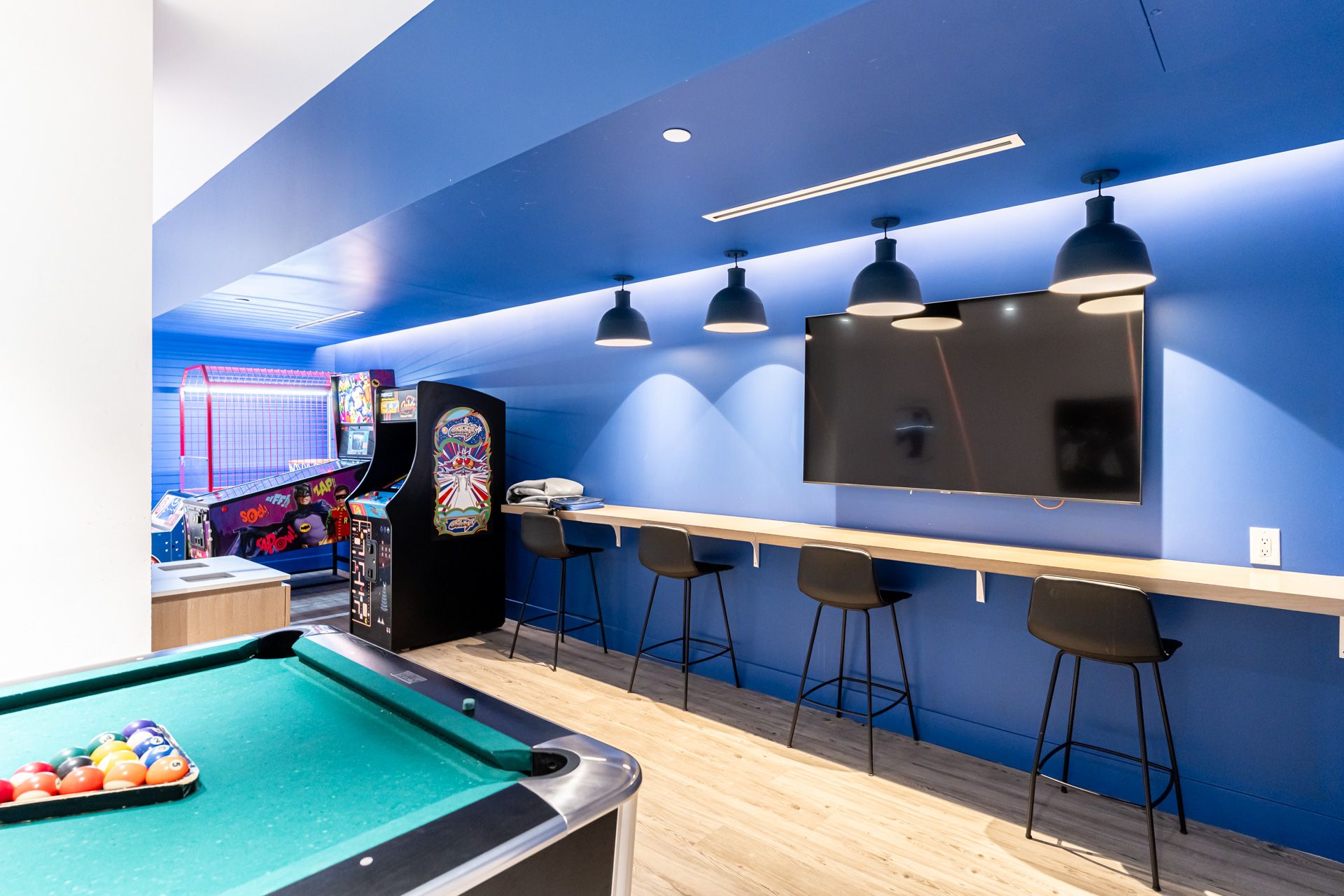 • Building features multiple amenities including a gym, party room, and arcade.