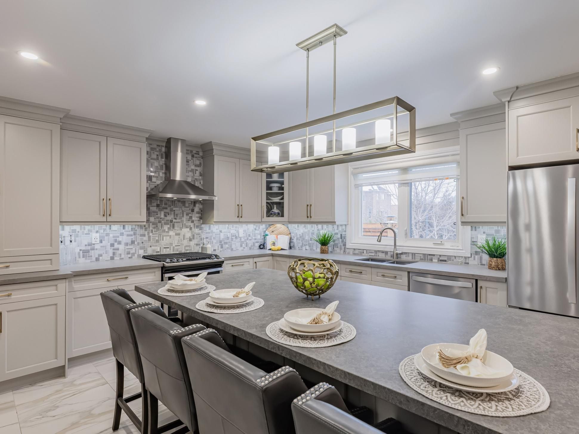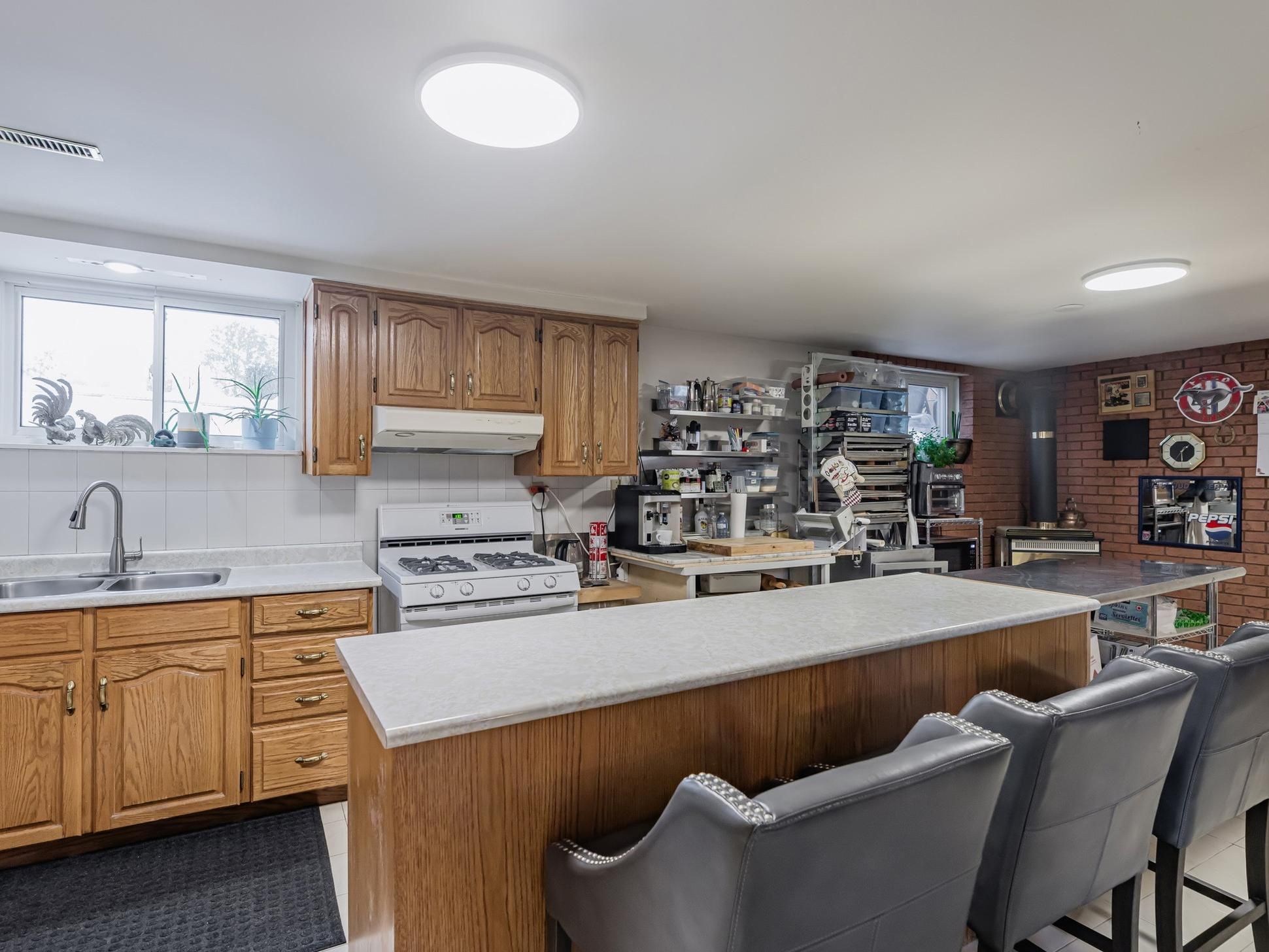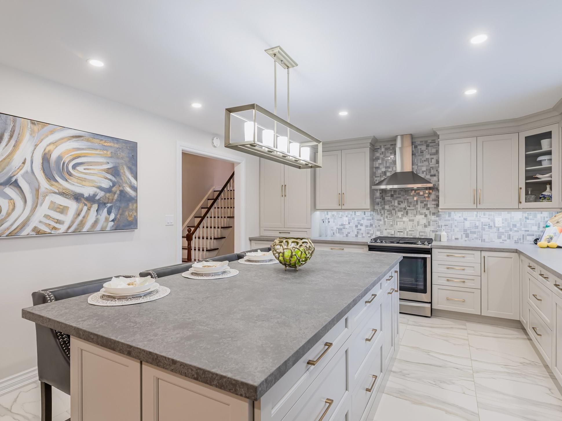• Stylish kitchen with large island and plenty of cabinetry for enthusiasts.