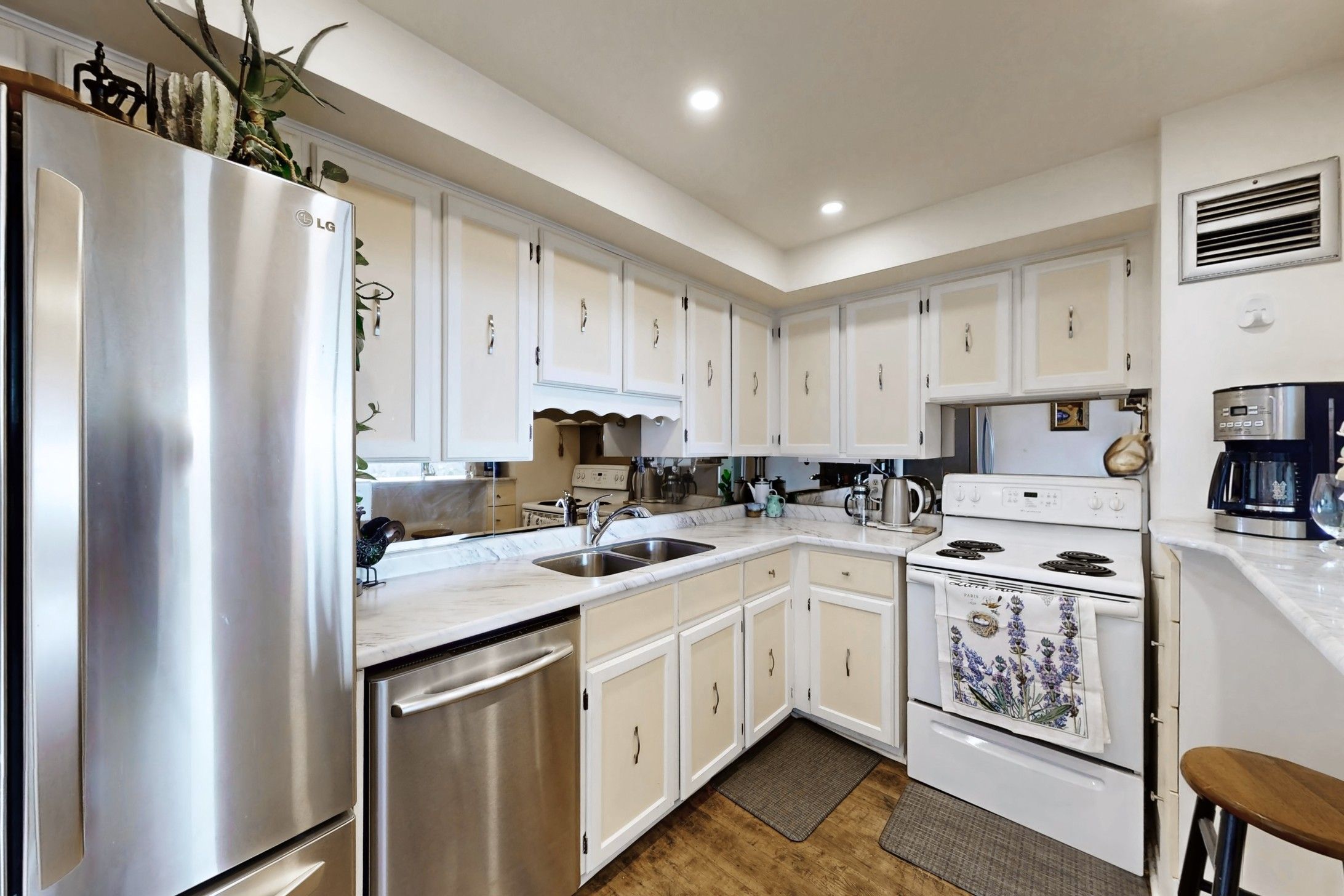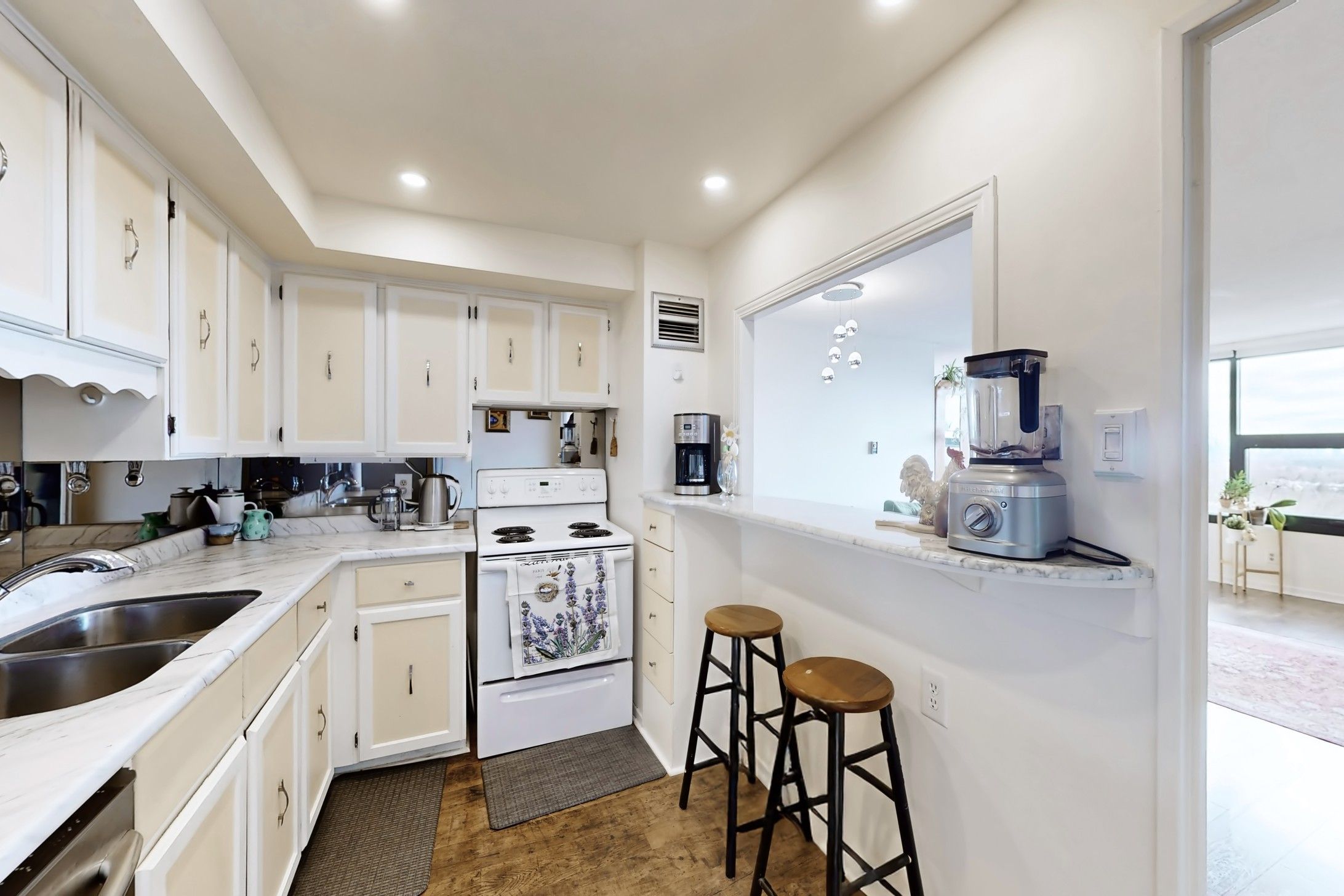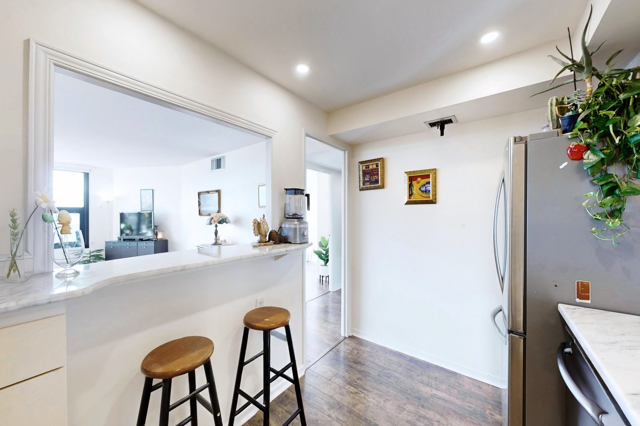 • Open-concept living area flows into a kitchen with breakfast bar.