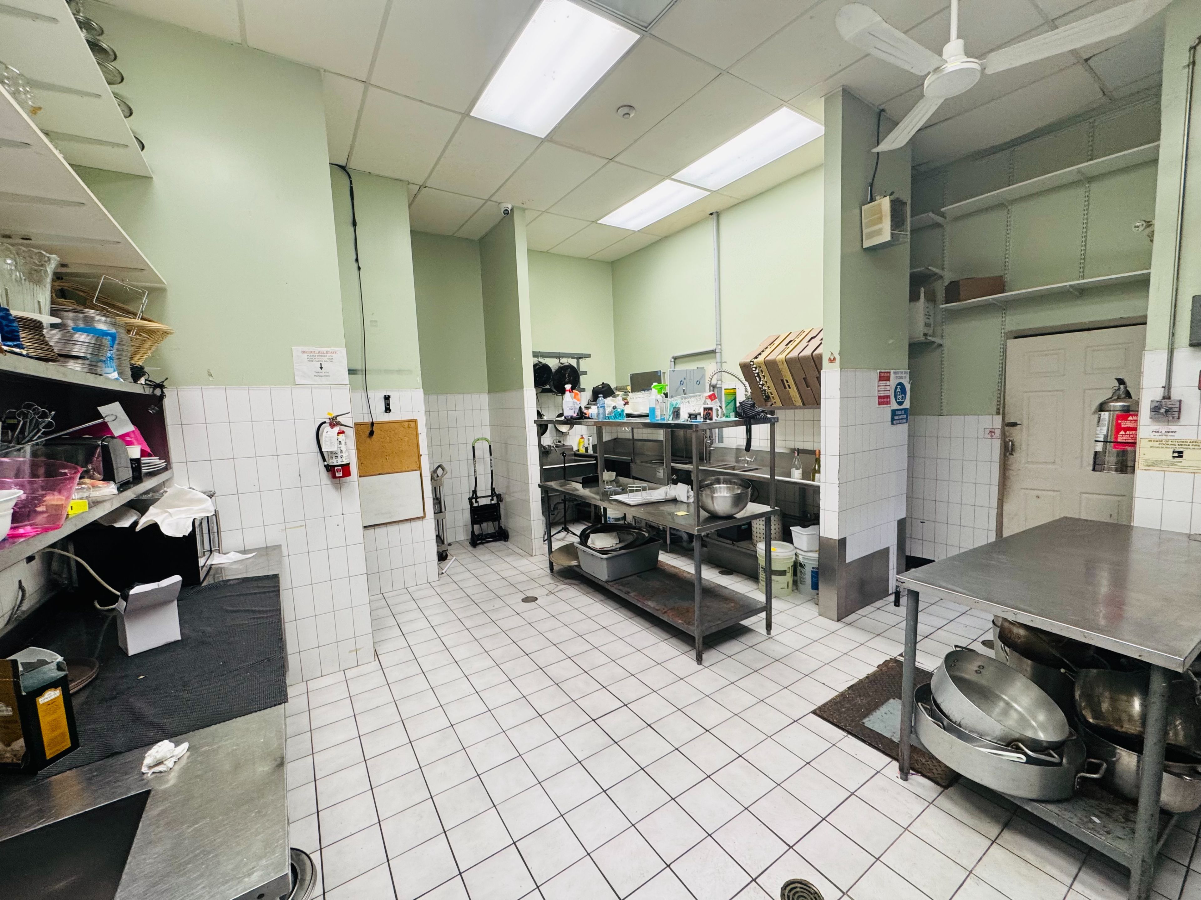 • Large commercial kitchen with essential appliances and ample parking available.