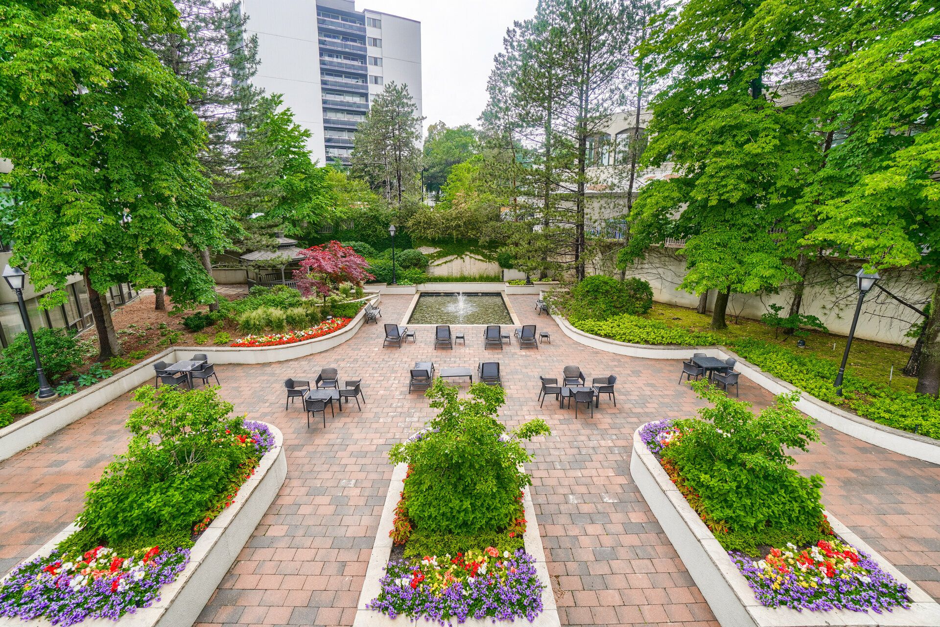 • Resort-like amenities include pool, sauna, gym, and sports courts.