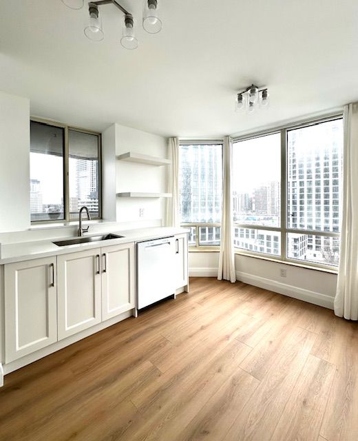 • Modern, never-used kitchen with quartz counter and window above the sink.