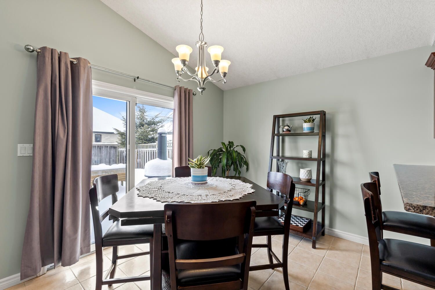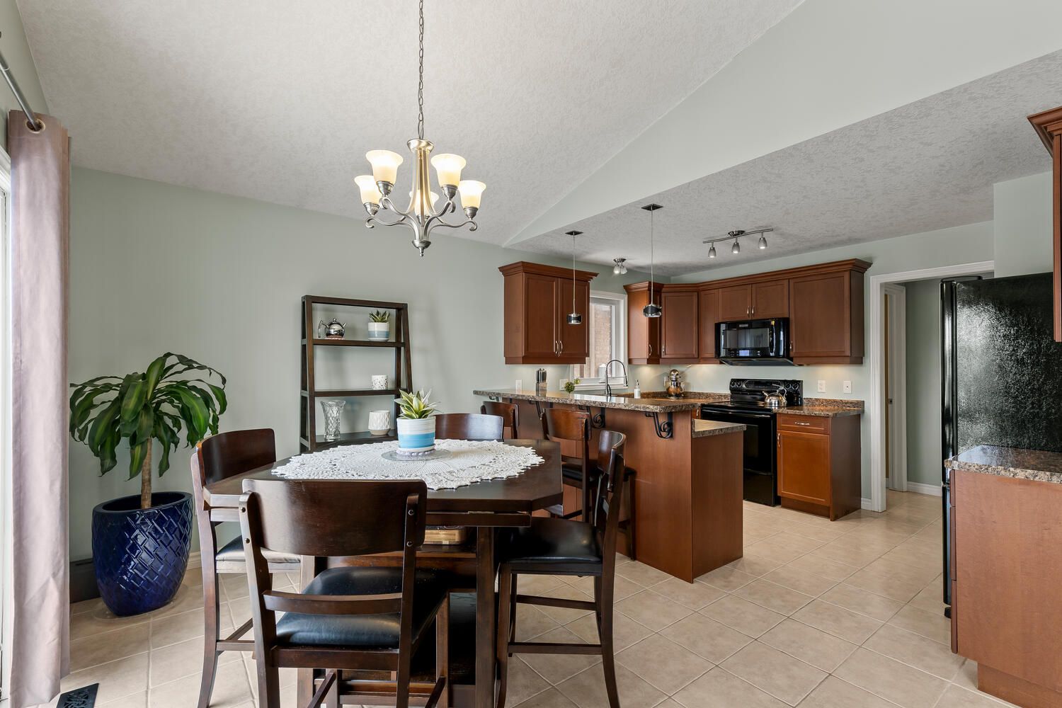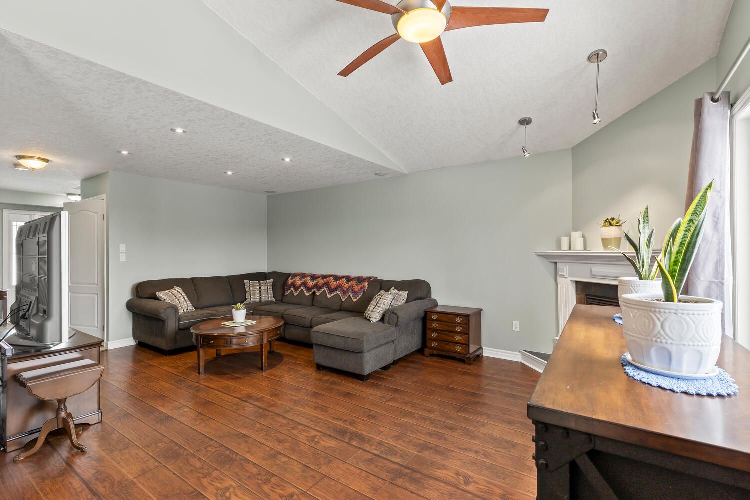 • Open concept main floor with vaulted ceilings and gas fireplace.