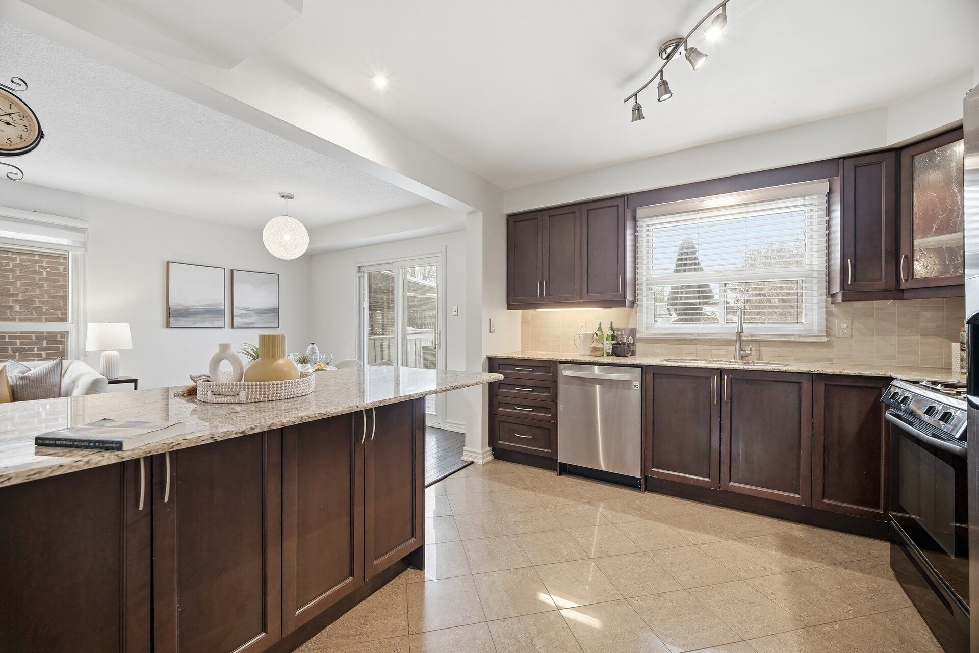 • Renovated kitchen features granite counters and breakfast bar.