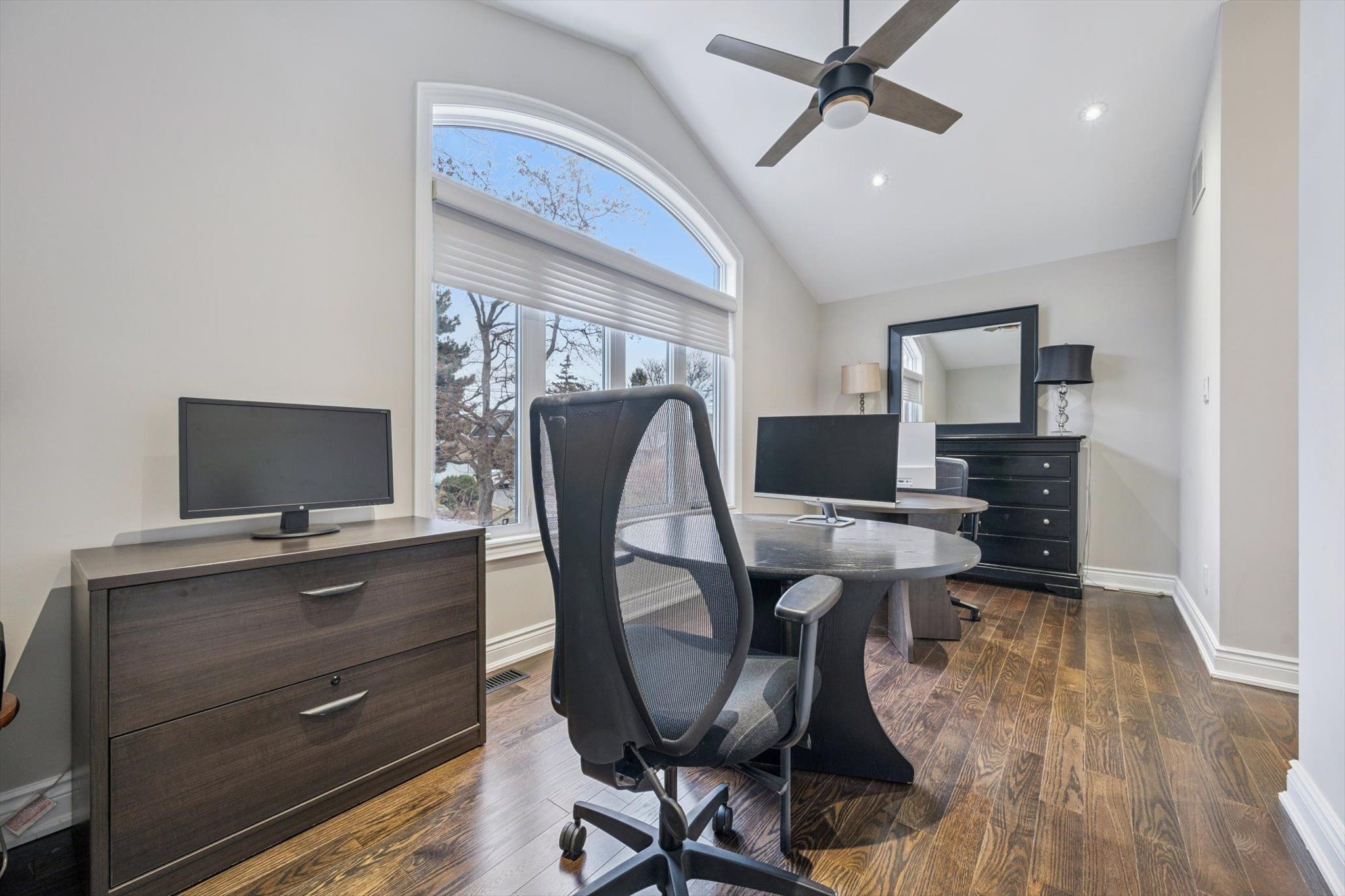 The ultimate in privacy! Backing onto morrison valley south! A rare offering, this stunning and beautifully updated four bedroom executive home is situated on a spectacular 150' deep lot (approx. 0. 26 acres) and delivers an unmatched blend of luxury, comfort, and serenity. Designed for entertaining and everyday family living, the main level welcomes you with rich hardwood flooring. An elegant living room with an expansive picture window is open to the dining area, while the inviting family room - complete with a gas fireplace framed by custom cabinetry - provides the perfect spot to unwind. The contemporary kitchen is a showpiece, featuring quartz countertops, s/s appliances, and a large island with breakfast bar ideal for casual meals and gathering. Upstairs, the primary retreat exudes sophistication with its vaulted ceiling, gas fireplace, built-in bookcase, walk-in closet, private siting area, and spa-inspired five-piece ensuite with double sinks. Three additional bedrooms, a convenient laundry room, and luxurious five-piece main bath complete this well-appointed level. The professionally finished walk-up lower level enhances the home's versatility. Enjoy a spacious theatre room, dedicated gym, powder room, and abundant storage. Step outside into your incredibly private backyard oasis - a true extension of your living space. Highlights include a raised deck, heated inground pool with a waterfall feature and newer liner (2024) surrounded by an interlock stone patio, a four-person hot tub, and plenty of space for outdoor lounging and play. Situated in the heart of oakville, this exceptional property offers unmatched convenience with close proximity to parks and trails, falgarwood public school, sheridan college, shopping centres, and oakville place. Commuters will appreciate easy access to public transit, major highways, and the go station. A remarkable opportunity to own a private retreat in a premier location! (certain images have been digitally enhanced)