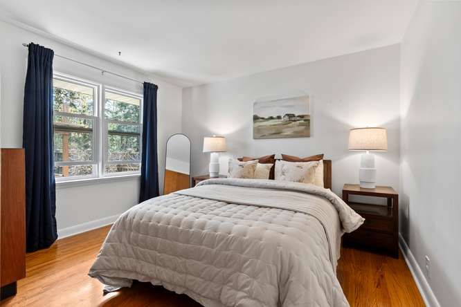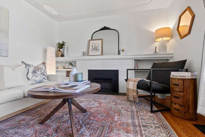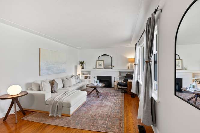 • Spacious living room with a large front window and a fireplace.