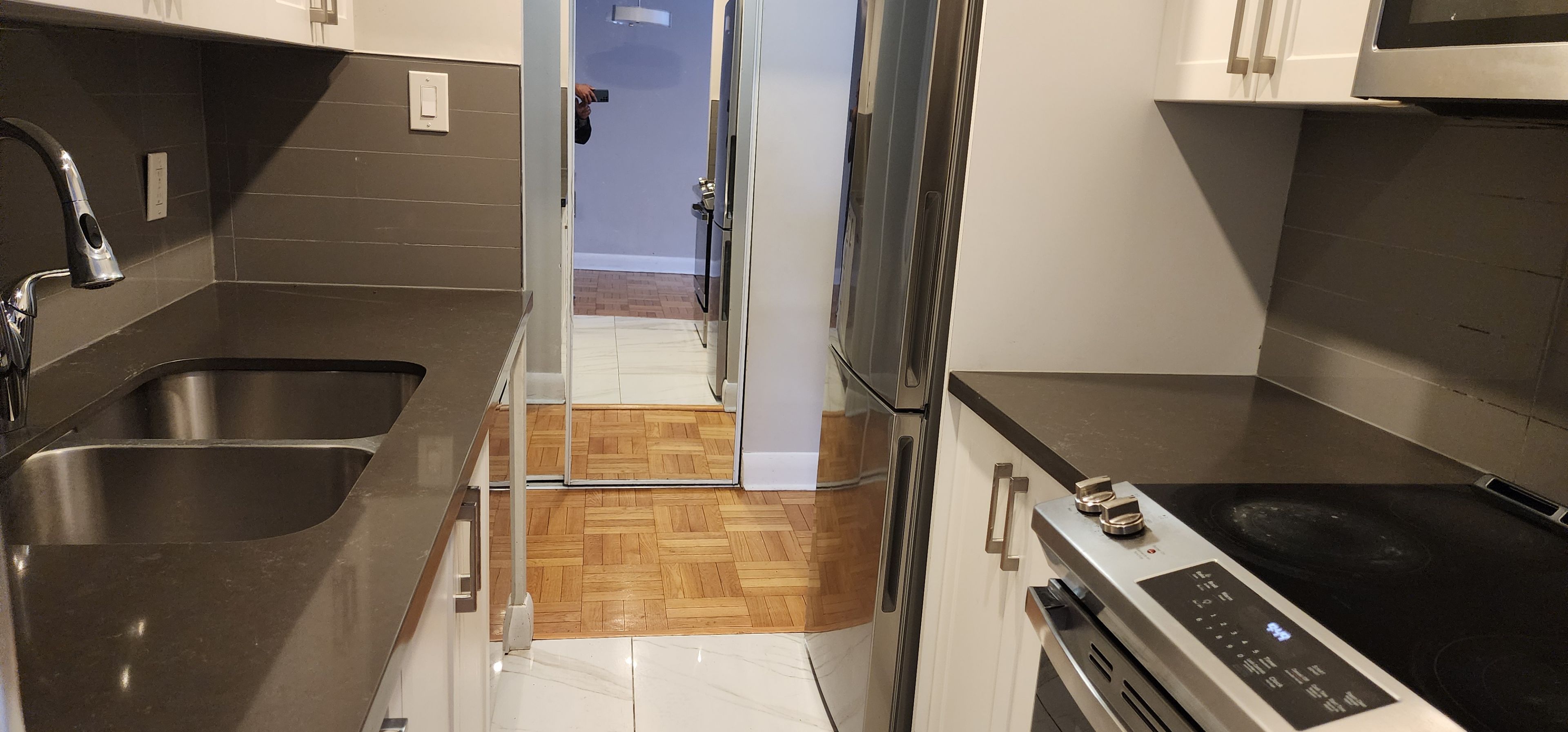• Modern kitchen features quartz countertops and excellent storage.