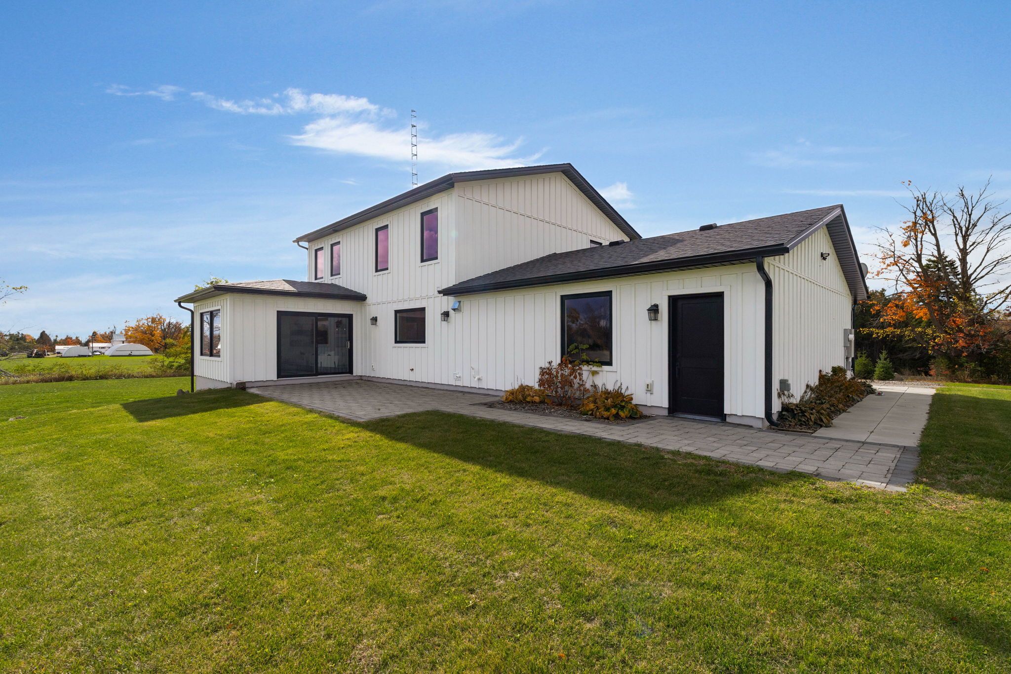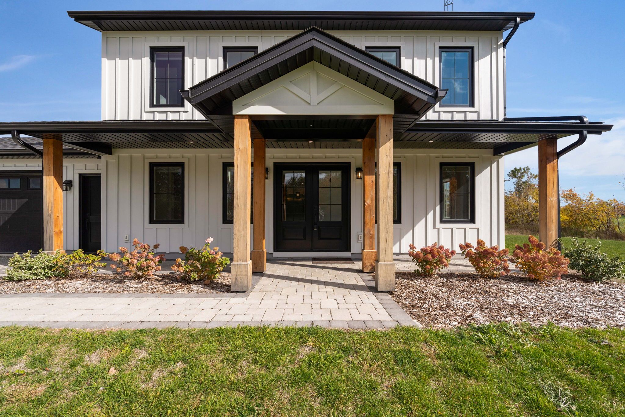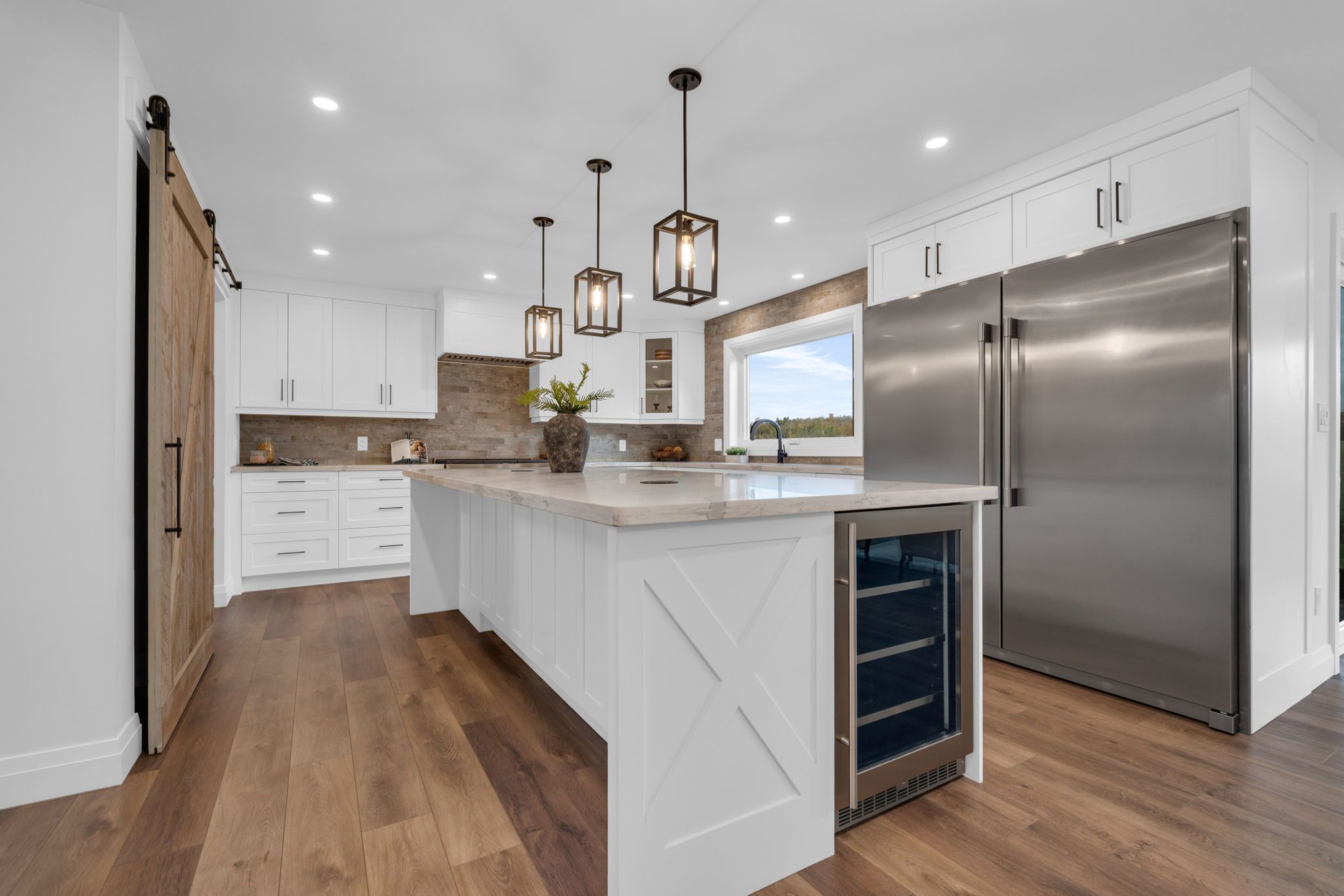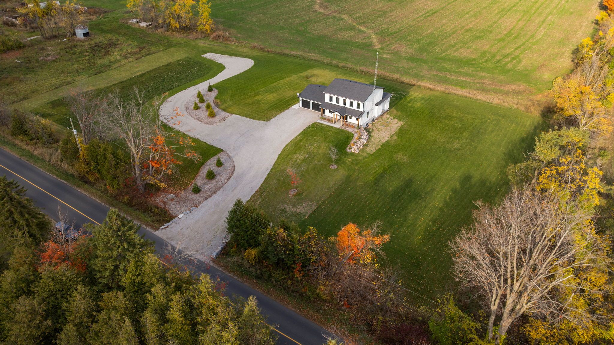 Nestled on 2 private acres, this stunning two-year-old custom-built modern farmhouse offers 2,800 sq. Ft. Of beautifully finished living space with 4+1 bedrooms and 3 +1 bathrooms. Step inside to soaring ceilings and expansive windows that flood the home with natural light and showcase breathtaking sunrises and sunsets. The chef's kitchen is a true showpiece, featuring a gas range, quartz countertops, built-in wine cooler, panel dishwasher, wireless charging stations in the island, and a charming built-in coffee bar. The open-concept living area boasts a cozy gas fireplace with a stone surround and flows effortlessly to the outdoor living space through oversized patio doors-perfect for entertaining or quiet evenings under the stars. Enjoy plenty of functional design in the mudroom and main-floor laundry, offering abundant storage and convenient access from the garage. A main-floor guest suite with a full 3-piece ensuite provides privacy and comfort for visitors. Upstairs, you'll find two primary bedrooms, each with their own private vanity rooms, plus a third room ideal for a home office or additional bedroom. The fully finished lower level, with 9-ft ceilings, is perfectly designed for multi-generational living. It features a spacious bonus room, striking custom bar with reclaimed barn board, an additional bedroom, bathroom, laundry hookups and a separate private entrance from the garage. Only two years old, this exceptional custom-built home combines modern luxury, functionality, and the quite peace of country living with quick access to hwy 11 for convenience. This is more than a property, this is a forever home.