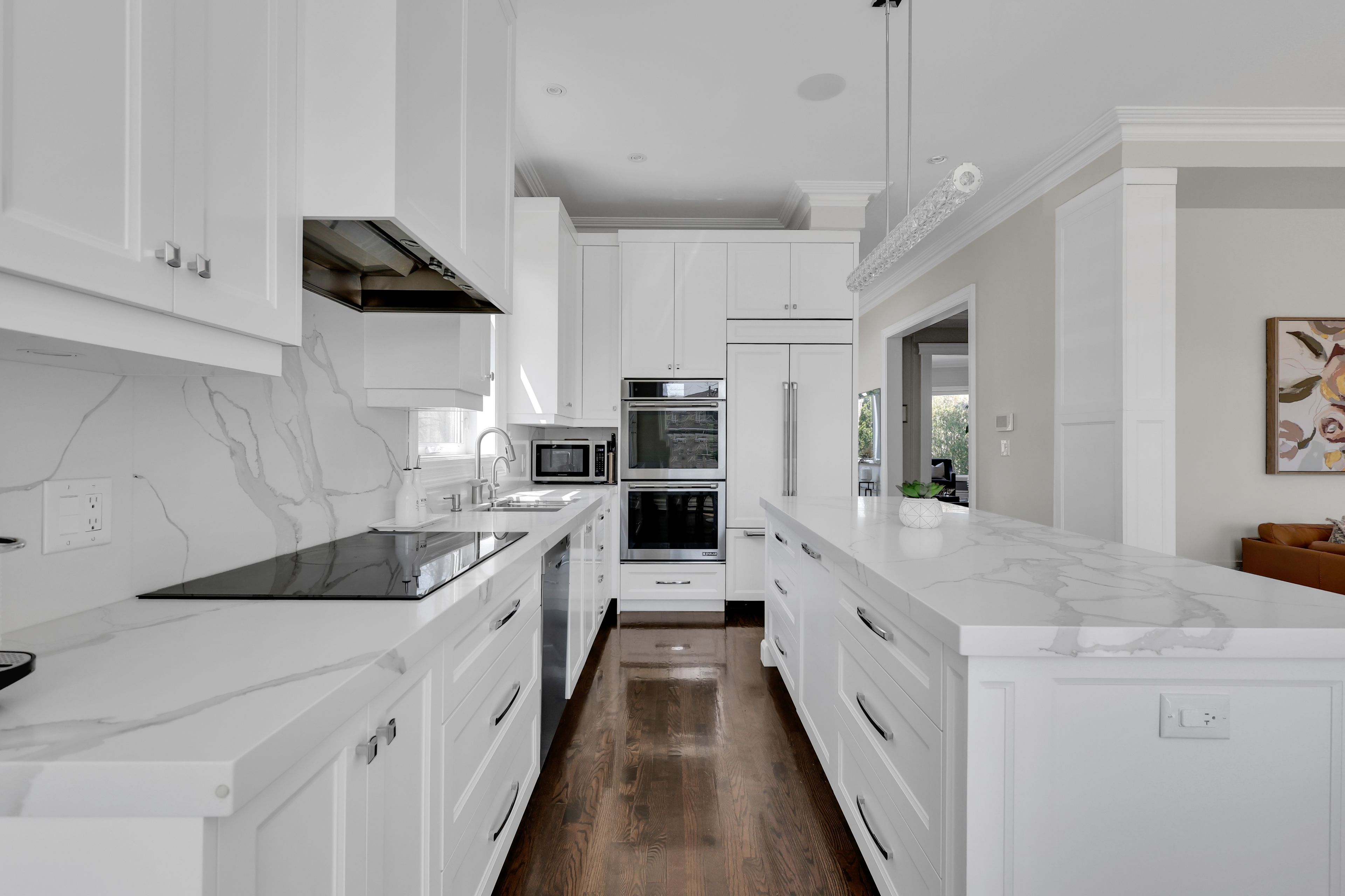 • Refined eat-in kitchen featuring a large center island and breakfast area.