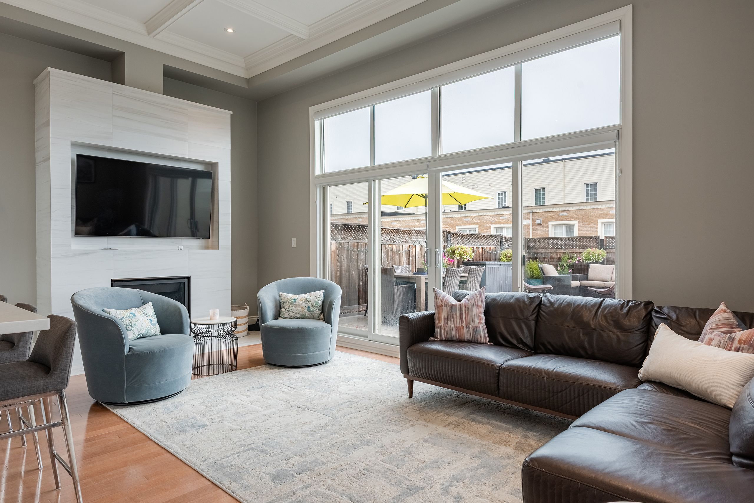 Welcome to village west a boutique enclave of upscale freehold townhomes set in oakvilles downtown core. This rare end-unit feels more like a new york loft than a traditional townhouse. With soaring 12-foot ceilings and loaded with huge windows throughout, the interior is defined by its sense of volume, openness, and sunlight. Where every room feels generous in scale and effortlessly connected. From the moment you step inside, youll notice the proportions: expansive principal rooms, wide hallways, tall door thresholds, and wide staircases with oversized landings. The dining room is truly grand, while the adjoining kitchen and family room are framed by a dramatic, sky-high coffered ceiling. The kitchen has been fully renovated, featuring high-end appliances, sleek finishes, and a layout designed for both everyday living and entertaining. Hardwood flooring runs throughout the home, complemented by two fireplaces and the convenience of a private elevator to every level. The double-car garage is oversized, providing not only secure parking but also ample room for storage. On the main level, a flexible office/sitting room overlooks the landscaped front and side gardens, where mature plantings and trees create privacy and a lush green outlook. On the third level, two very large bedrooms, each with its own ensuite, are generously proportioned making them a flexible space for various needs. The outdoor living is equally impressive. A 650 sq ft south-facing terrace offers a private retreat with enough room to entertain on a large scale or simply unwind in peace. The lower level extends the living space even further, perfect for a home gym, office, media room, or whatever suits your needs best. Village west is as practical as it is refined. This enclave is beautifully maintained, with a welcoming atmosphere and neighbours who take pride in their homes. All this and just steps to downtown oakvilles shops, dining and the lakefront parks that make this location so desirable.