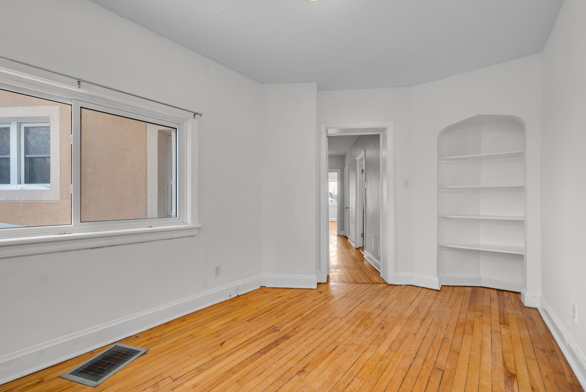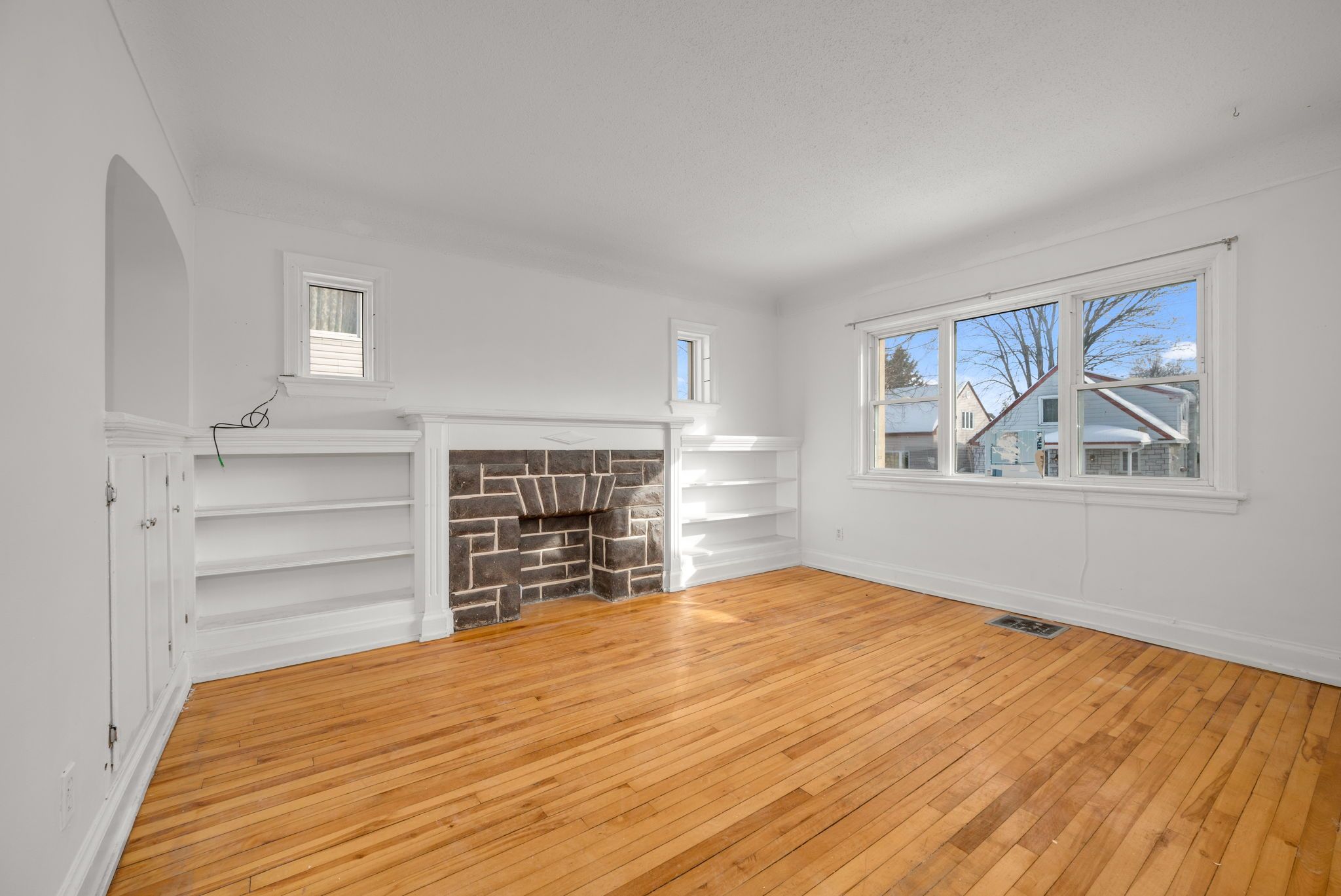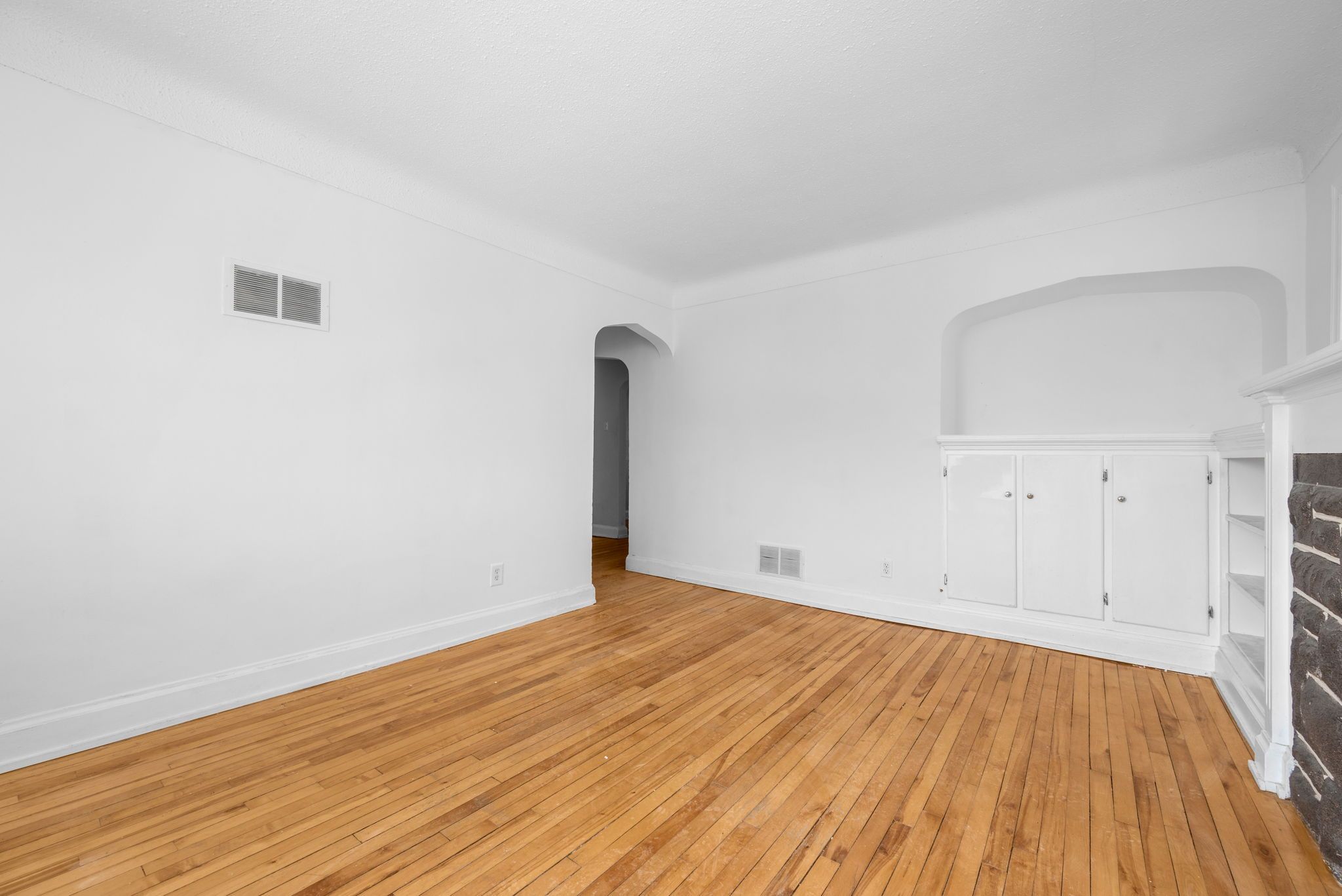 • Original hardwood floors and decorative fireplace add character to the living area.