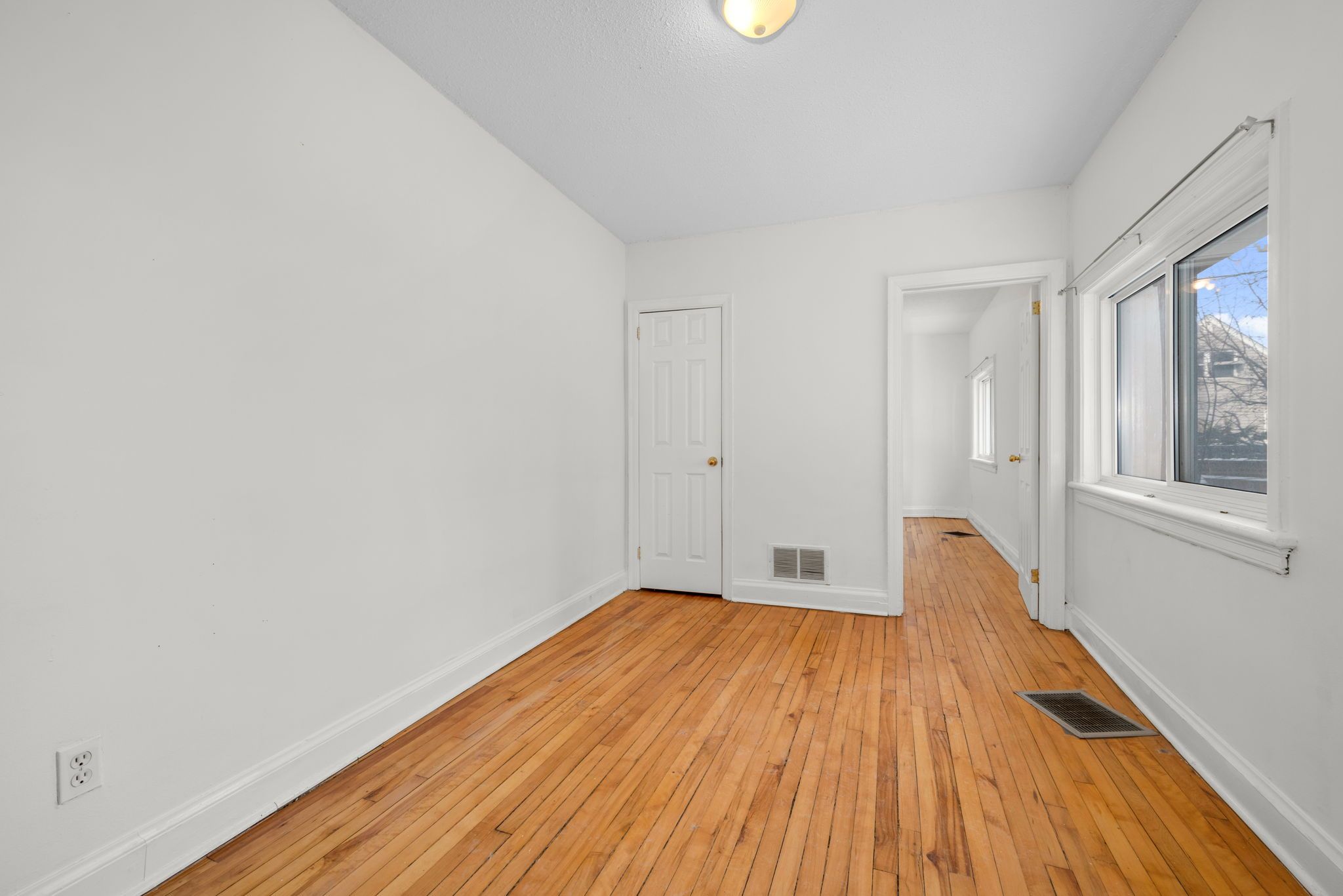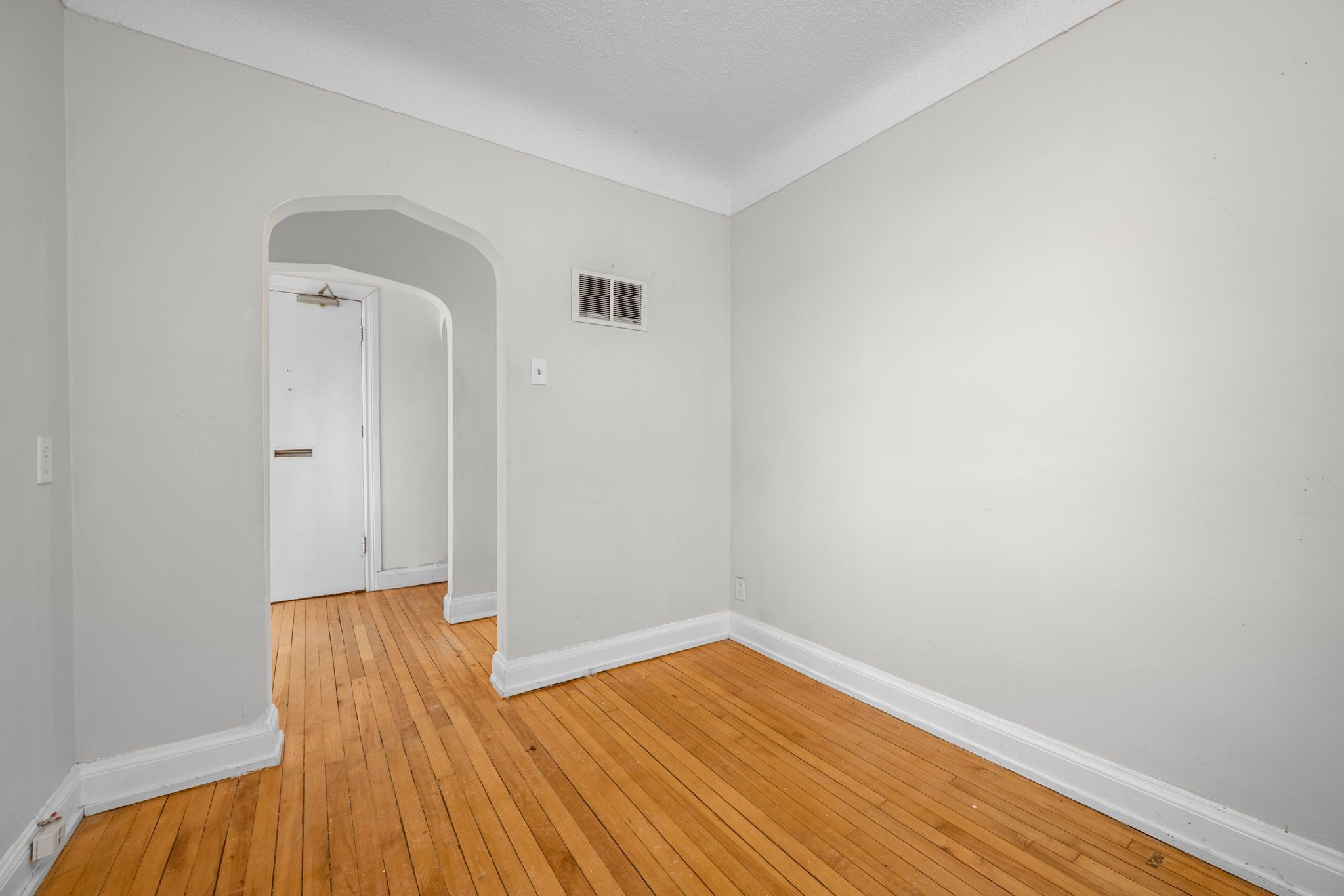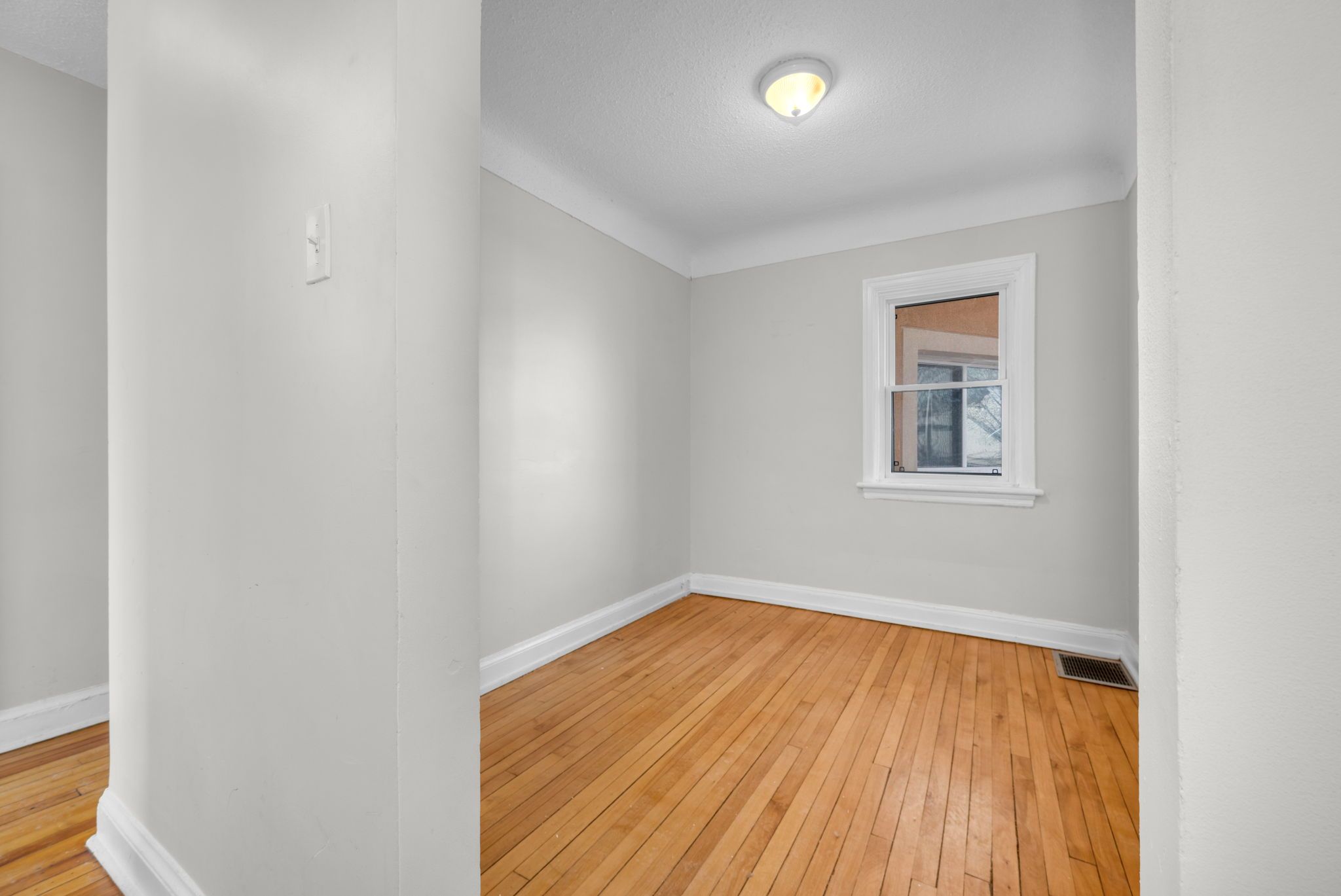 • Original hardwood floors and decorative fireplace add character to the living area.