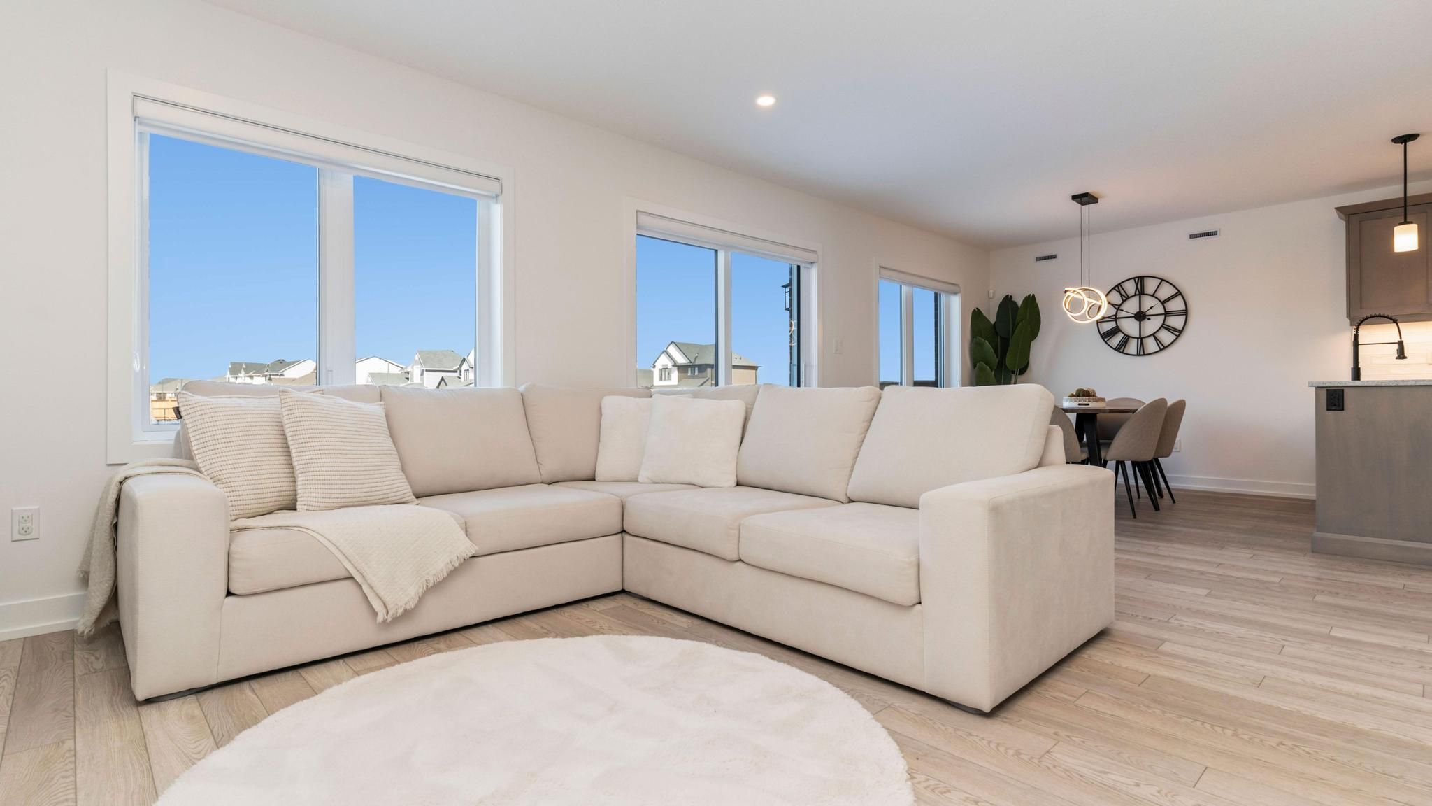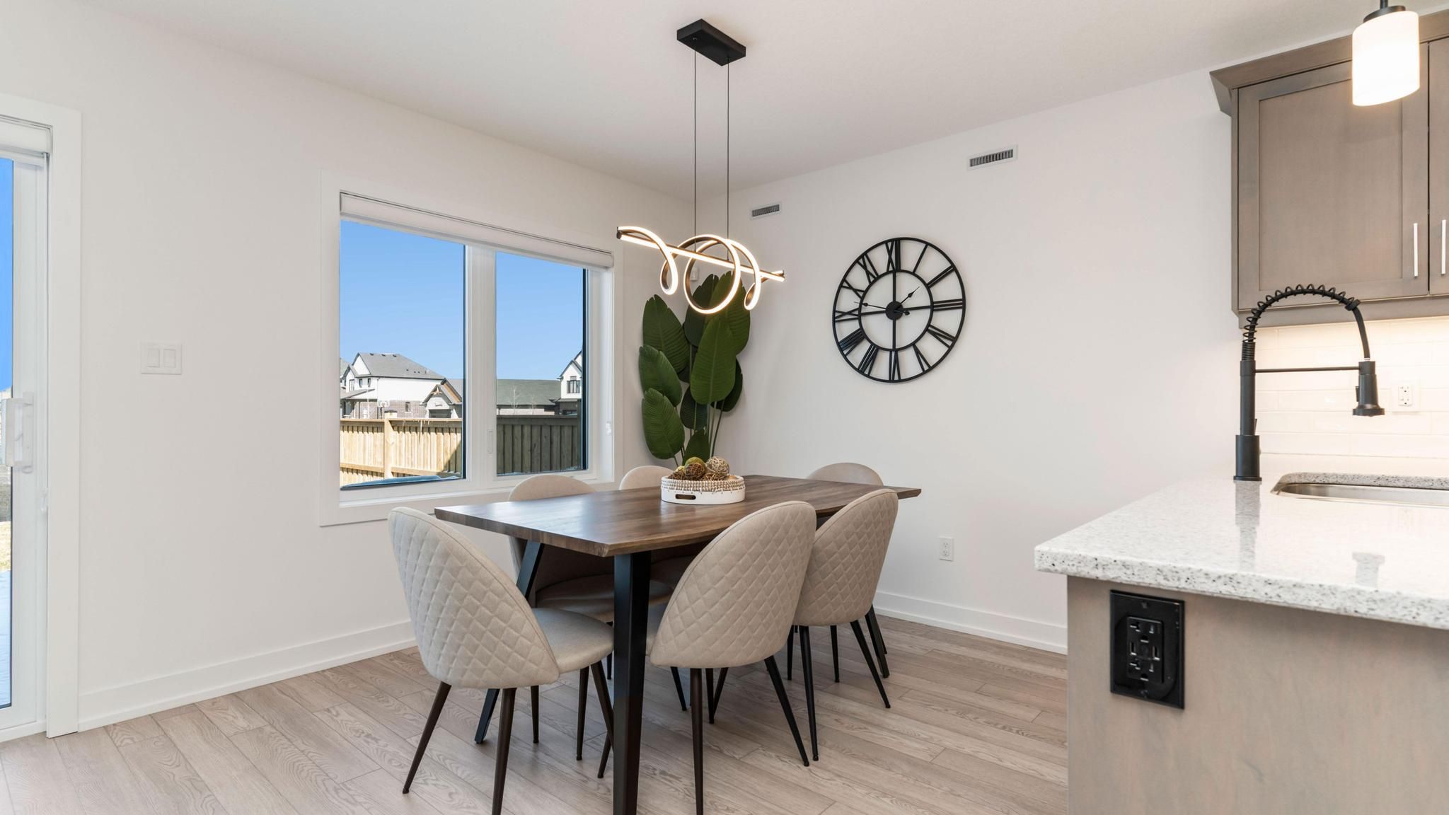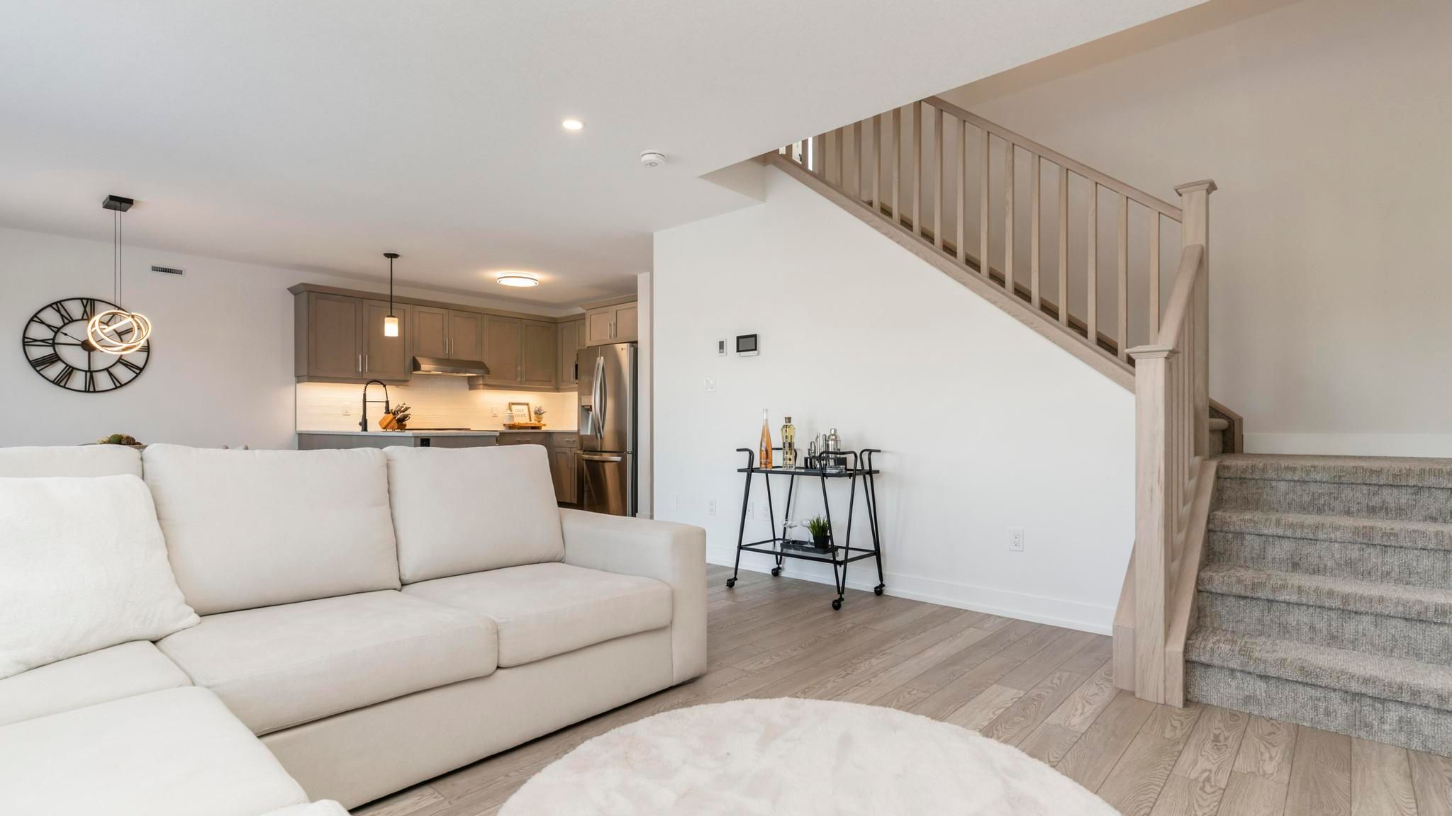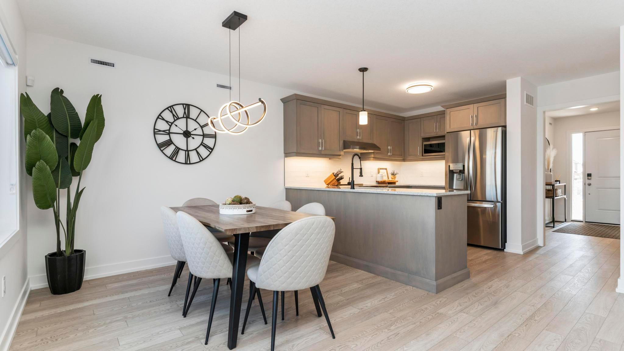 • Modern kitchen features quartz counters and a stylish tiled backsplash.